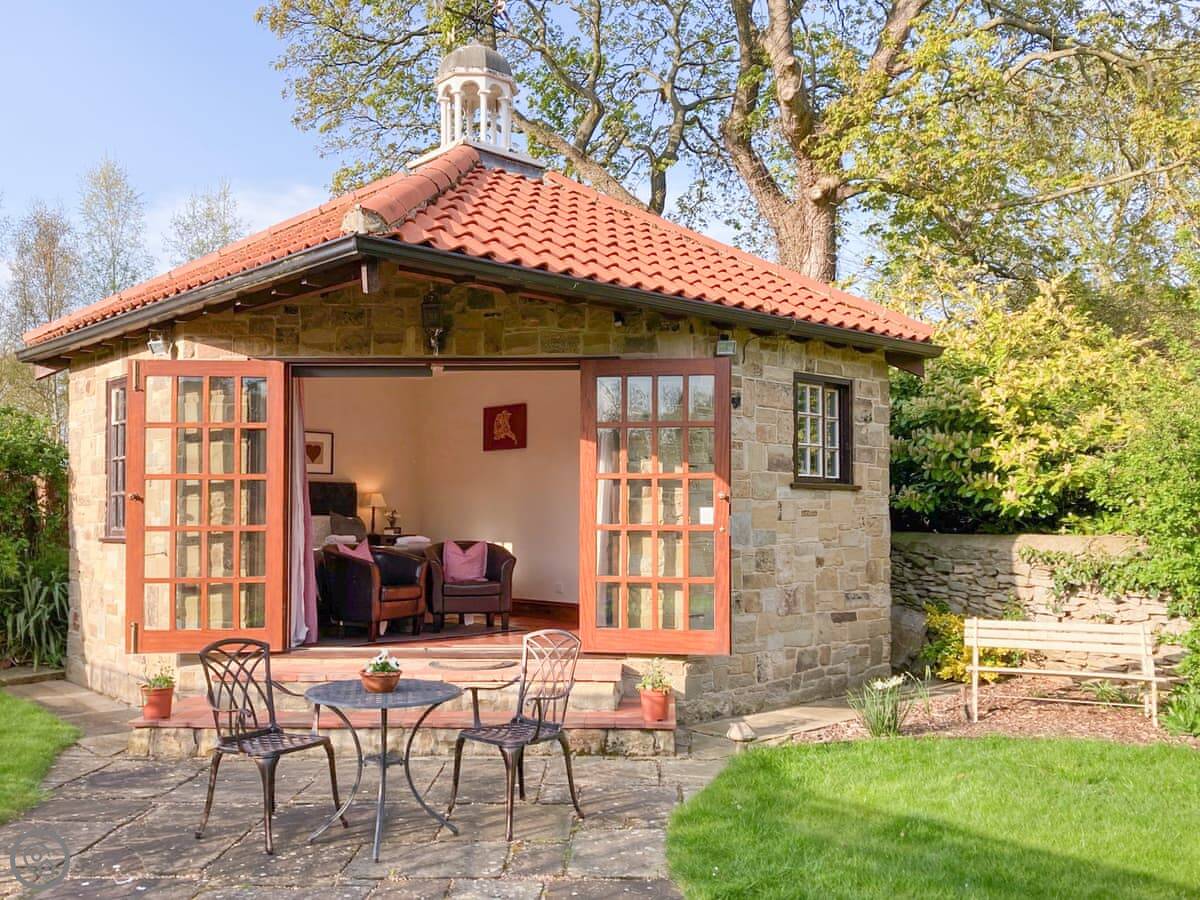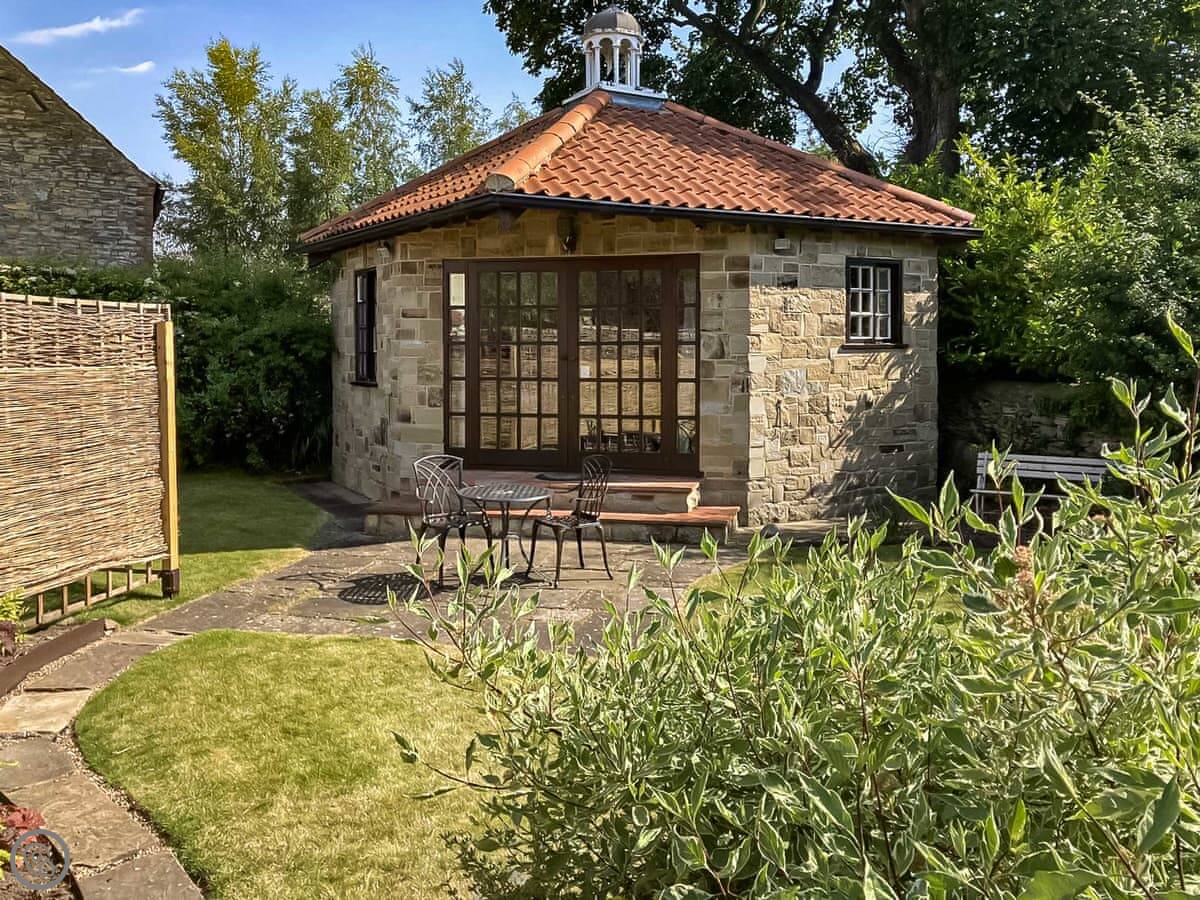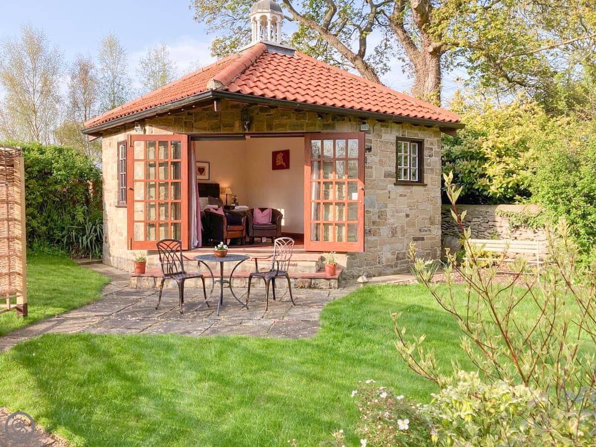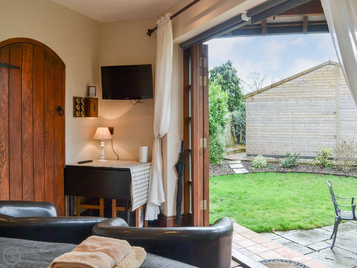There are two steps up to get inside. The main doors are French doors which open straight out onto your own enclosed garden area. It's private out there, good for a coffee in the morning.