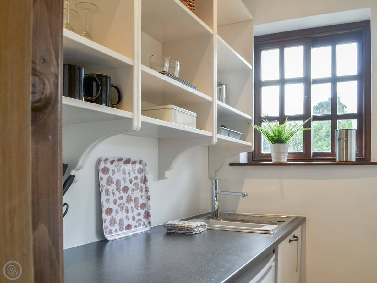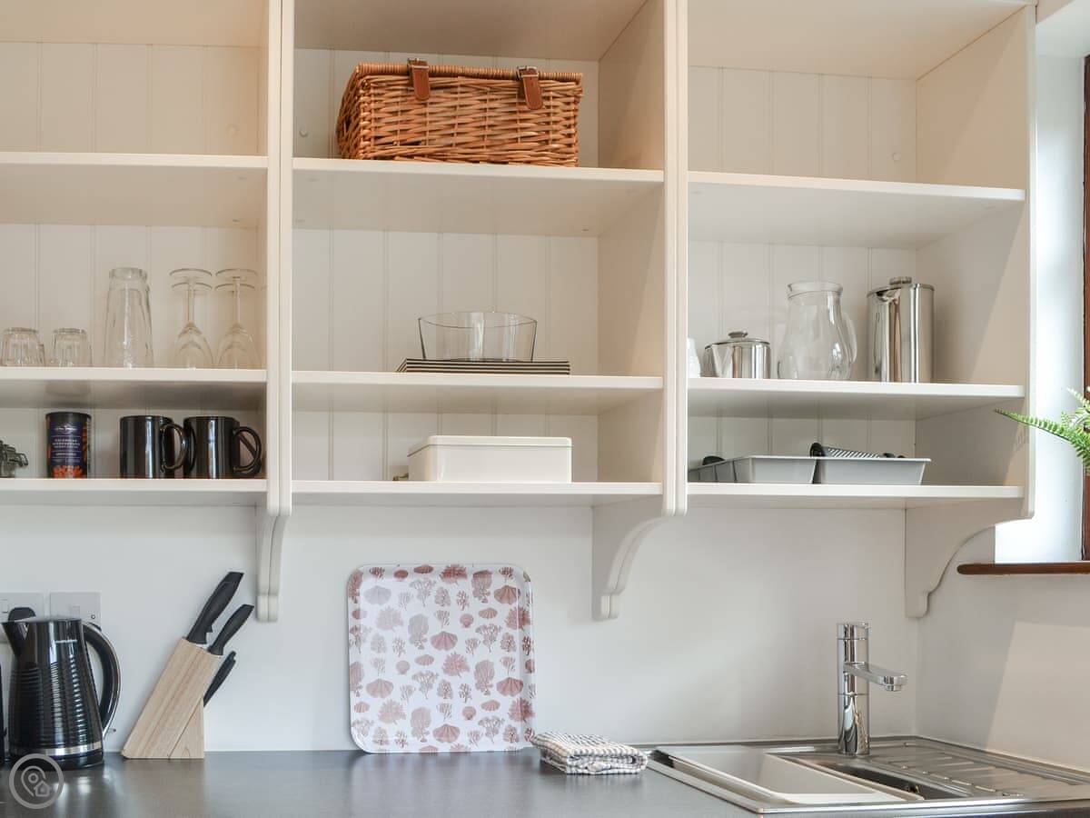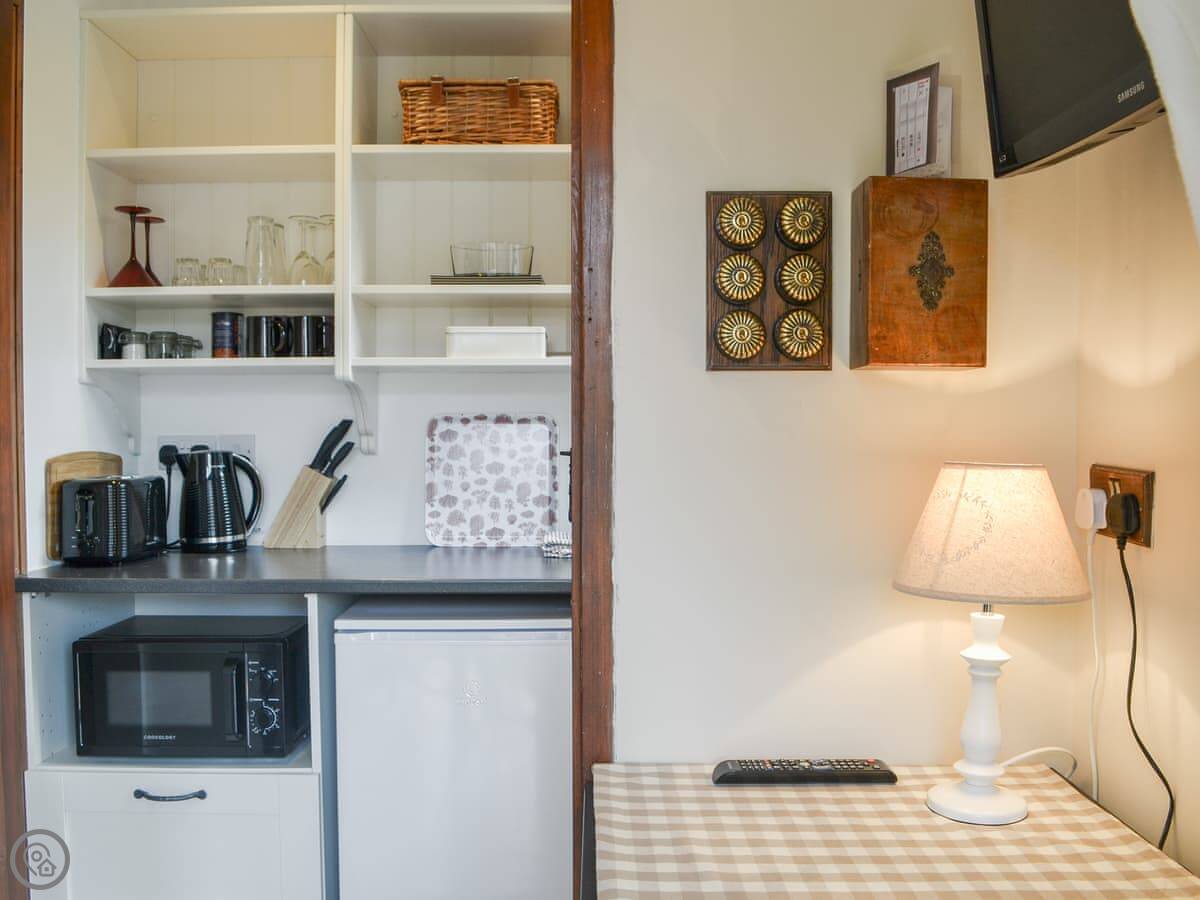 The kitchen is small, as you'd expect. It has a fridge, a hob, an oven, and a microwave. Enough to make a meal. There's a Freeview TV and WiFi.