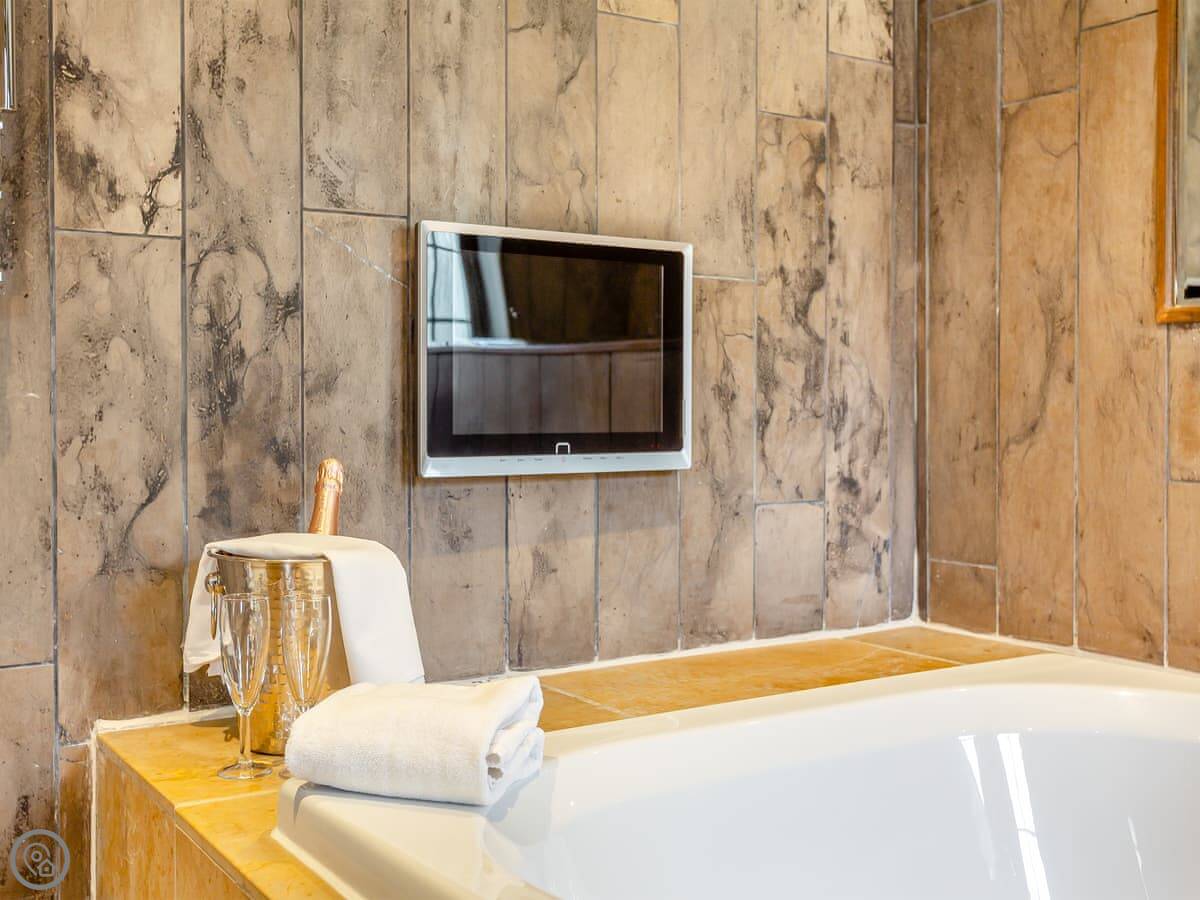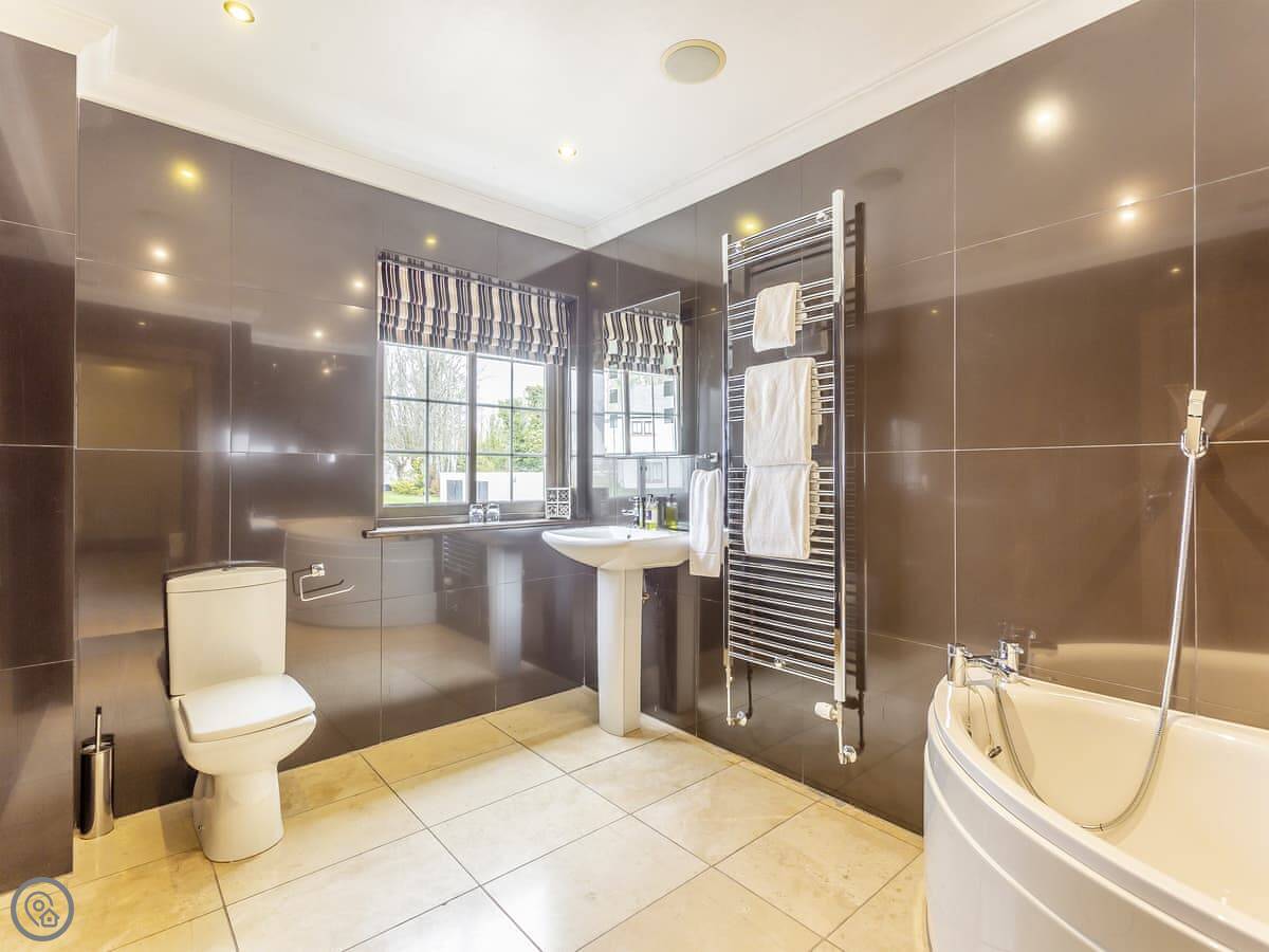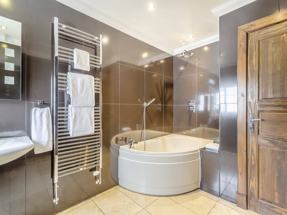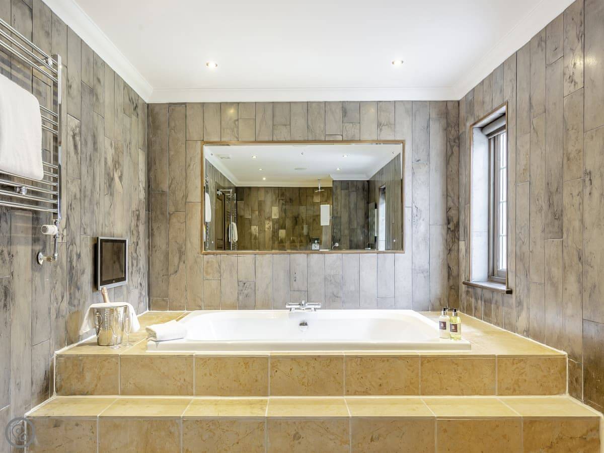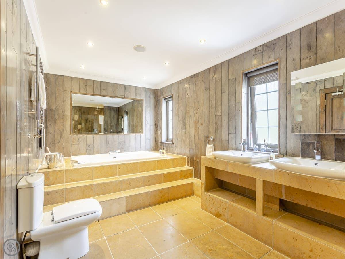 Sleeps nine, in five bedrooms. Four bathrooms, so that helps with a group. Two bedrooms share a big bathroom upstairs. That one has a sunken bath with a TV in the wall, honestly. It's a thing. The other bedrooms have their own en-suites. One of them, called Bling Bling, has a day bed so it can sleep three.