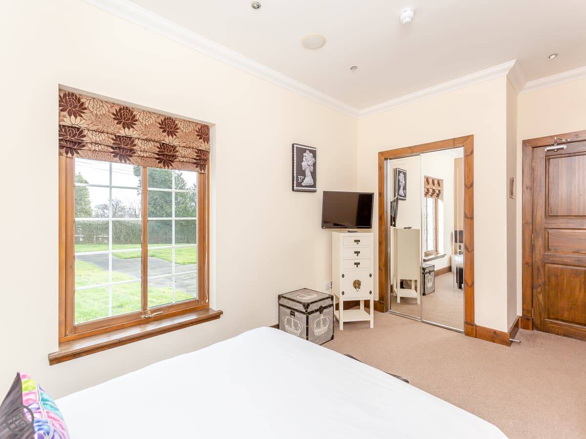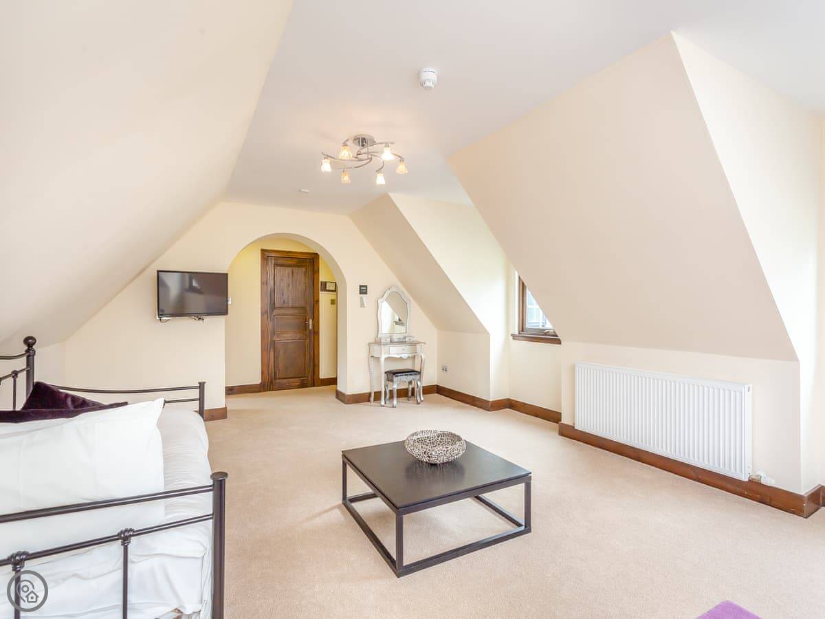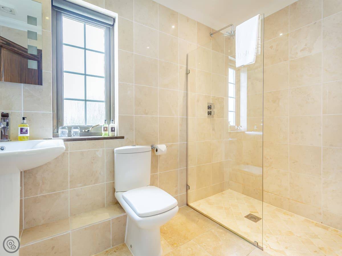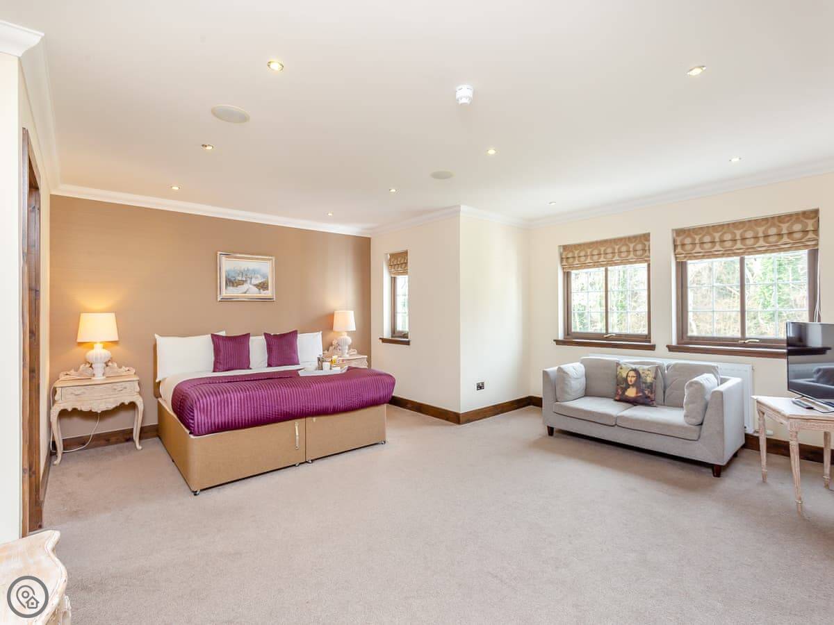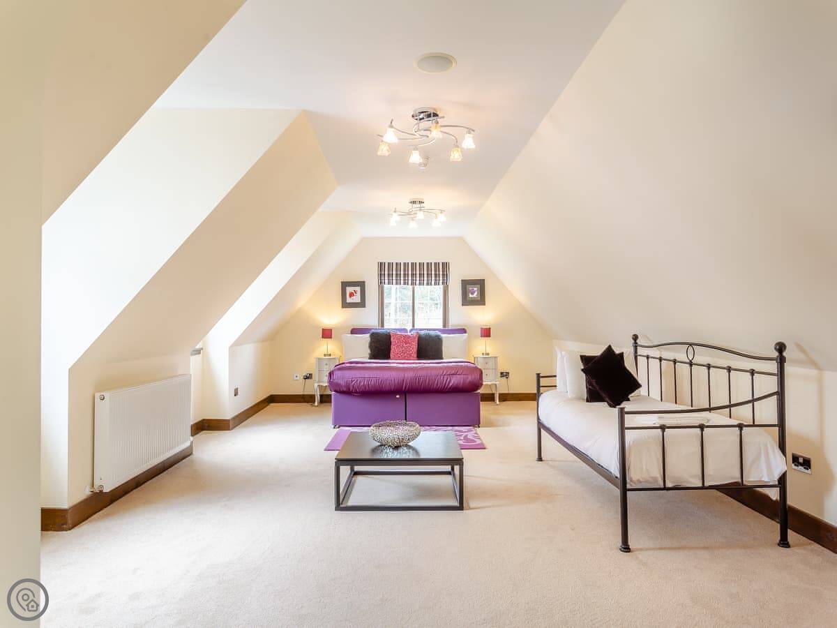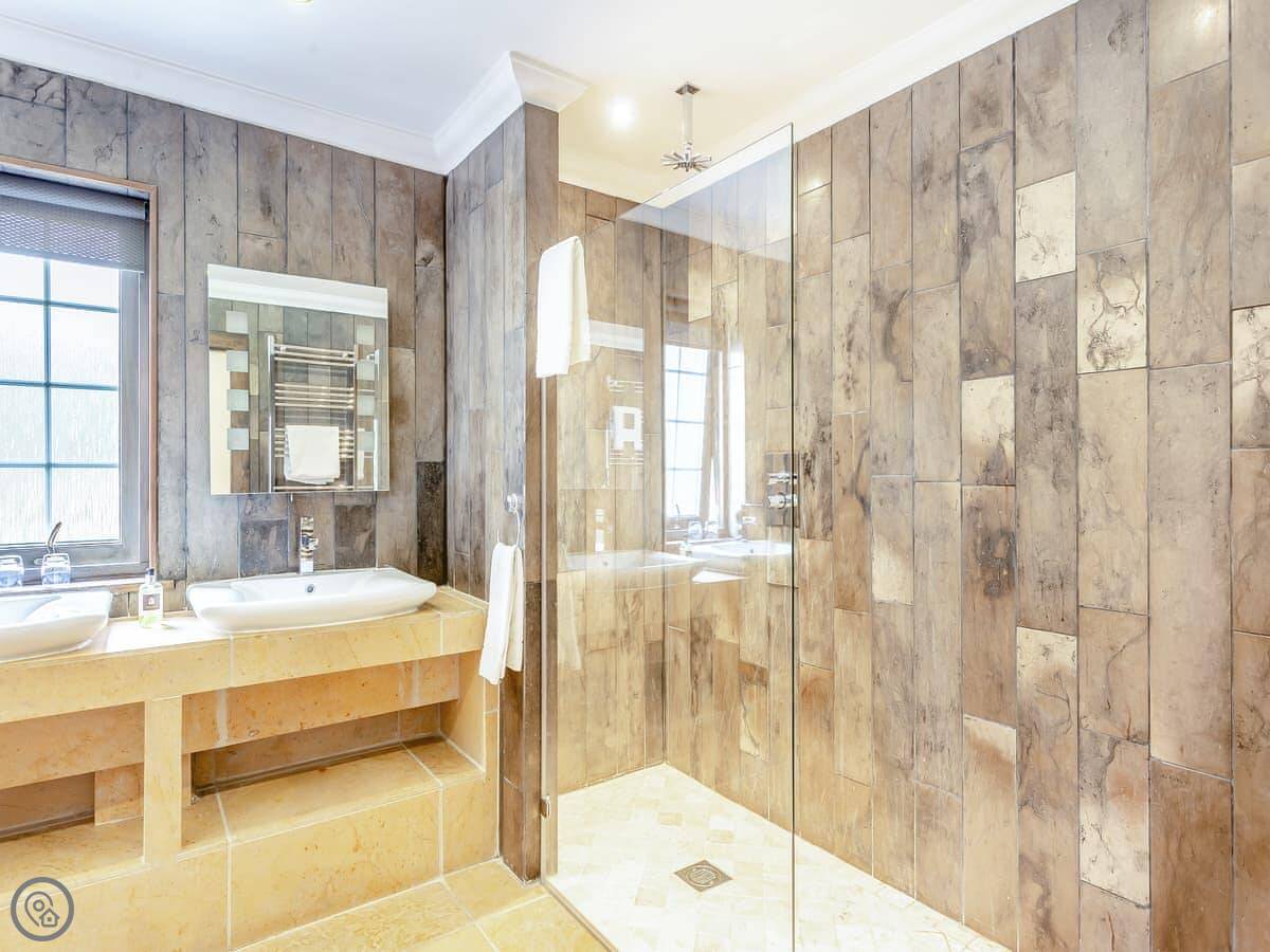 Sleeps nine, in five bedrooms. Four bathrooms, so that helps with a group. Two bedrooms share a big bathroom upstairs. That one has a sunken bath with a TV in the wall, honestly. It's a thing. The other bedrooms have their own en-suites. One of them, called Bling Bling, has a day bed so it can sleep three.
