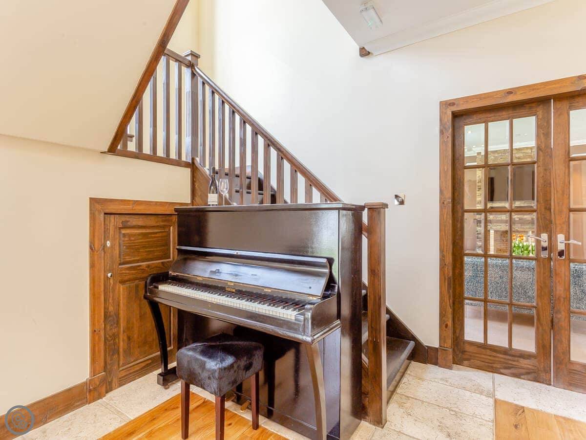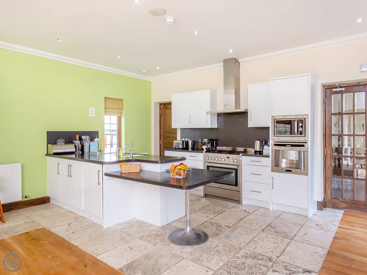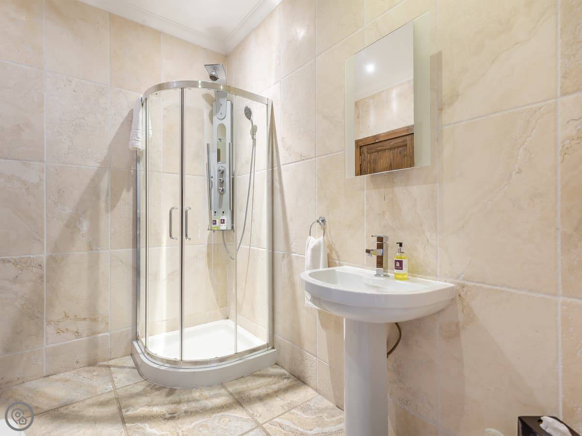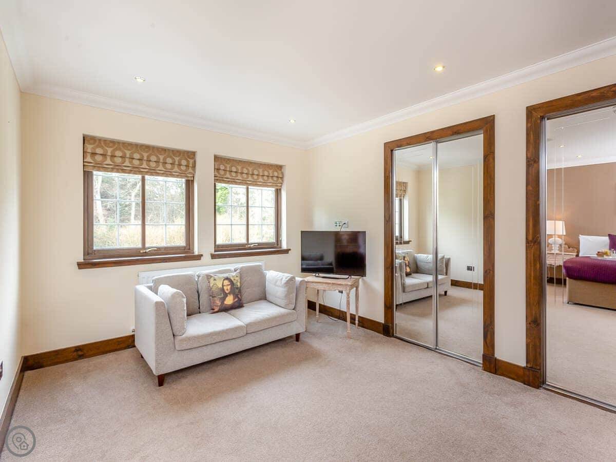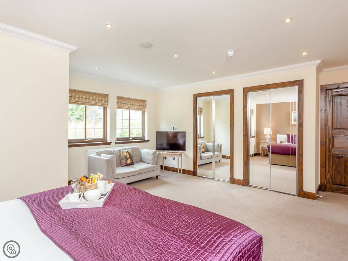 Sleeps nine, in five bedrooms. Four bathrooms, so that helps with a group. Two bedrooms share a big bathroom upstairs. That one has a sunken bath with a TV in the wall, honestly. It's a thing. The other bedrooms have their own en-suites. One of them, called Bling Bling, has a day bed so it can sleep three.