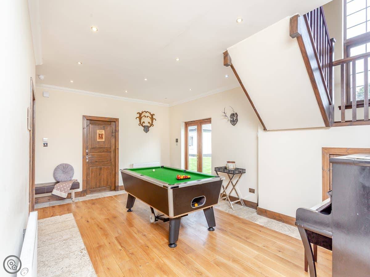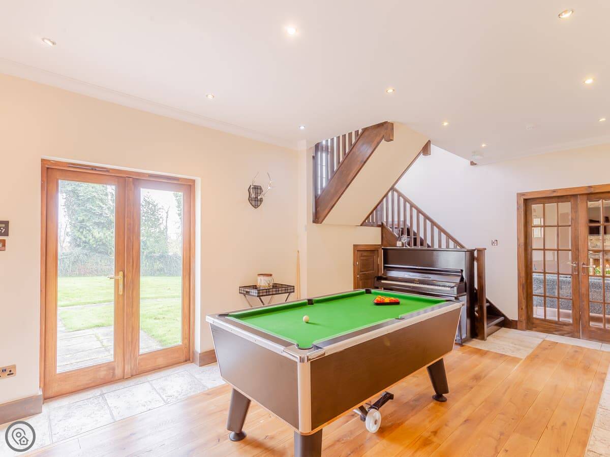 Inside downstairs, there's a decent sized living room with a big TV and a fireplace. The kitchen has a table everyone can fit around. Off the main hall there's a pool table. It's right there when you walk in.
