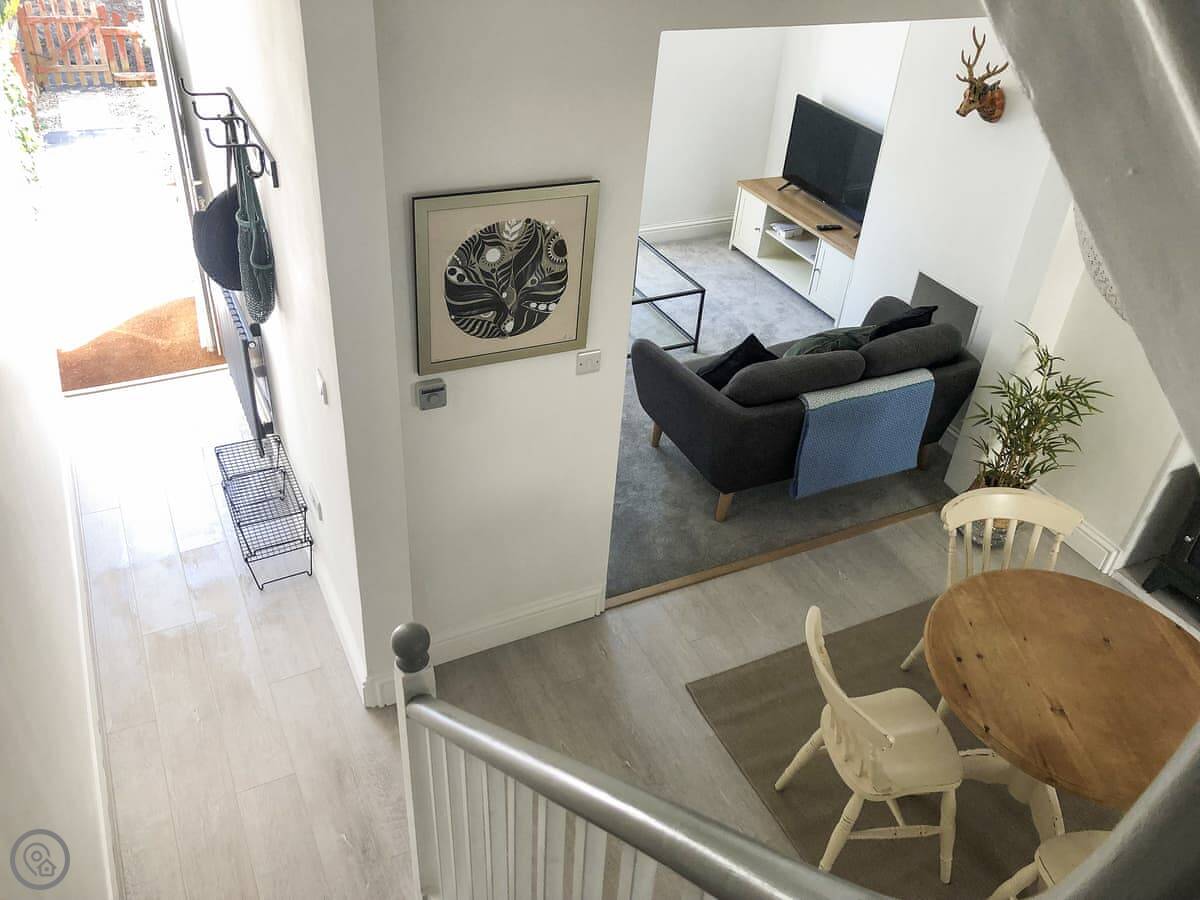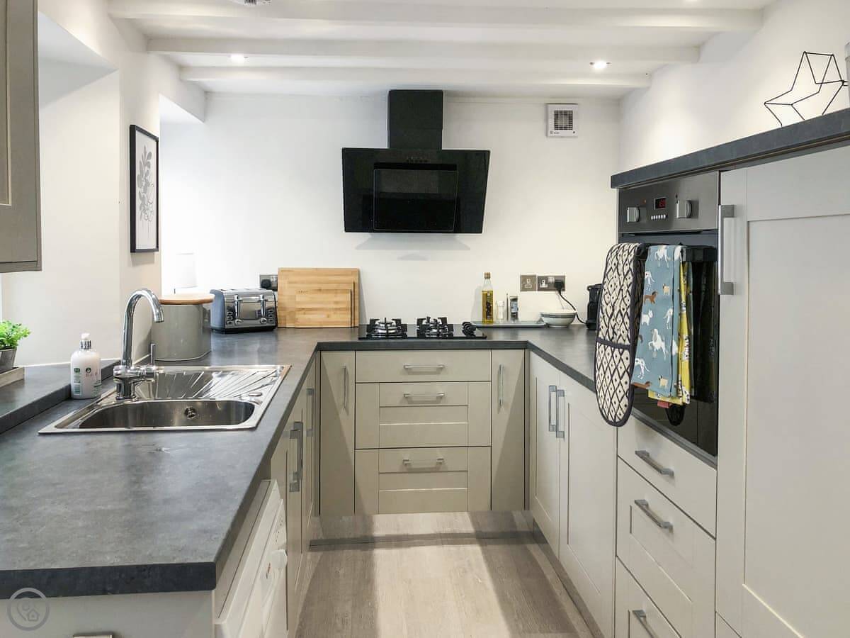 Inside, it's all open plan downstairs. The kitchen has what you need, and there's a utility porch out the back. Useful for muddy boots or putting bikes. The stairs are a standard steepness.
