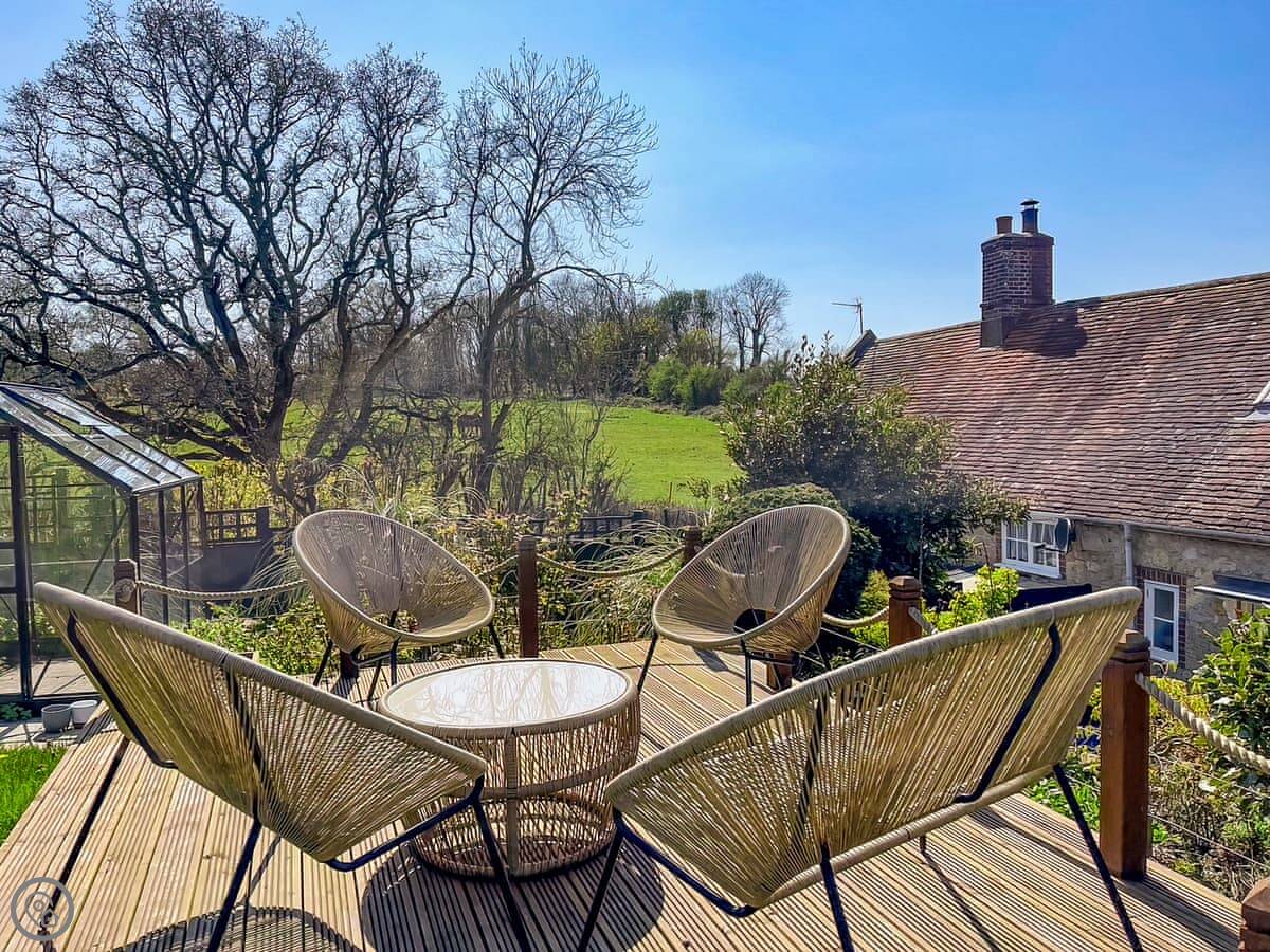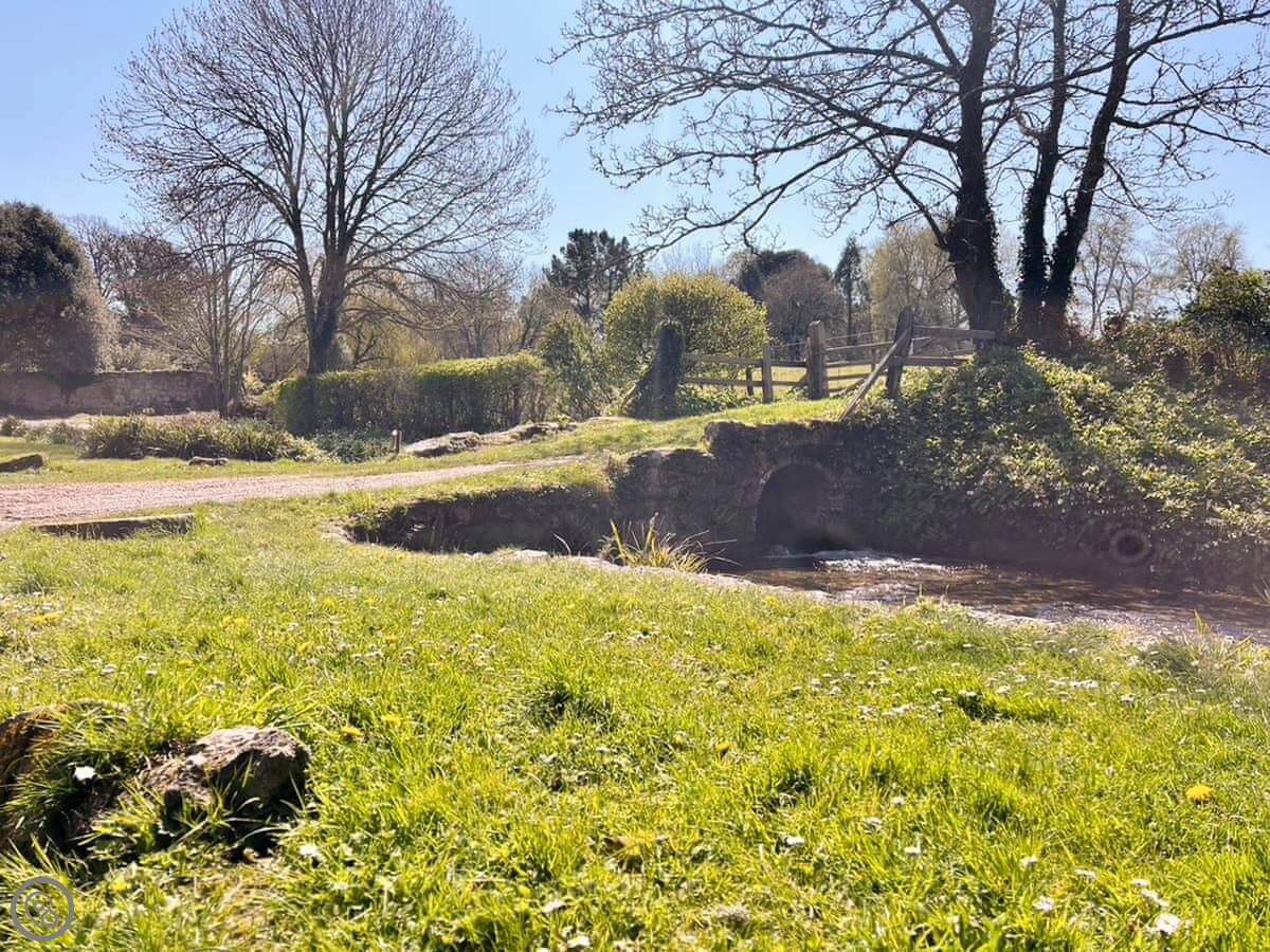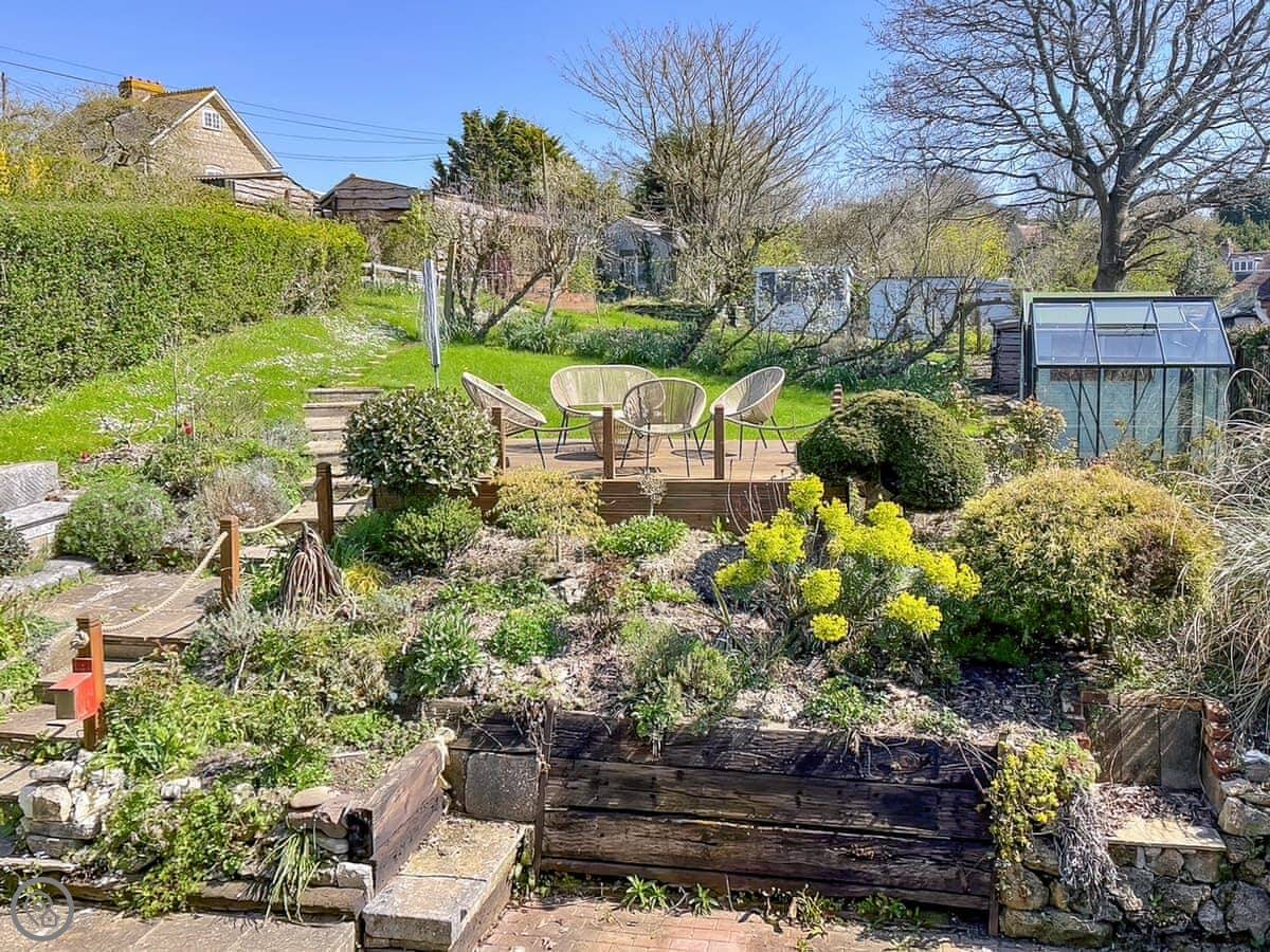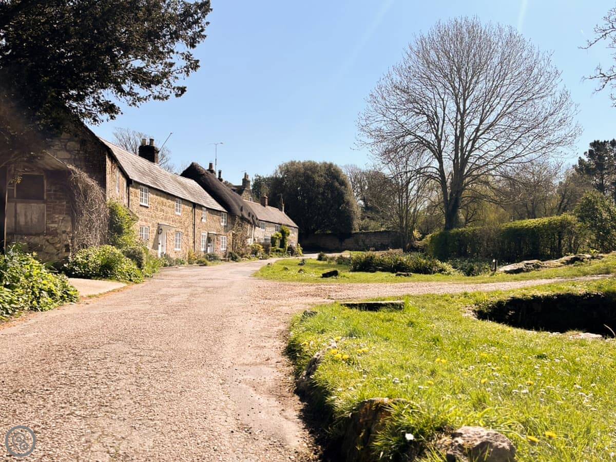 Honey Bee Cottage is in Calbourne. It's part of a little row of old estate cottages on Winkle Street. The garden is big and private. It looks out onto a stream.