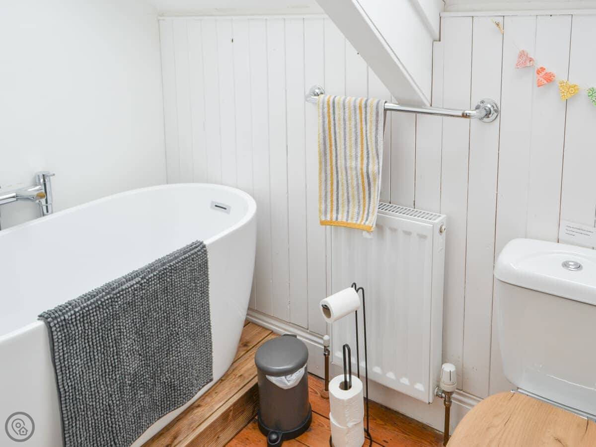 Bea’s Cottage is in the heart of Cresswell village located in a prime position a stone’s throw from the sea! Originally a fisherman’s cottage the owners have restored the cottage which oozes character and charm and reflects some of the original features which have been brought back to life. With original beams and a wonderful inglenook fireplace housing the cosy large wood burner on the ground floor provides a warm, relaxing, and homely place to relax and unwind. The living room is large and spacious with beautiful views from the front window out across the field to Pele tower, an old medieval tower, recently decorated with beautiful views from the top! The living room opens directly into the kitchen/dining room. The kitchen has a large old table to sit around and enjoy some home cooked breakfasts or lunches. Upstairs is three bedrooms and a family bathroom with a freestanding deep bath. French doors at the back of the kitchen take you out into a small patio area.