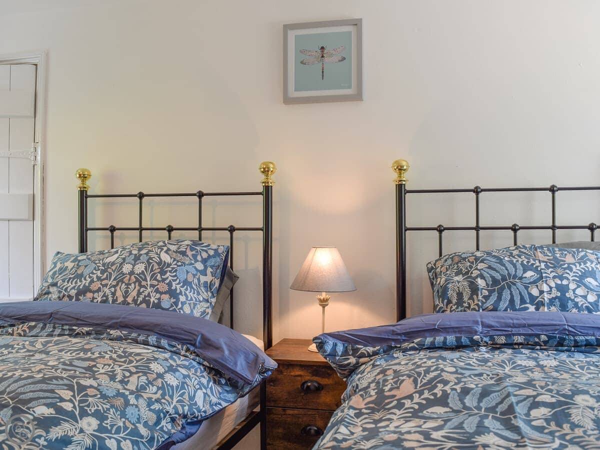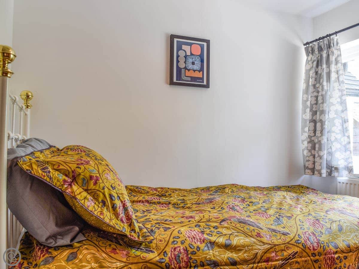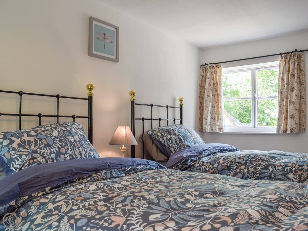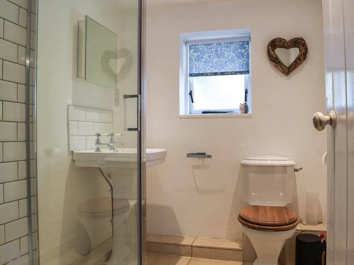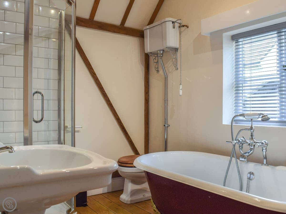 It sleeps five. There are three bedrooms and three bathrooms. One bathroom is an en-suite with a roll-top bath and a separate shower. The other two are shower rooms.