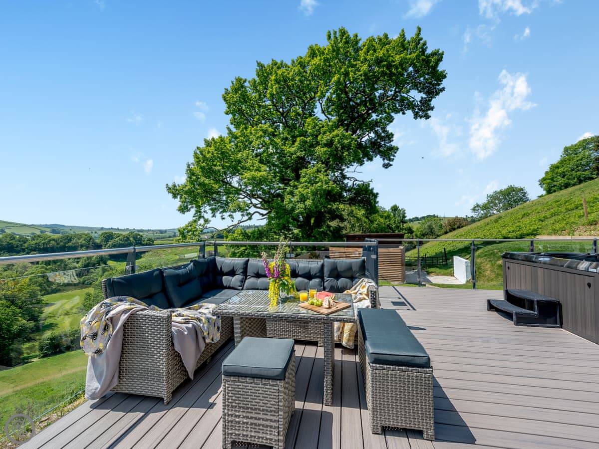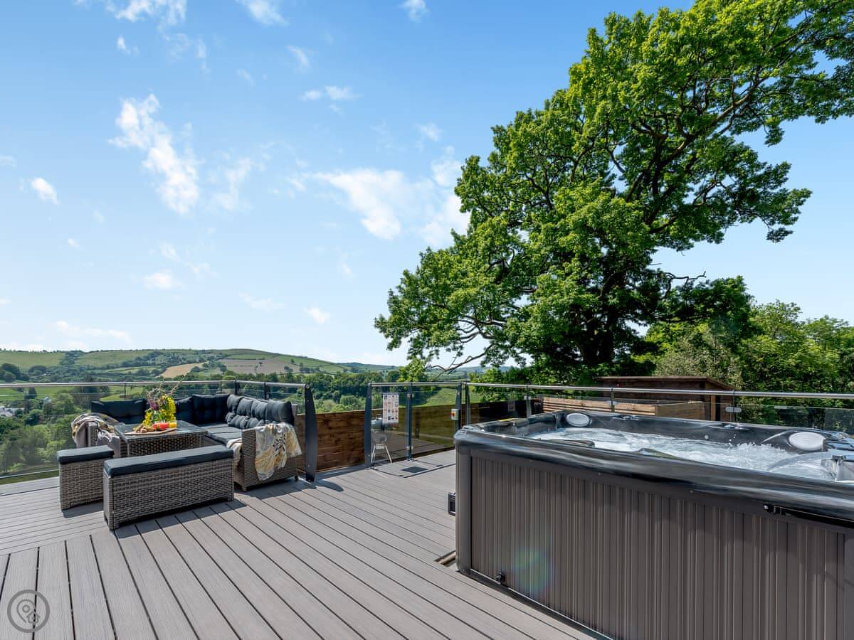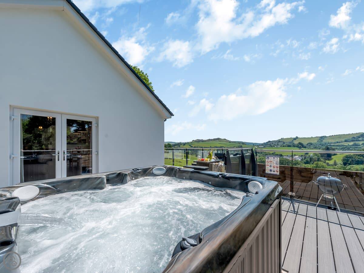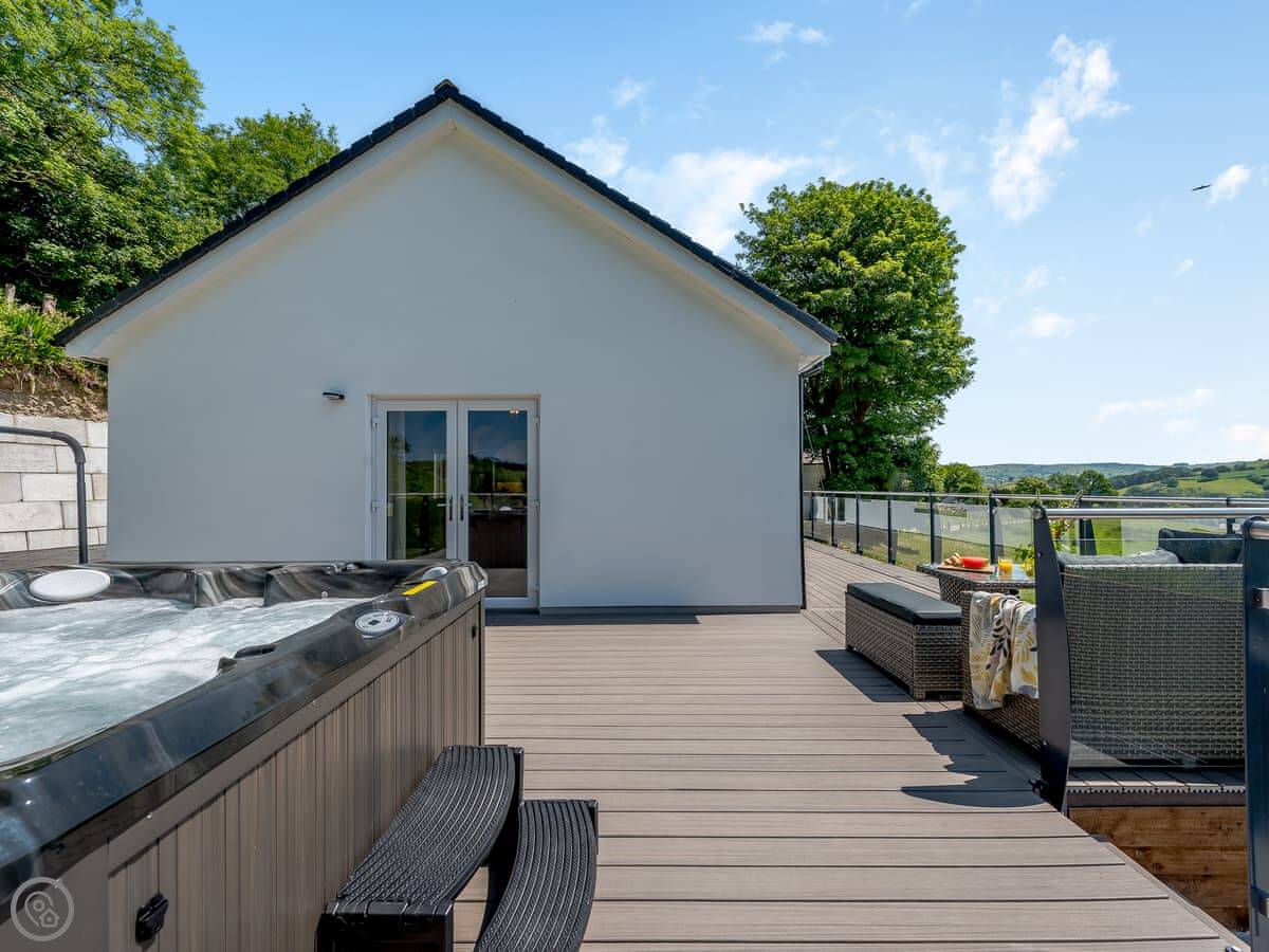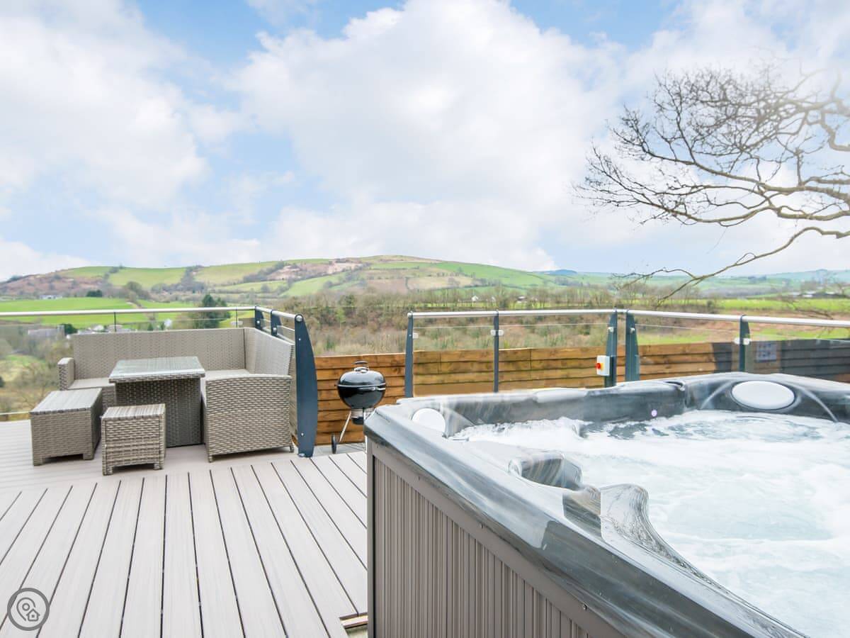 The main living space is open-plan, kitchen, dining and sitting area all together. It's a big room. The kitchen is well equipped, has an American fridge with an ice dispenser. Doors lead out to a decked area with a hot tub and a barbecue. The deck has a glass railing so you can see the view while you're out there.