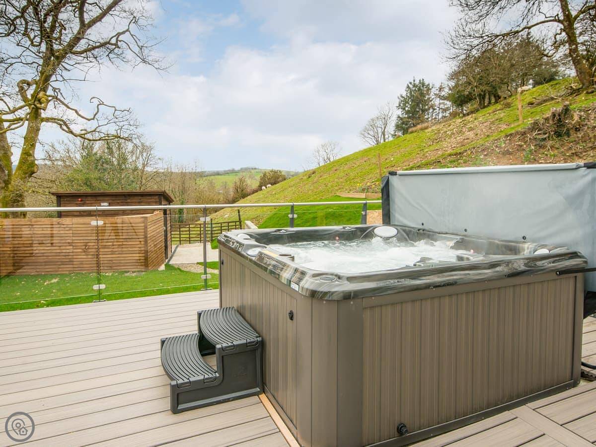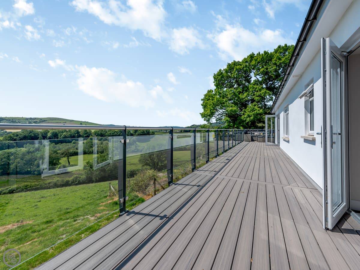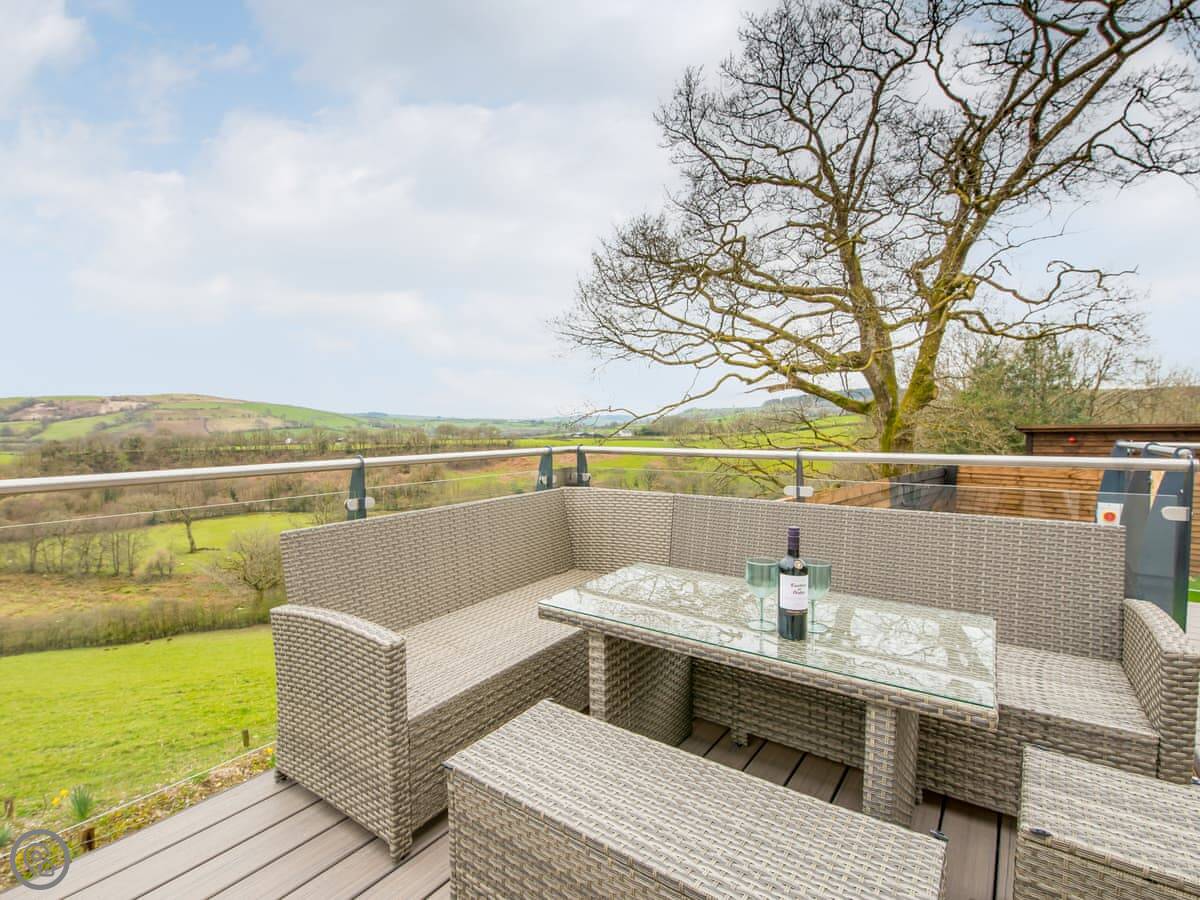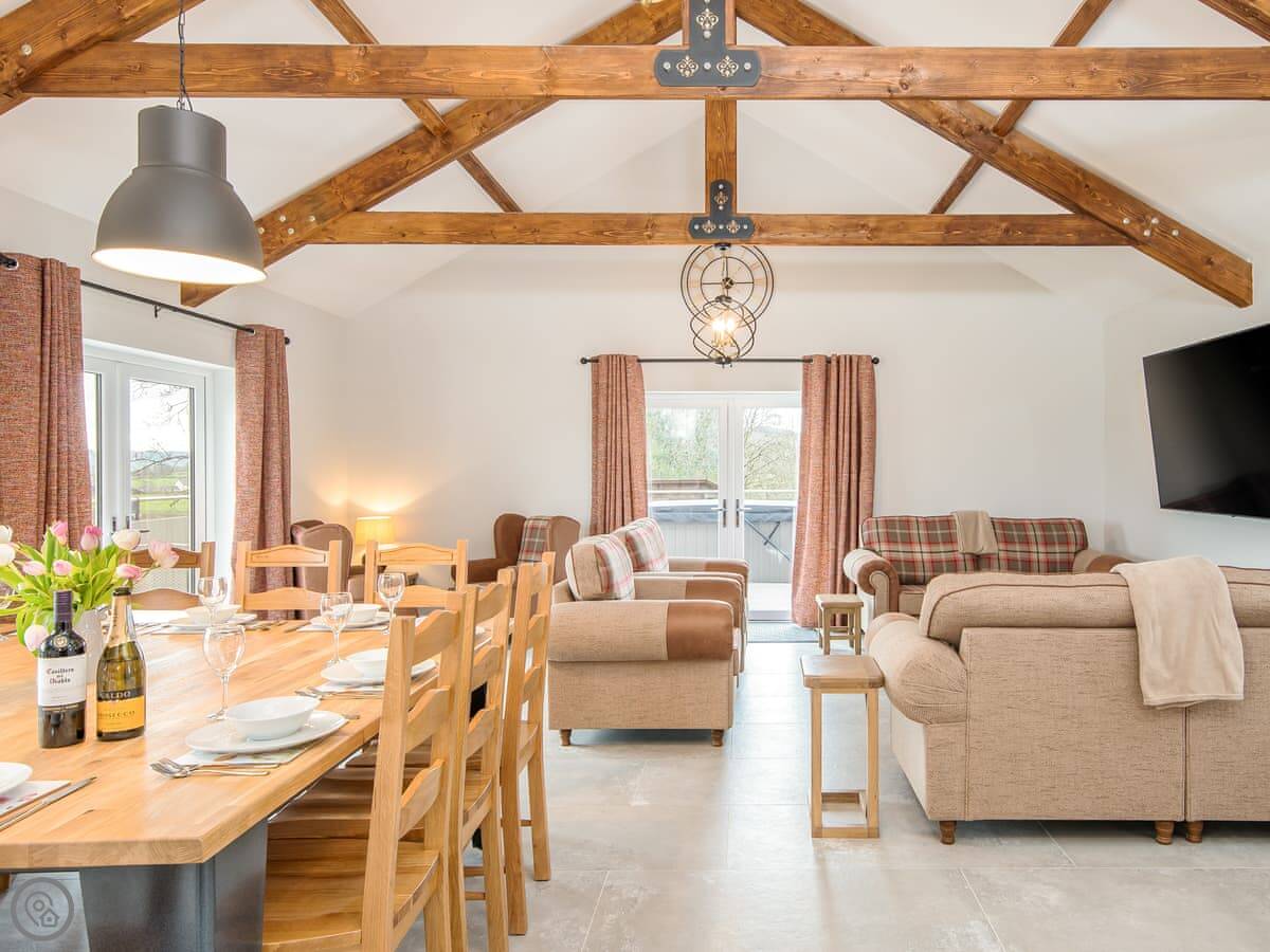 The main living space is open-plan, kitchen, dining and sitting area all together. It's a big room. The kitchen is well equipped, has an American fridge with an ice dispenser. Doors lead out to a decked area with a hot tub and a barbecue. The deck has a glass railing so you can see the view while you're out there.