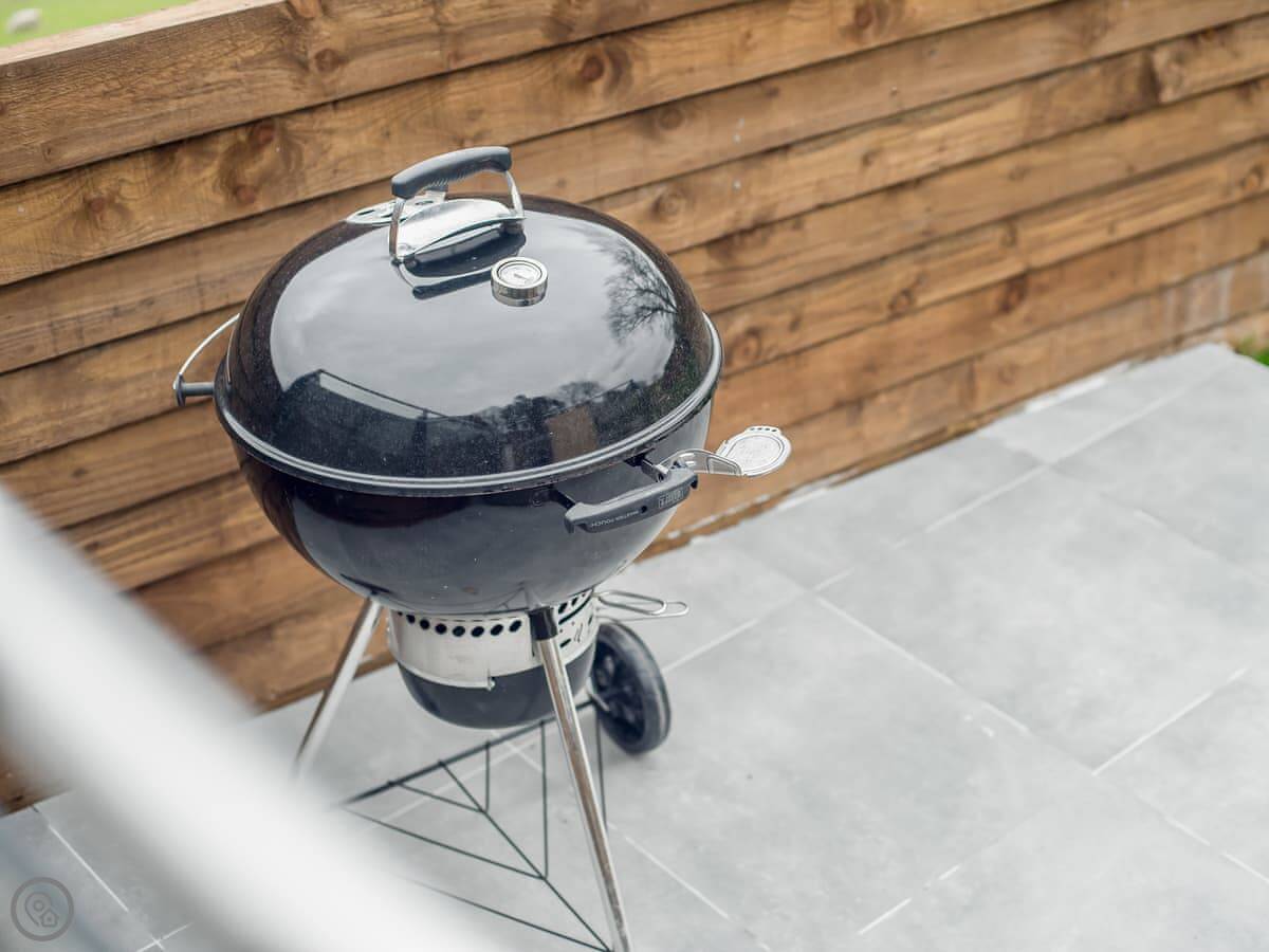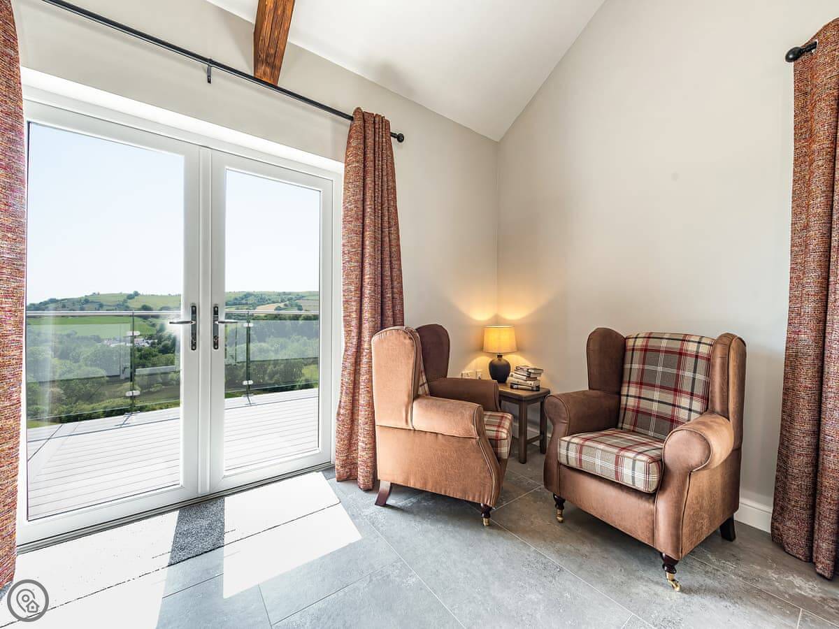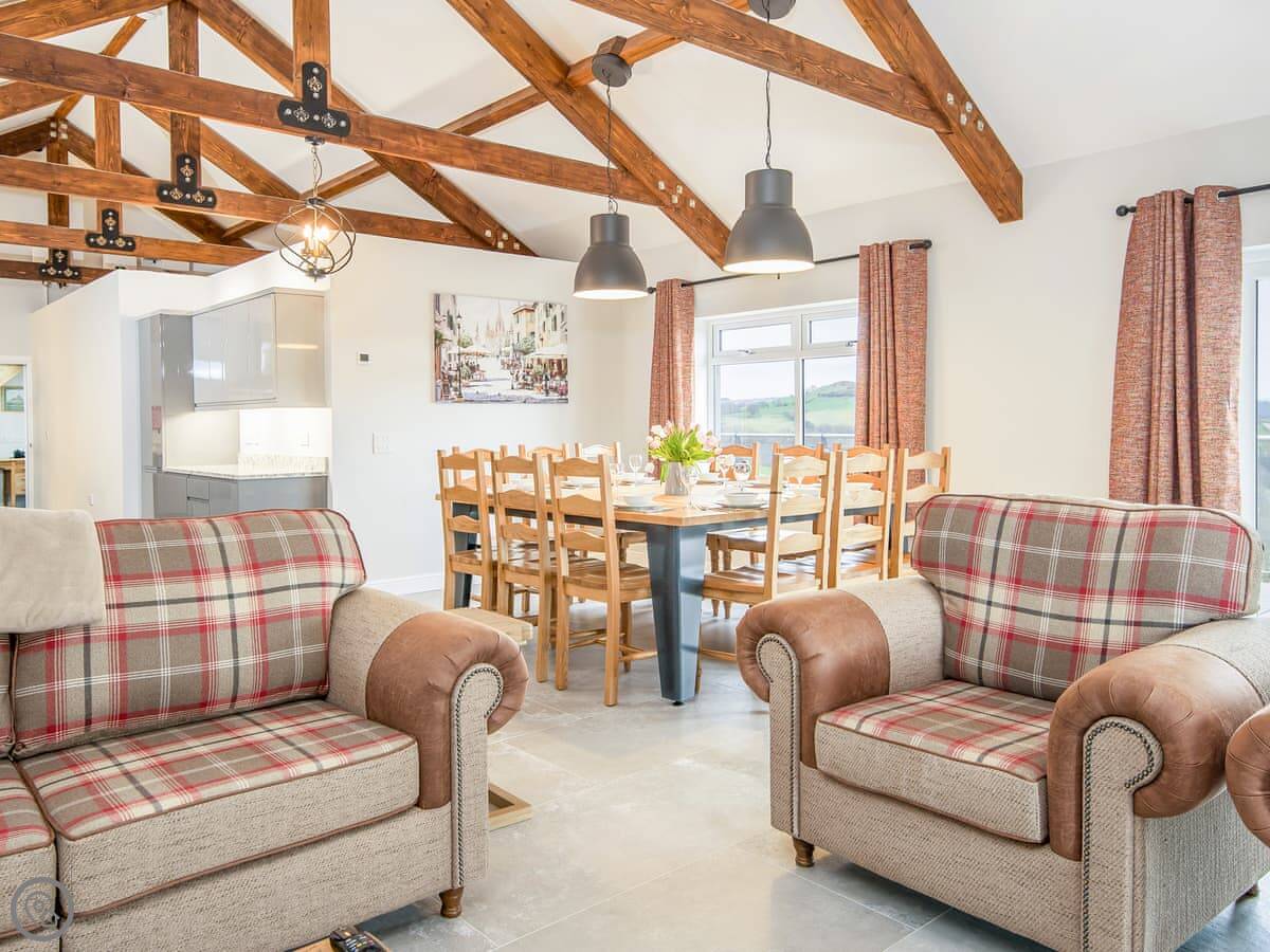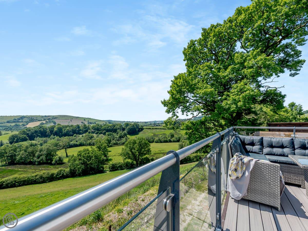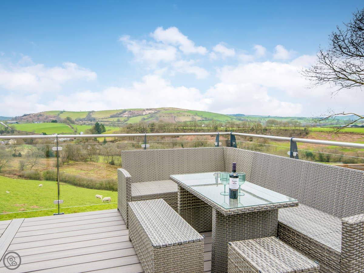 The main living space is open-plan, kitchen, dining and sitting area all together. It's a big room. The kitchen is well equipped, has an American fridge with an ice dispenser. Doors lead out to a decked area with a hot tub and a barbecue. The deck has a glass railing so you can see the view while you're out there.