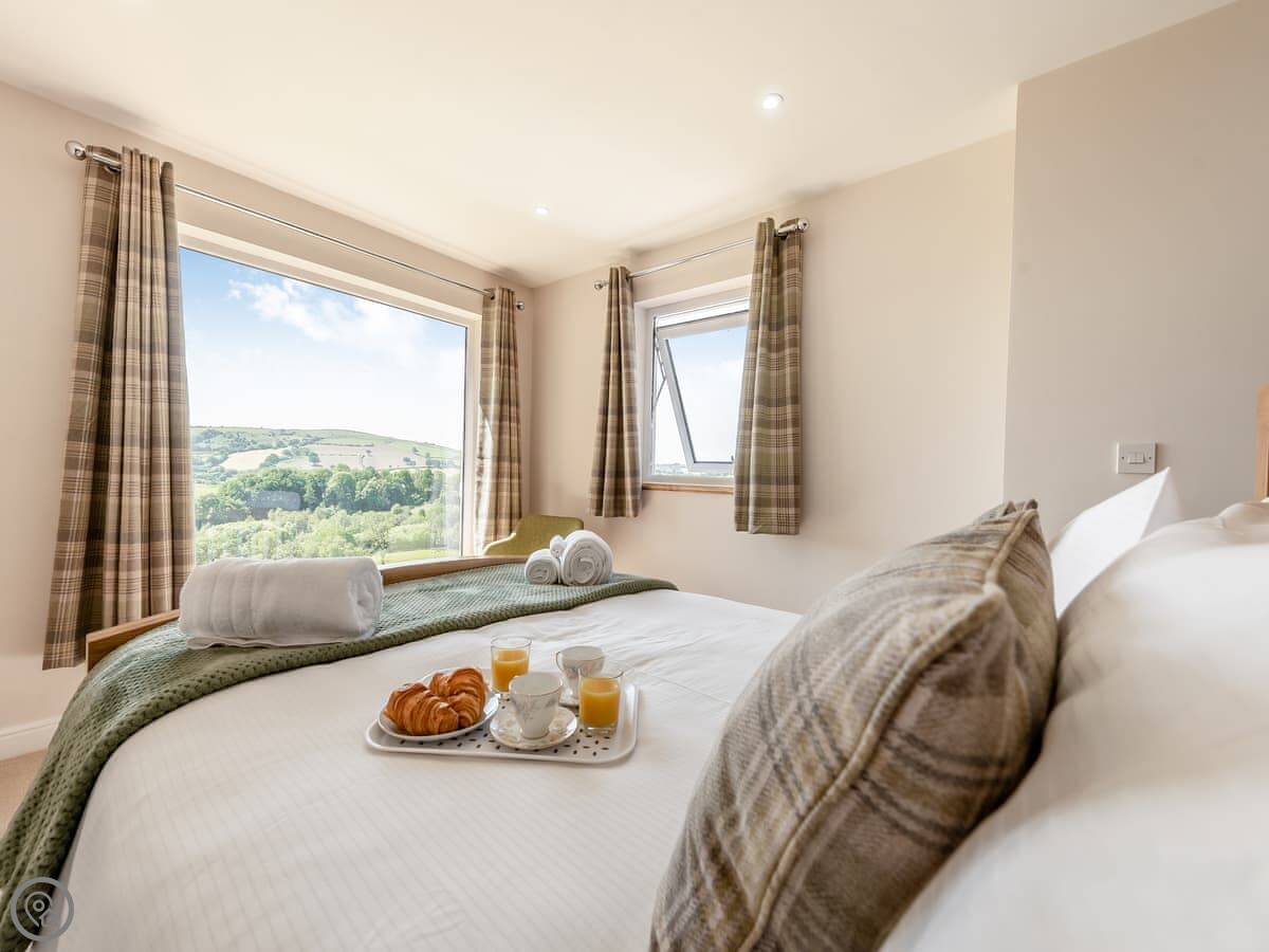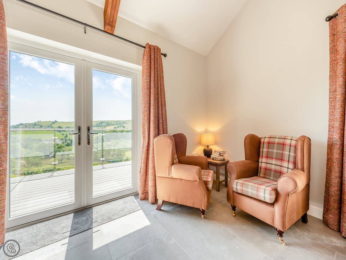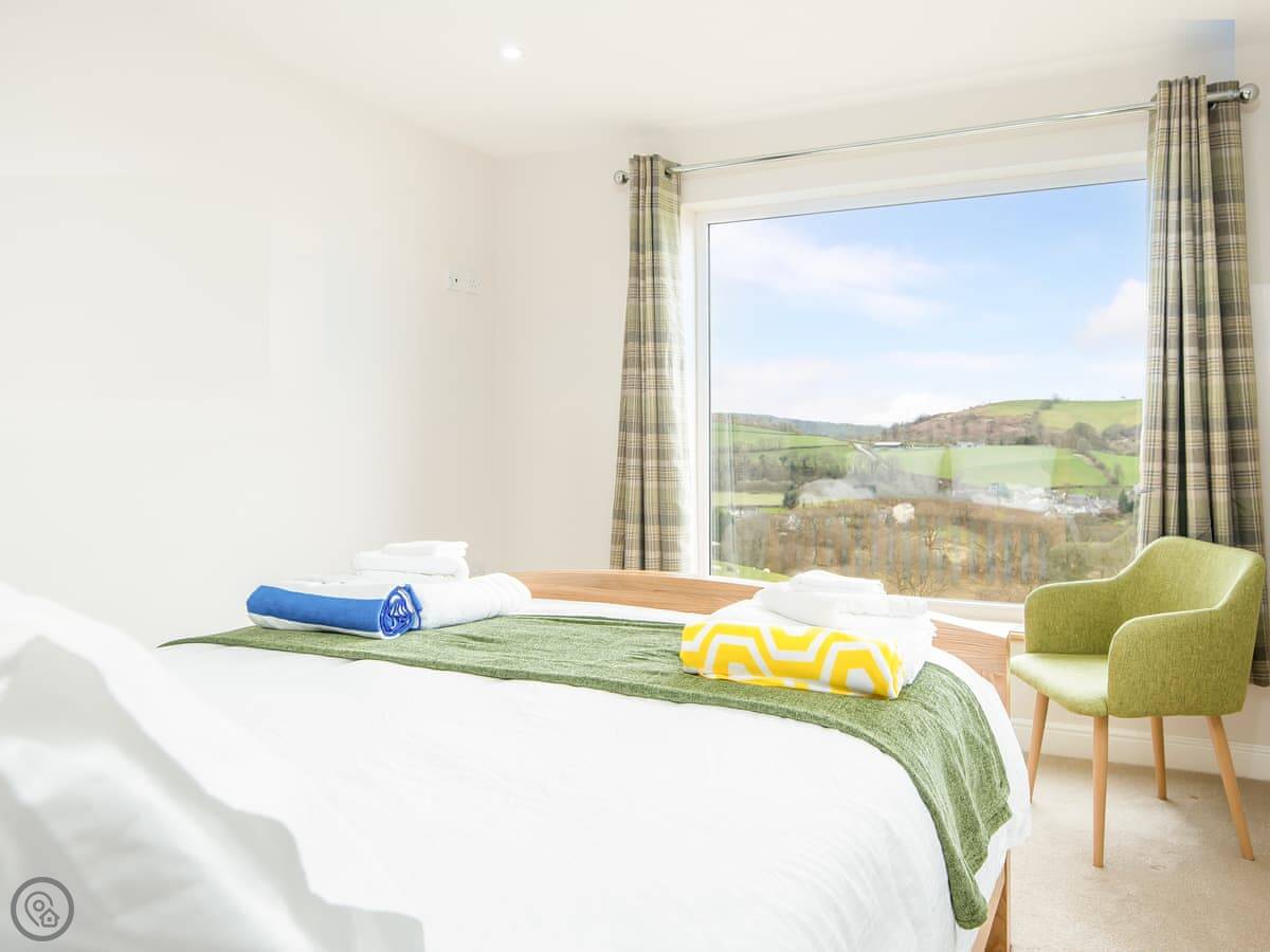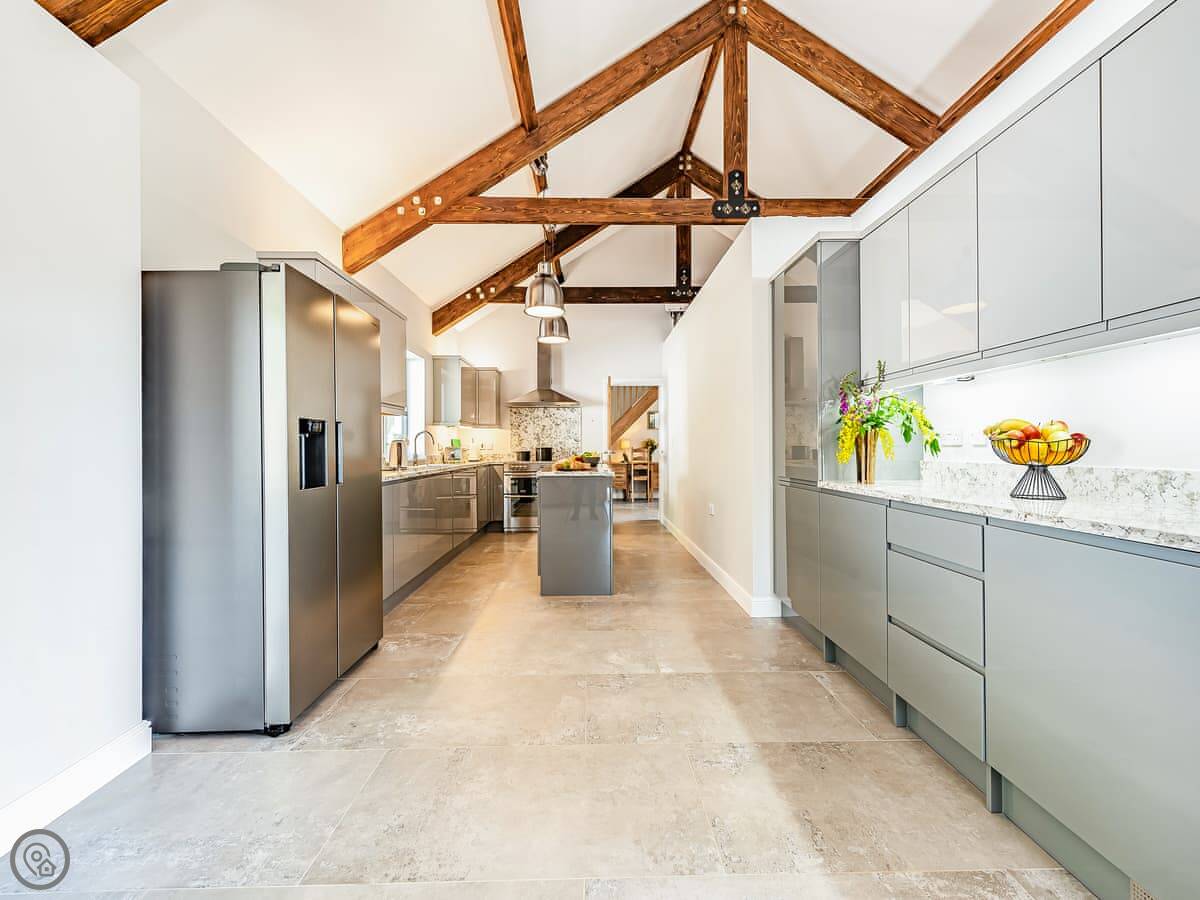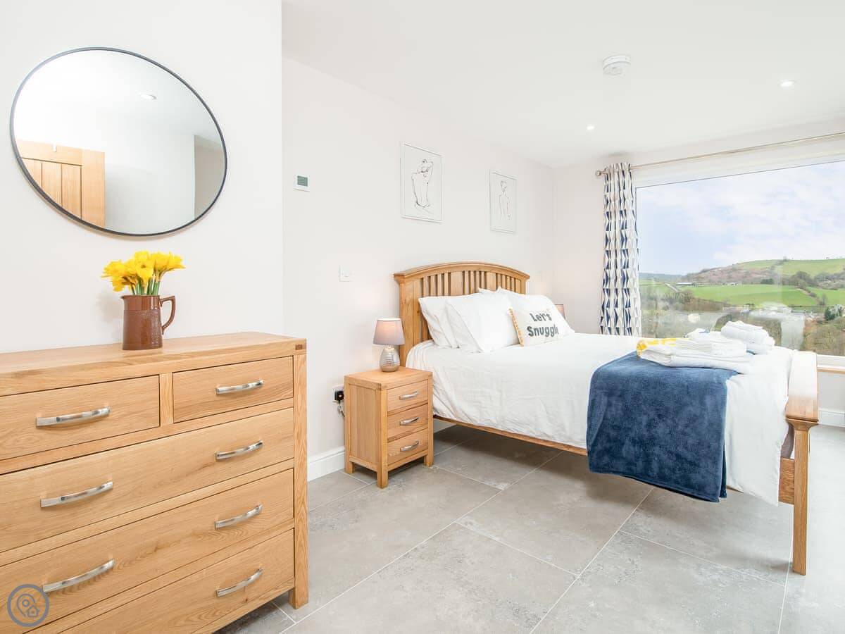 The main living space is open-plan, kitchen, dining and sitting area all together. It's a big room. The kitchen is well equipped, has an American fridge with an ice dispenser. Doors lead out to a decked area with a hot tub and a barbecue. The deck has a glass railing so you can see the view while you're out there.