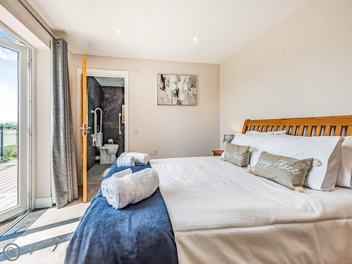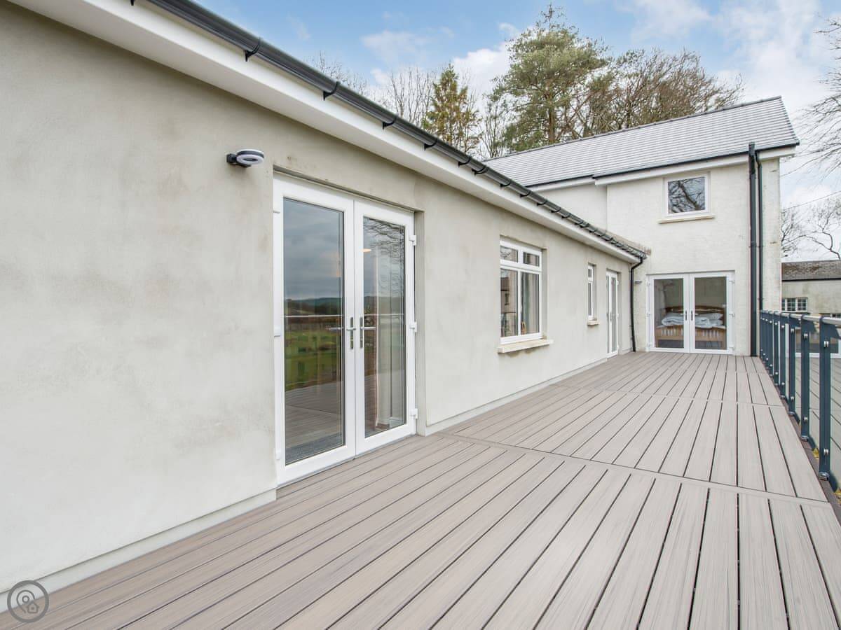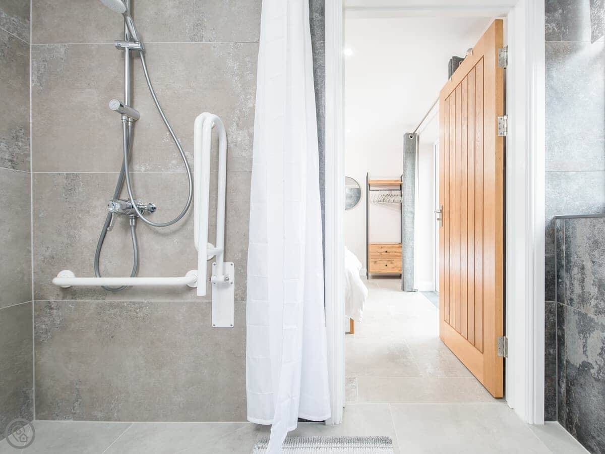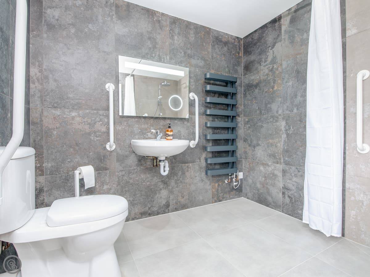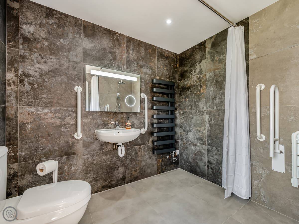 It sleeps ten people. Five bedrooms, four bathrooms. It's a 5 Star property, which means it was done up recently and has things like underfloor heating. Three bedrooms are on the ground floor. One of those has a wet room with grab rails and direct access outside, which is handy if someone has mobility issues. The stairs to the first floor are fine.