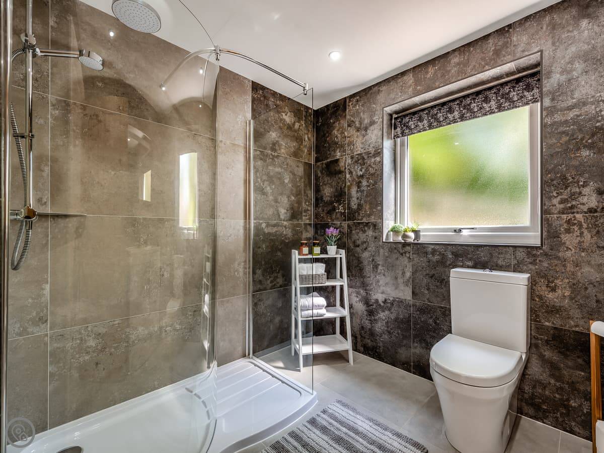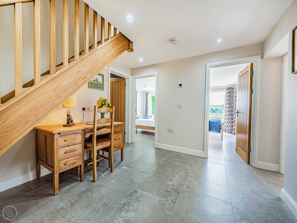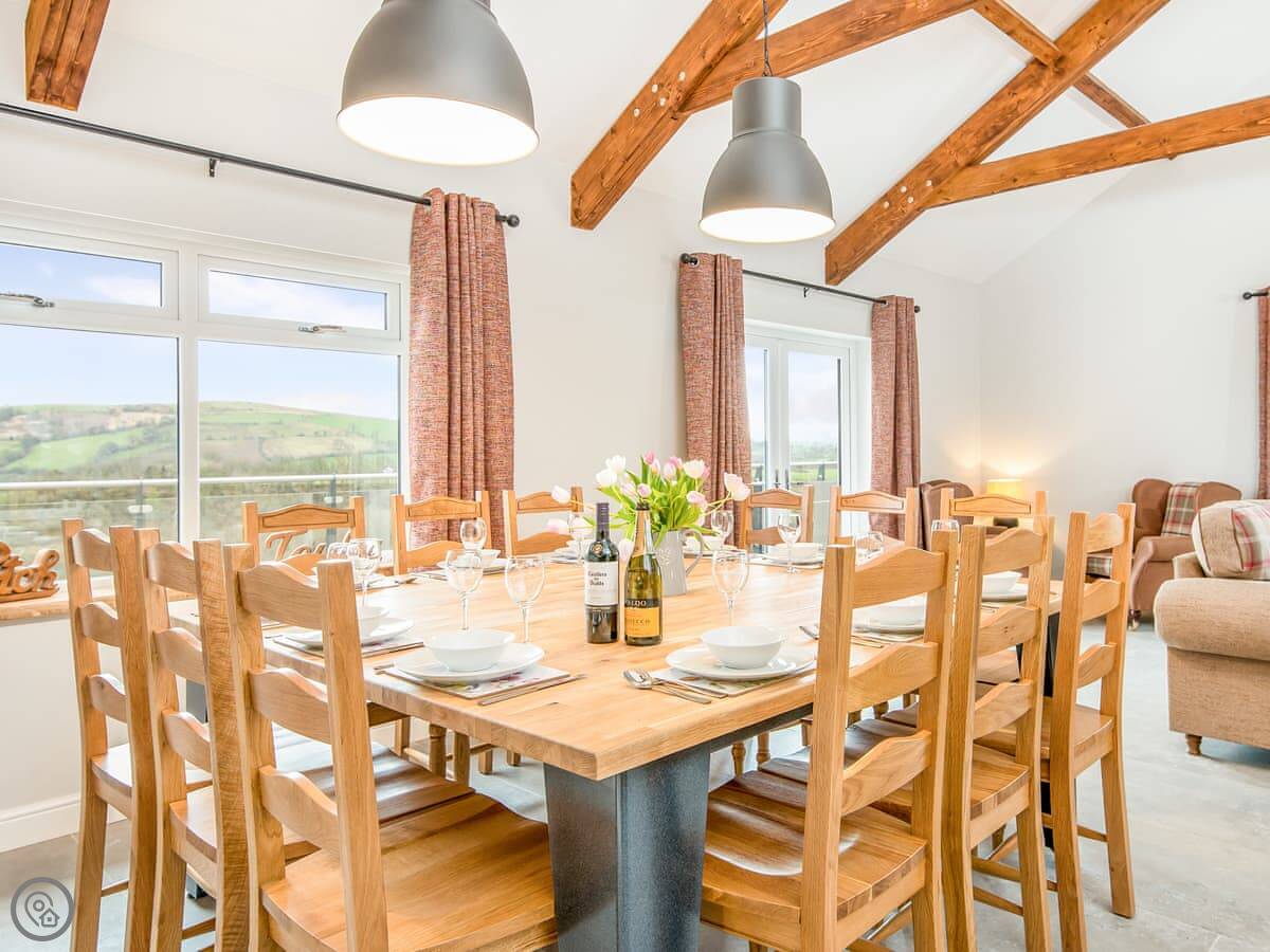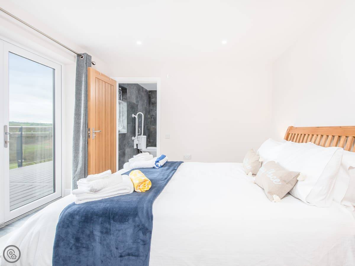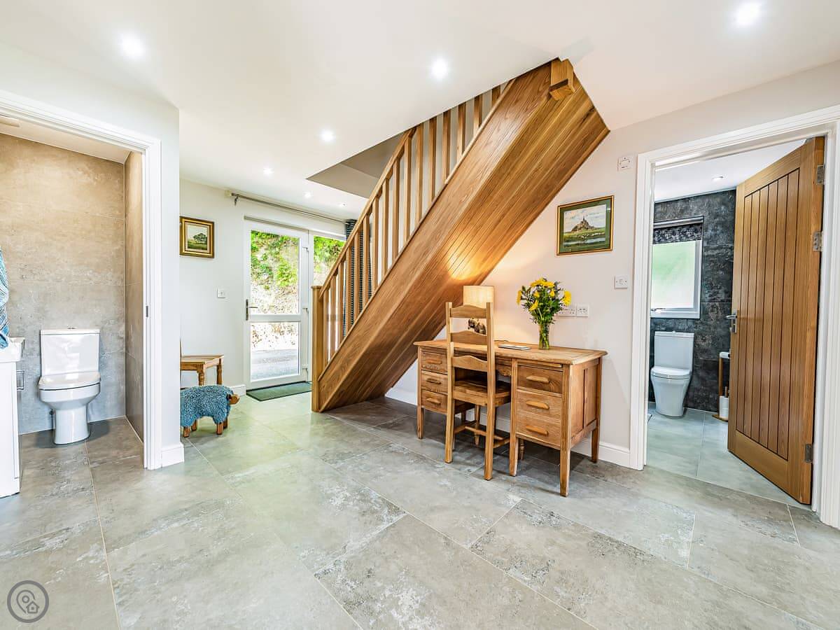 It sleeps ten people. Five bedrooms, four bathrooms. It's a 5 Star property, which means it was done up recently and has things like underfloor heating. Three bedrooms are on the ground floor. One of those has a wet room with grab rails and direct access outside, which is handy if someone has mobility issues. The stairs to the first floor are fine.