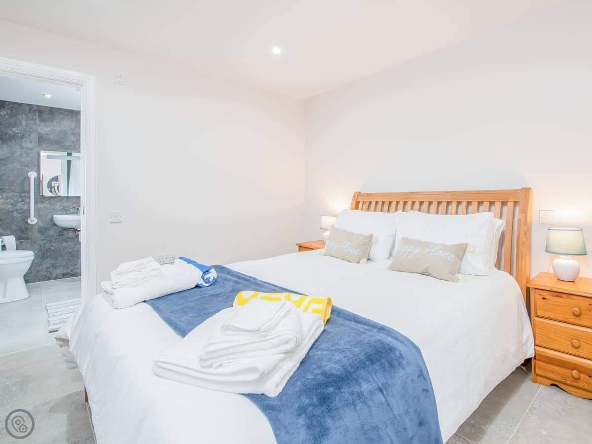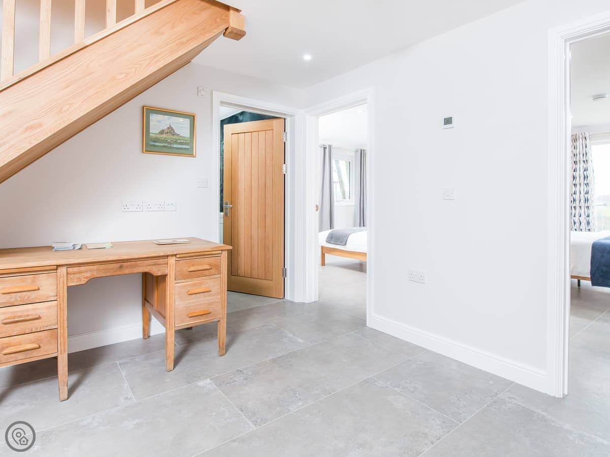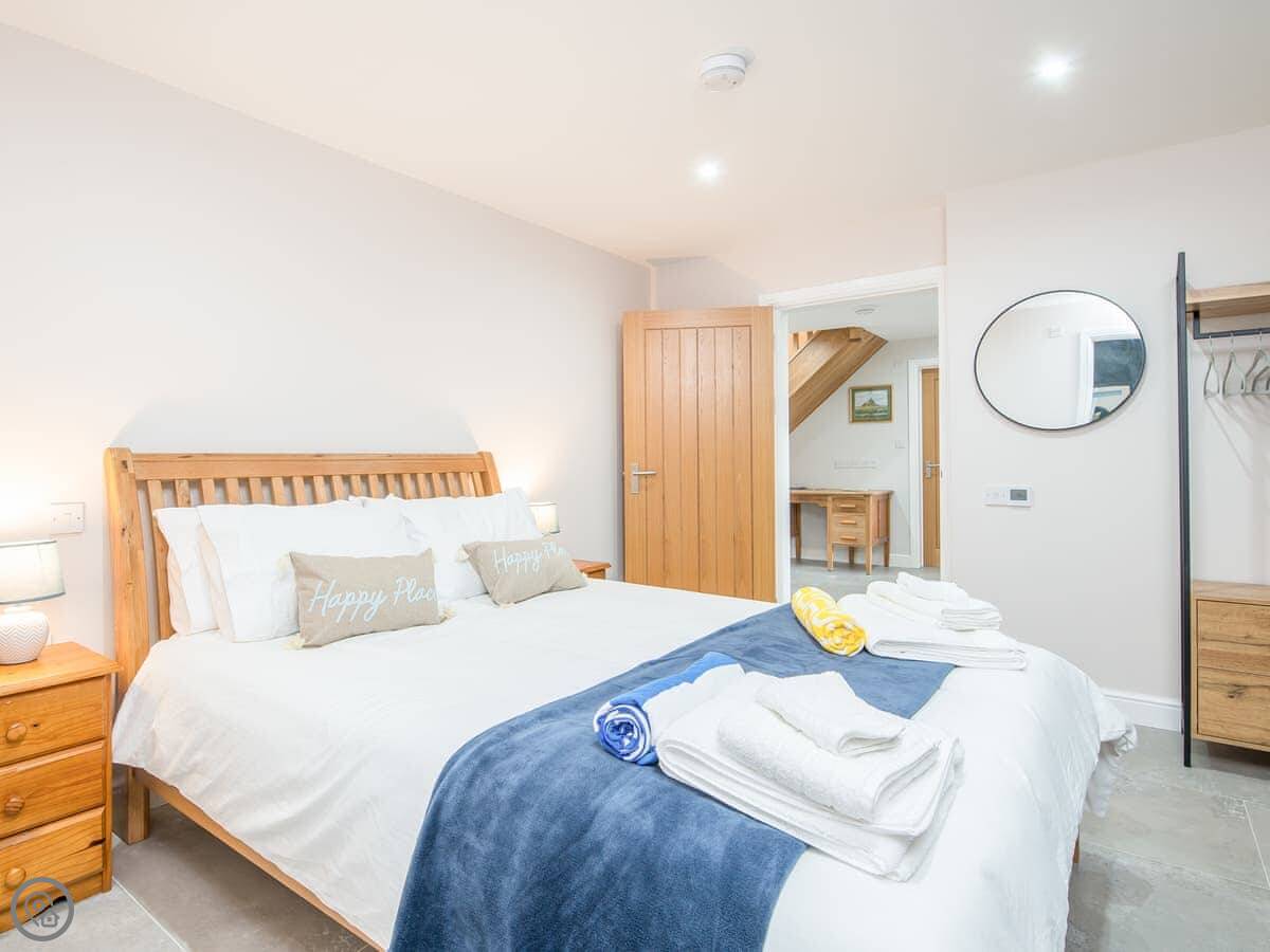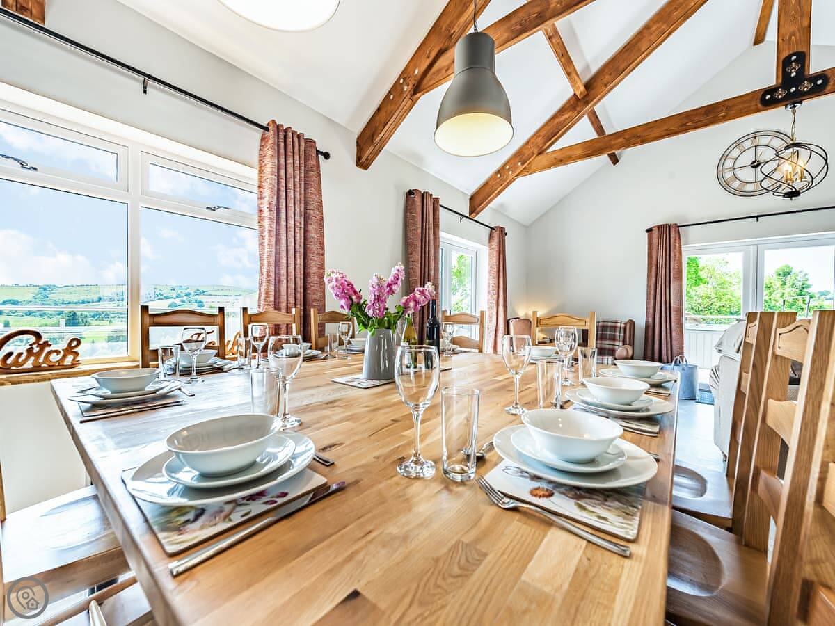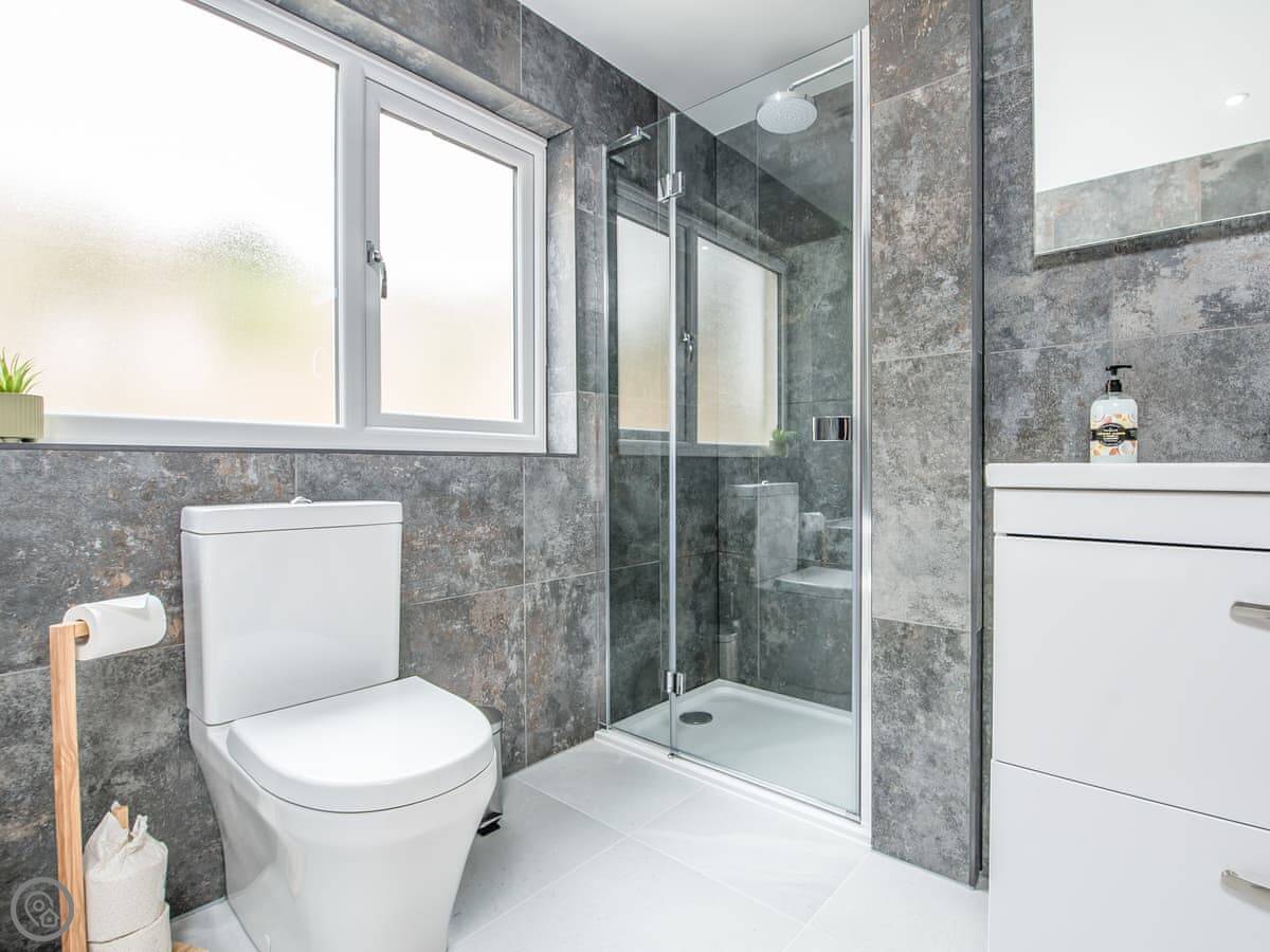 It sleeps ten people. Five bedrooms, four bathrooms. It's a 5 Star property, which means it was done up recently and has things like underfloor heating. Three bedrooms are on the ground floor. One of those has a wet room with grab rails and direct access outside, which is handy if someone has mobility issues. The stairs to the first floor are fine.