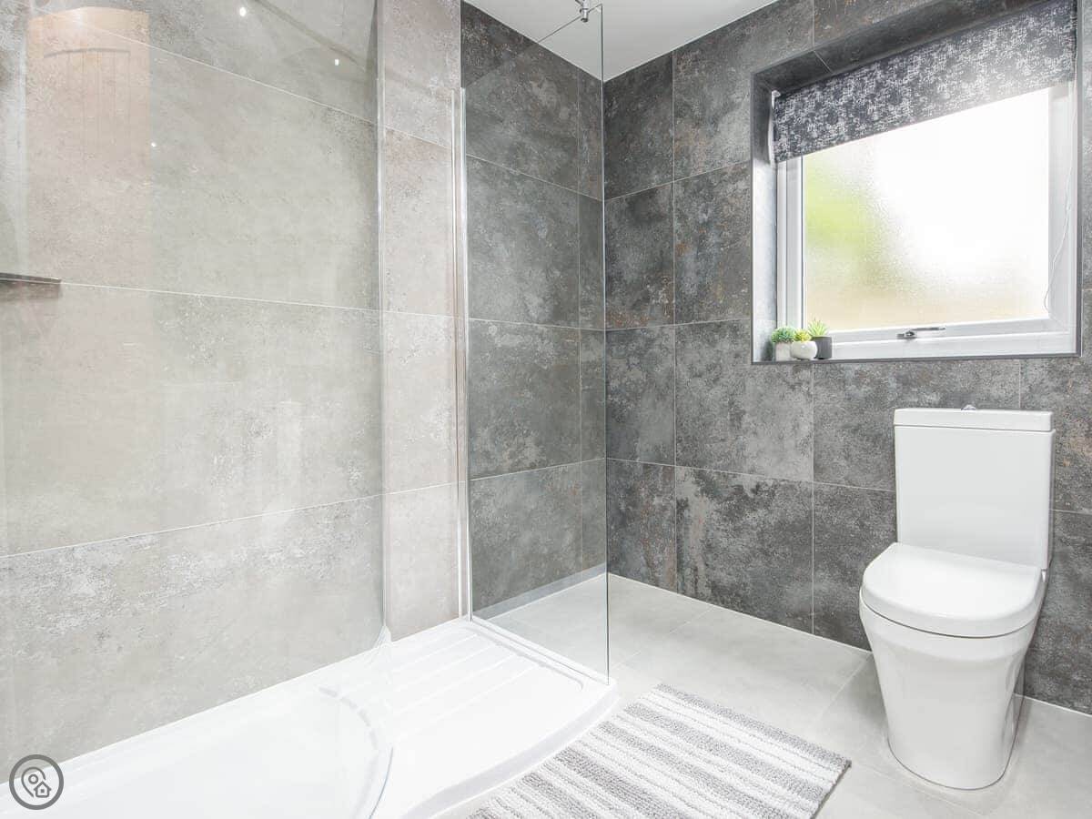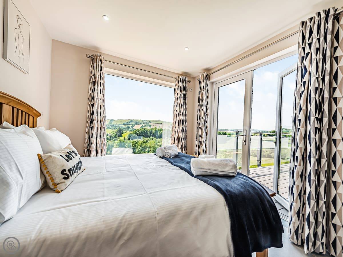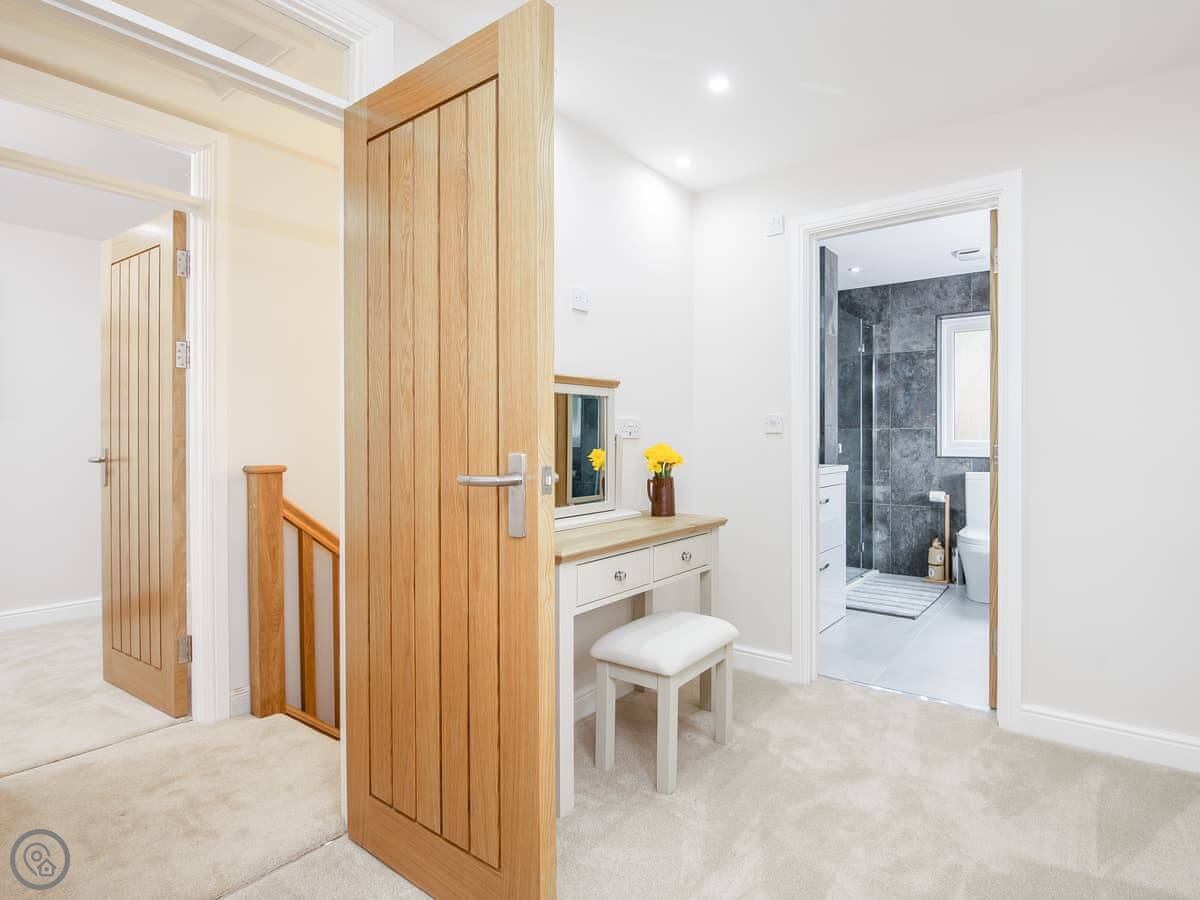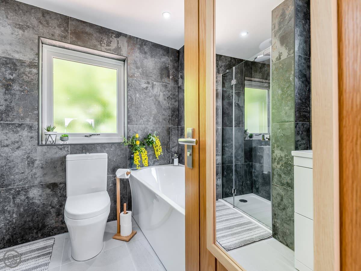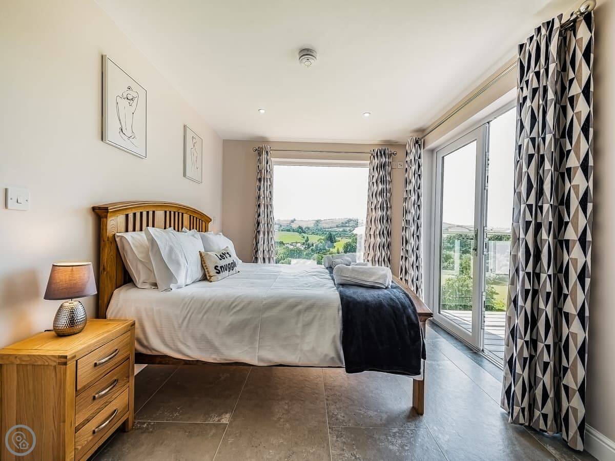 It sleeps ten people. Five bedrooms, four bathrooms. It's a 5 Star property, which means it was done up recently and has things like underfloor heating. Three bedrooms are on the ground floor. One of those has a wet room with grab rails and direct access outside, which is handy if someone has mobility issues. The stairs to the first floor are fine.