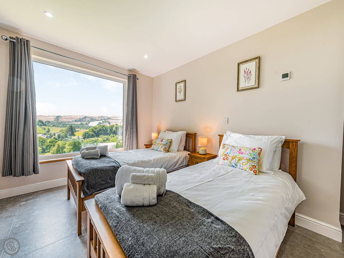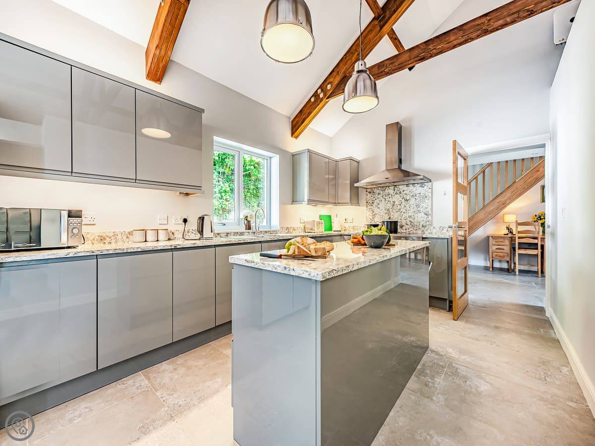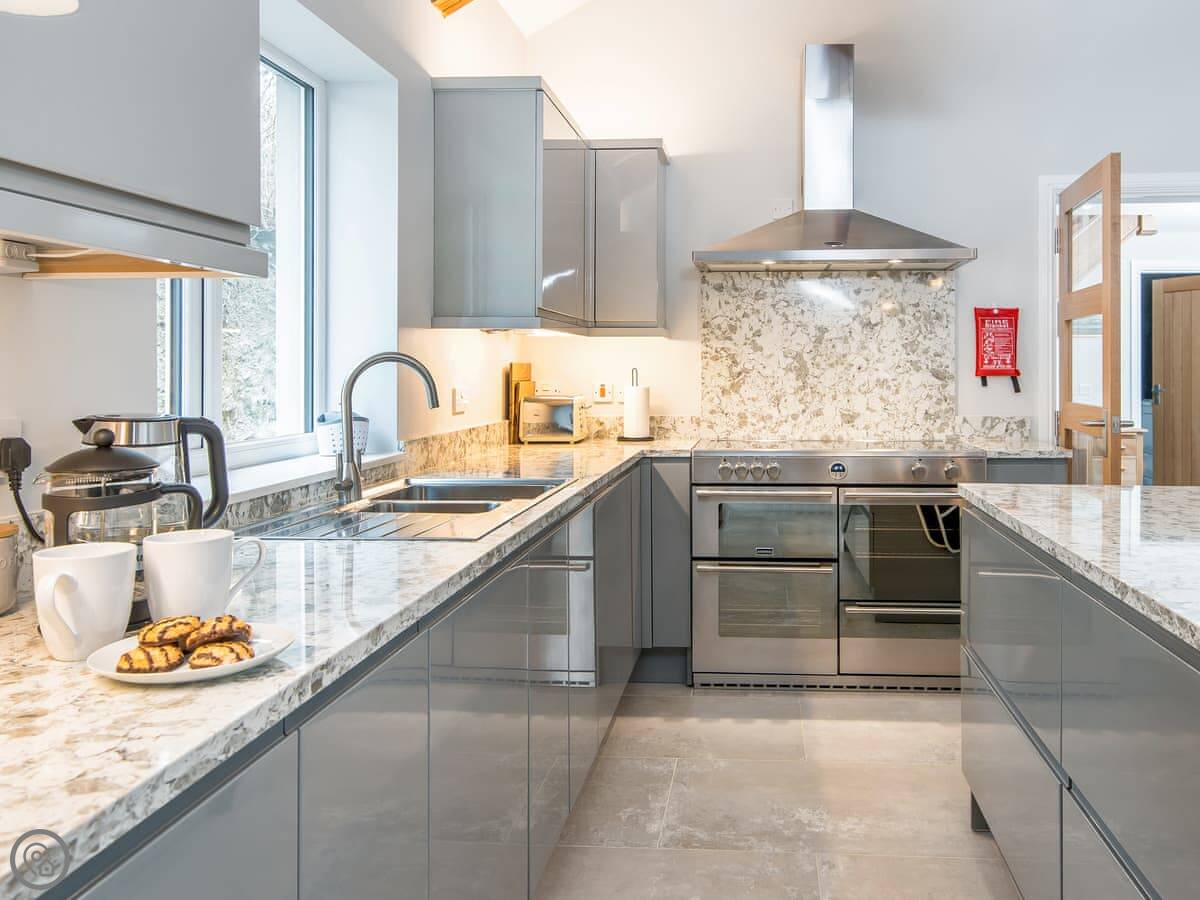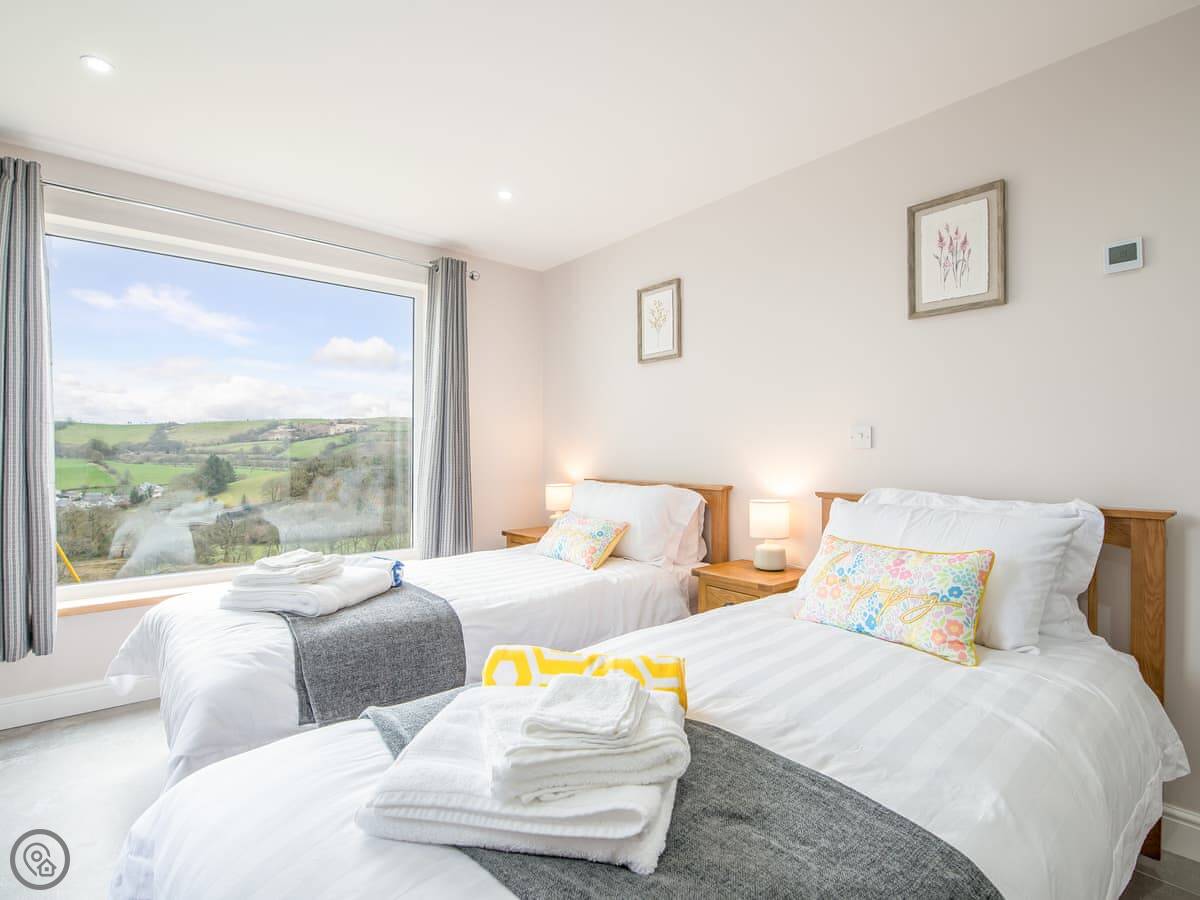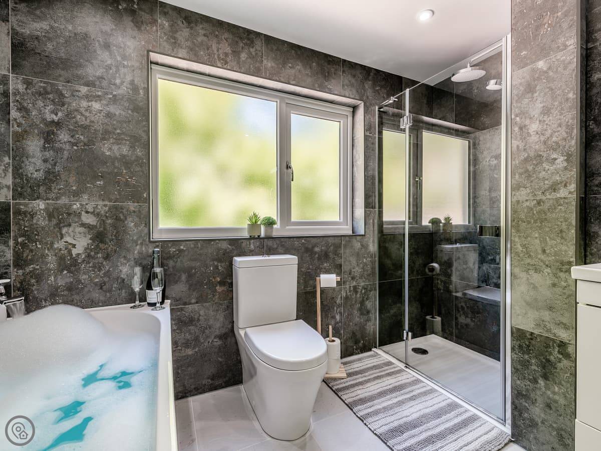 It sleeps ten people. Five bedrooms, four bathrooms. It's a 5 Star property, which means it was done up recently and has things like underfloor heating. Three bedrooms are on the ground floor. One of those has a wet room with grab rails and direct access outside, which is handy if someone has mobility issues. The stairs to the first floor are fine.