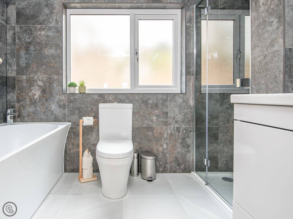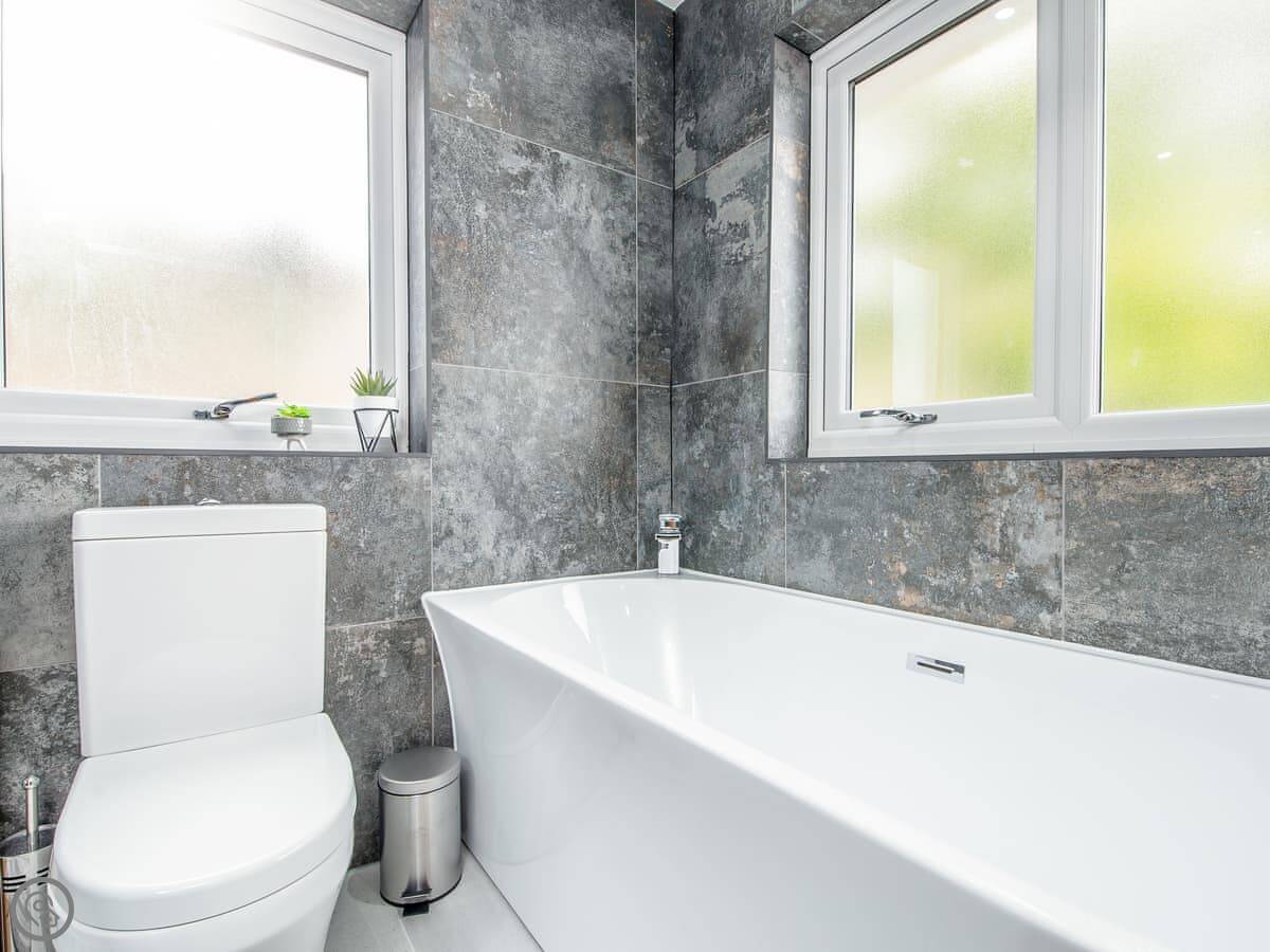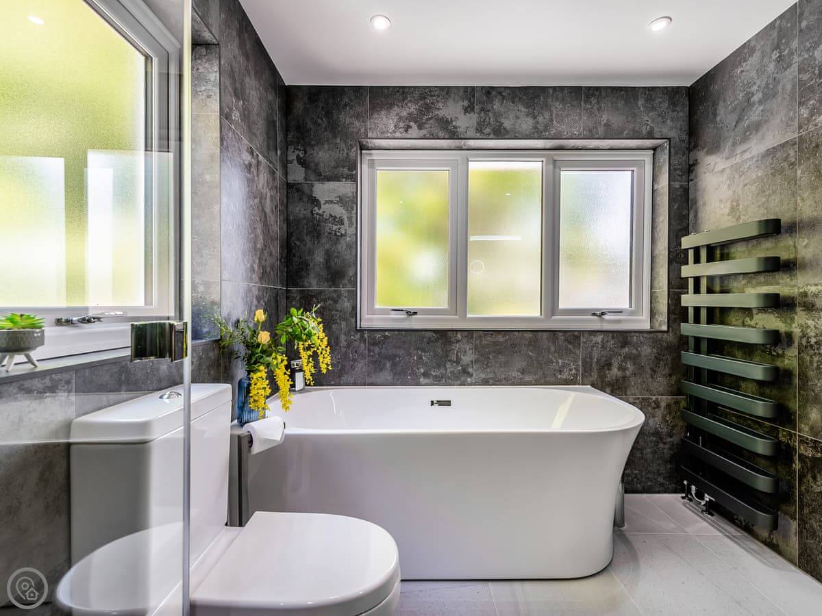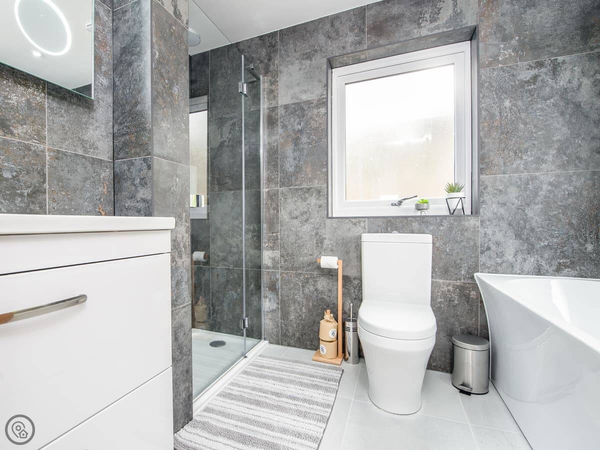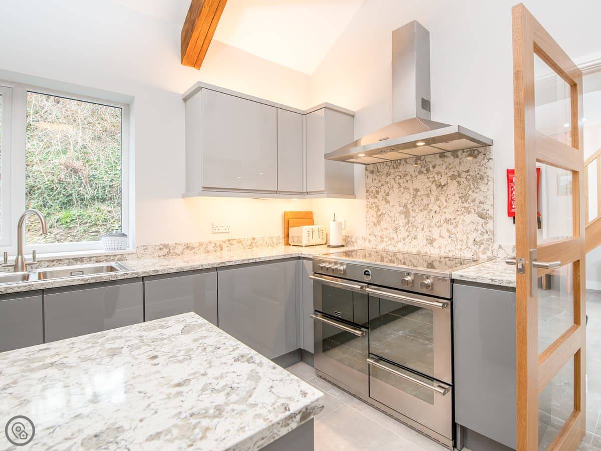 It sleeps ten people. Five bedrooms, four bathrooms. It's a 5 Star property, which means it was done up recently and has things like underfloor heating. Three bedrooms are on the ground floor. One of those has a wet room with grab rails and direct access outside, which is handy if someone has mobility issues. The stairs to the first floor are fine.