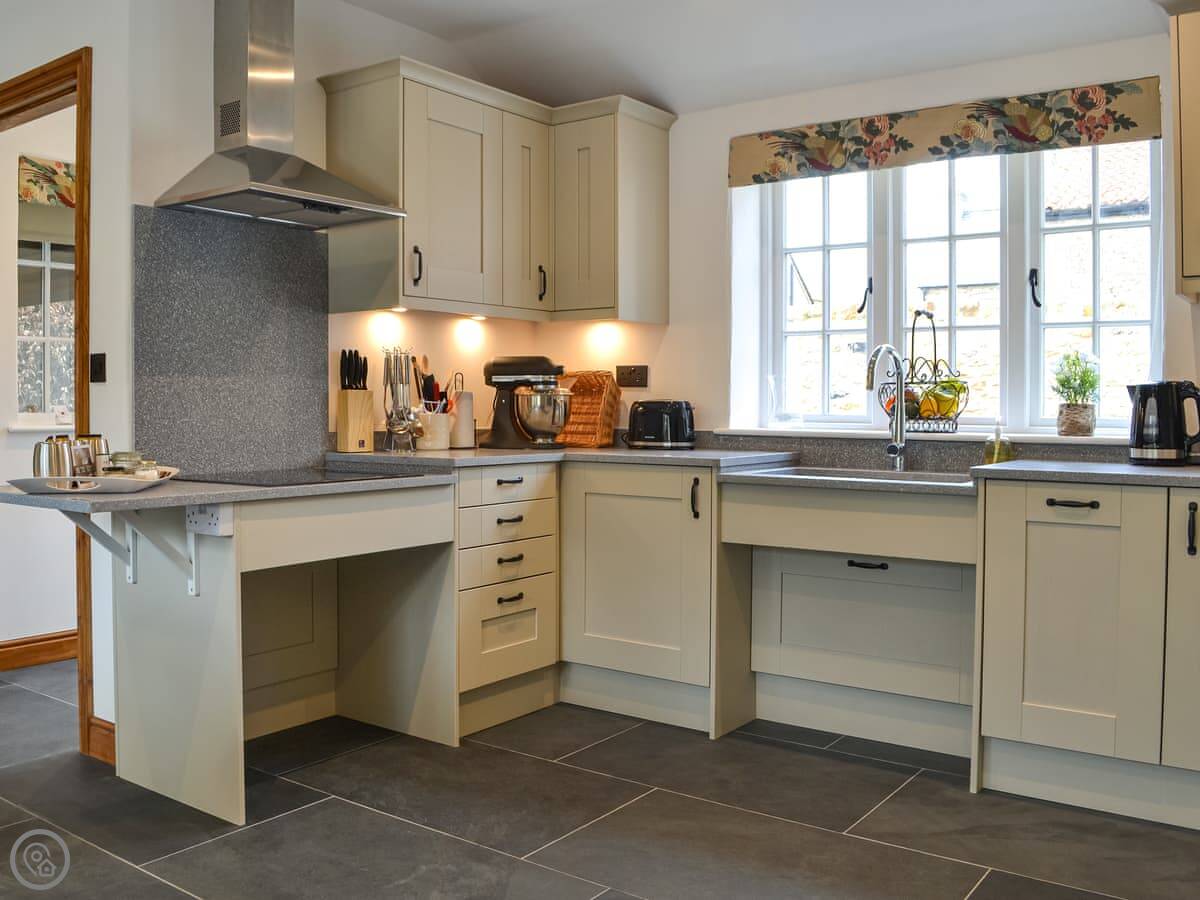 The kitchen is big and open, with bi-fold doors to the garden. The hob and sink are lower for easier use. There's a dishwasher and washing machine. The main living area has a sofa and two electric armchairs.