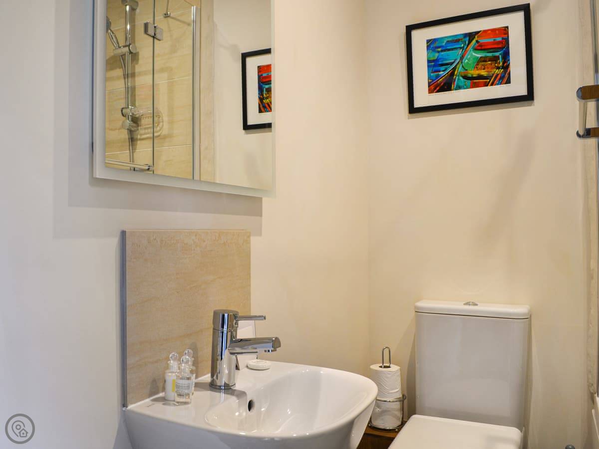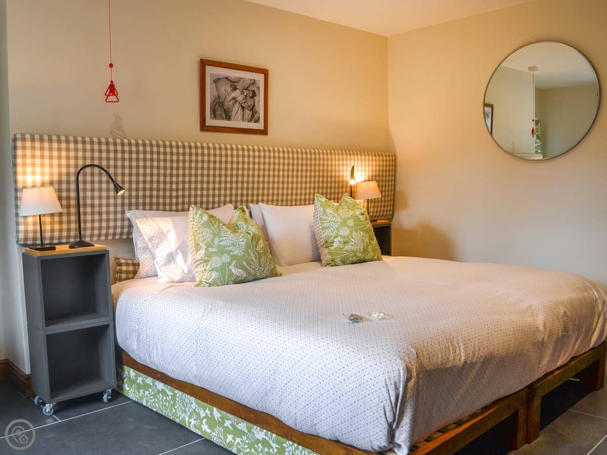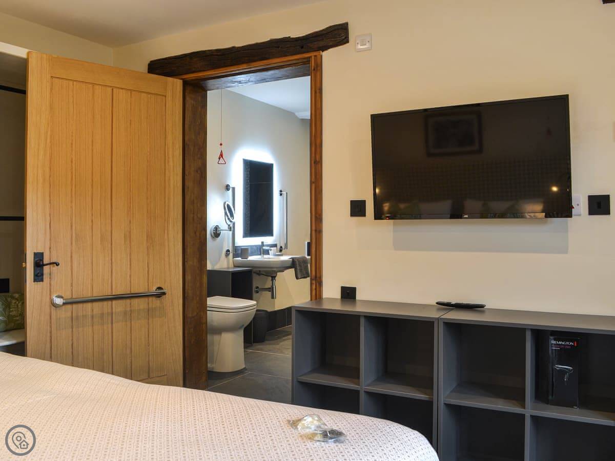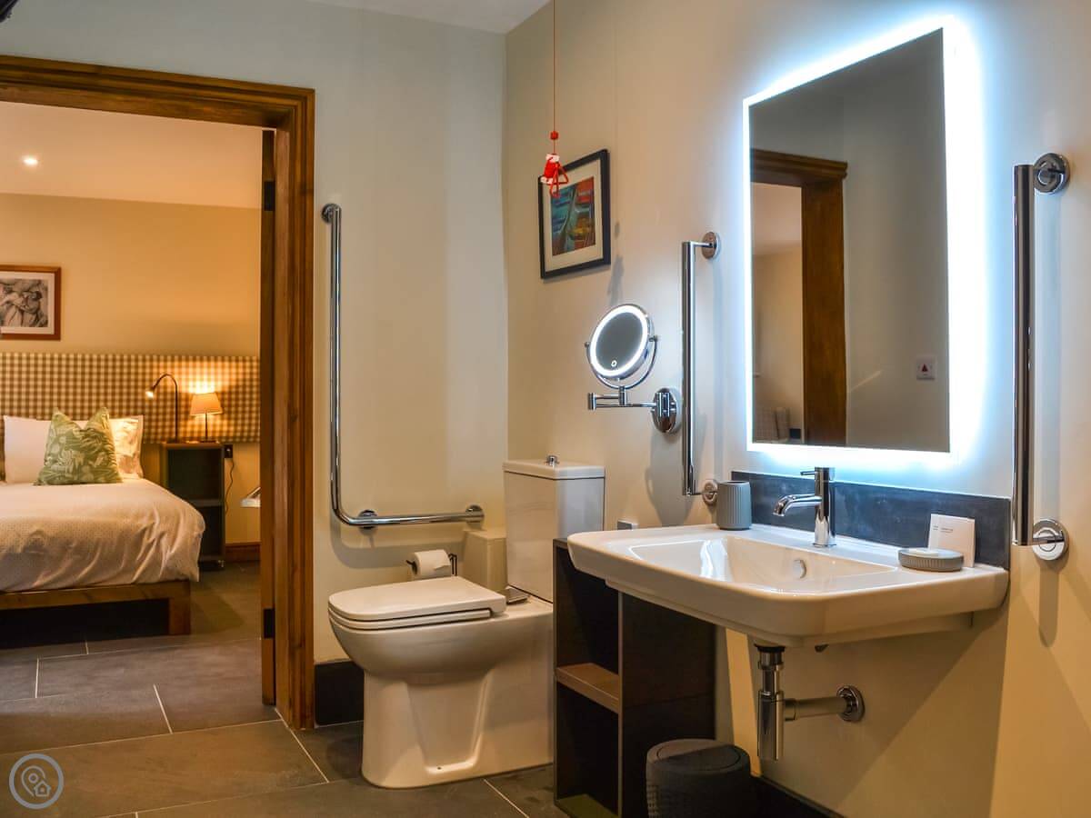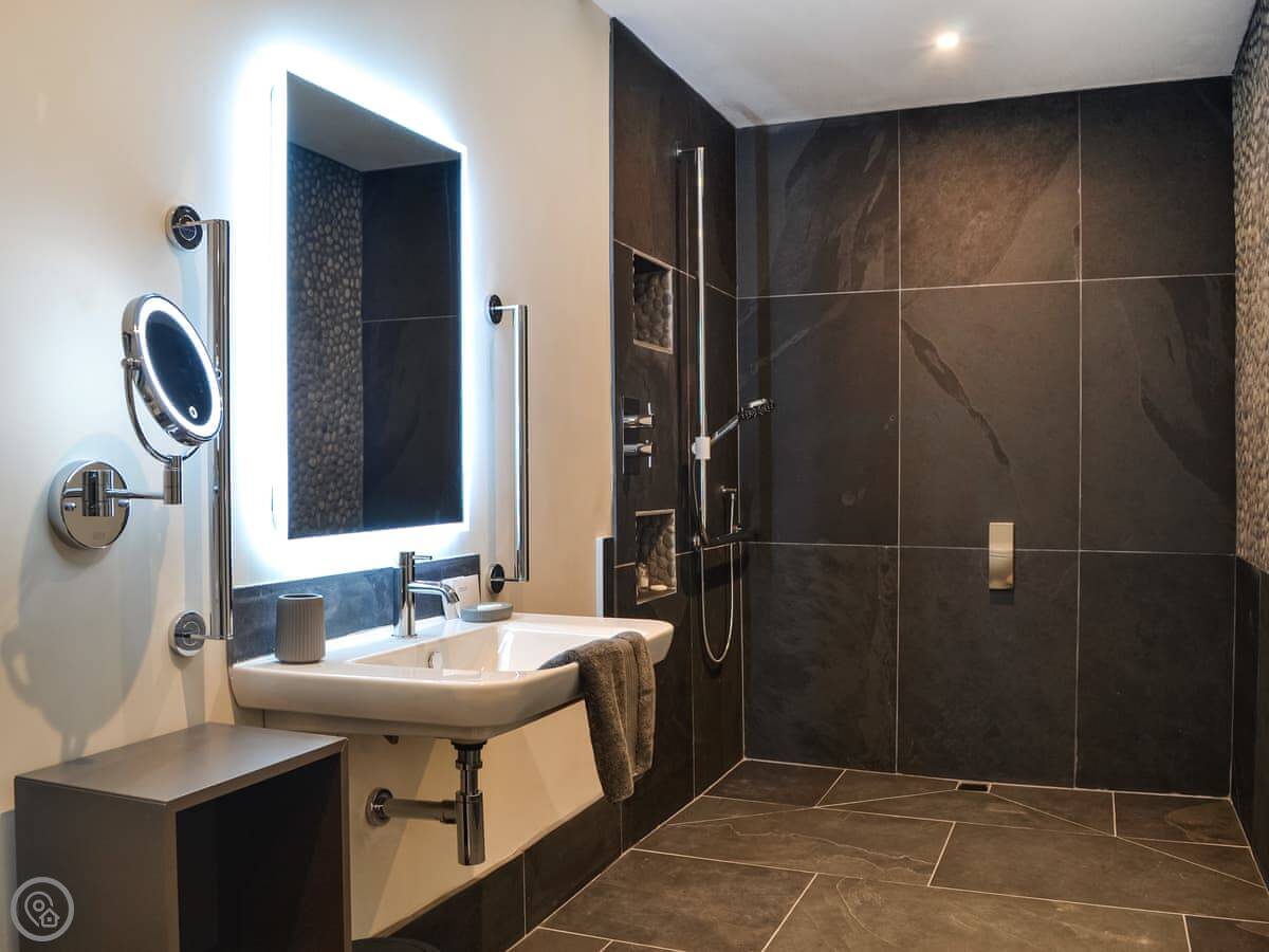 It sleeps four in two bedrooms. One is a super king with an en-suite wet room, the other is a twin with its own bathroom. It's got a 5 Star Gold rating because it's very well-equipped, especially for accessibility. There are grab rails, pull cords, and a walk-in wet room. Everything is flat and wide for wheelchair access.