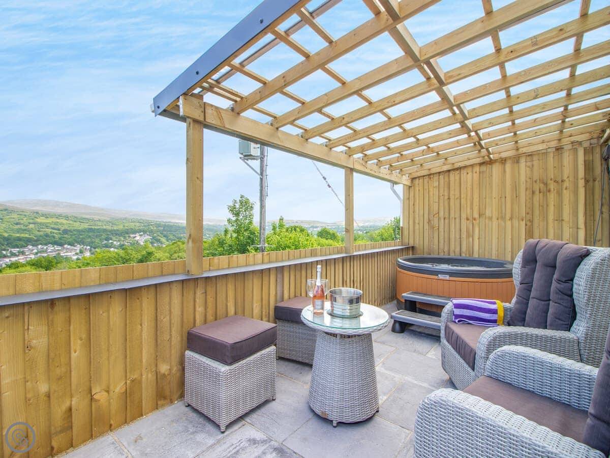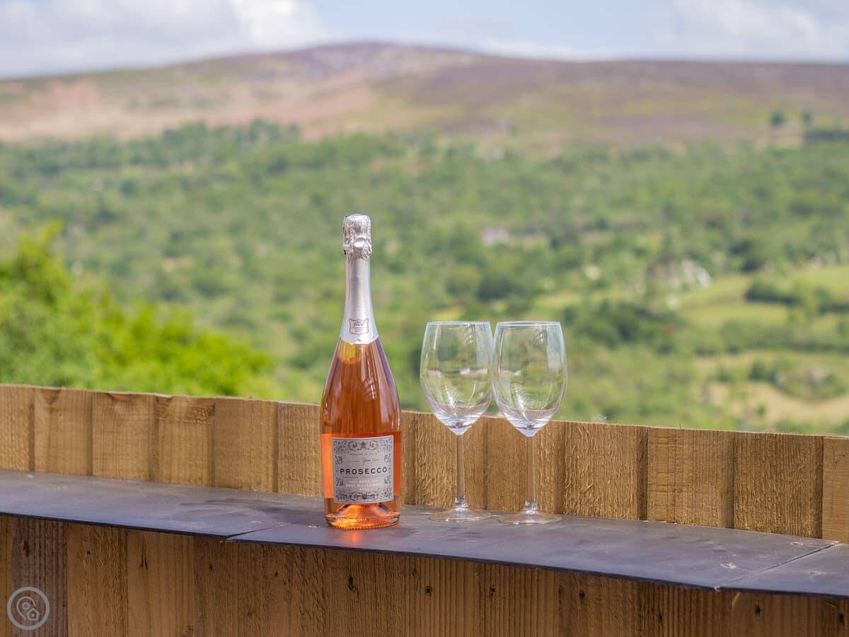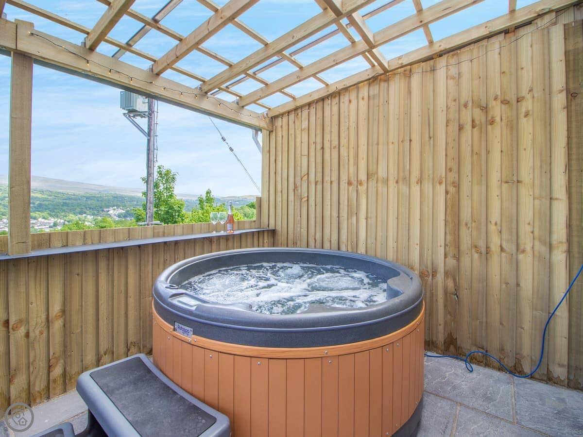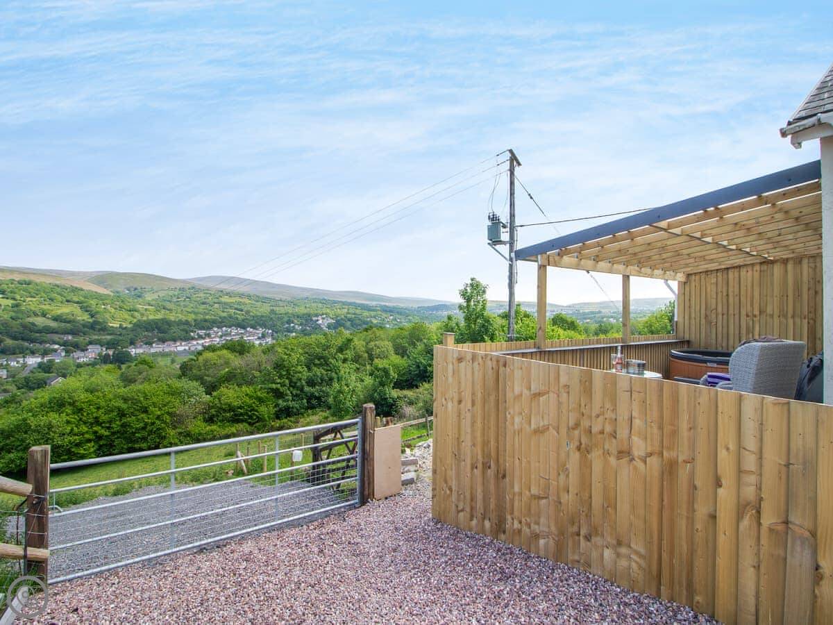 It’s all on the ground floor. One open plan room with the kitchen, living and dining area, then the bedroom and shower room off that. The bedroom has patio doors that open onto an enclosed verandah. That’s where the hot tub is. You can sit in it and look out at the hills. There’s no streetlights round here, so on a clear night you can see a lot of stars.