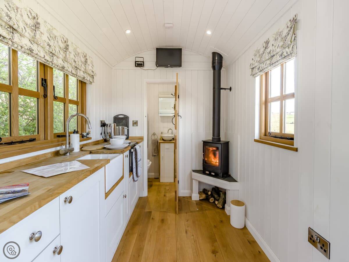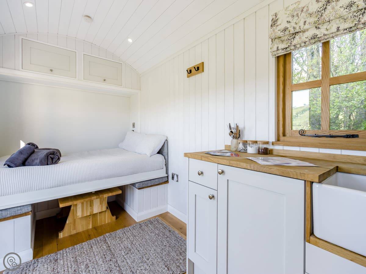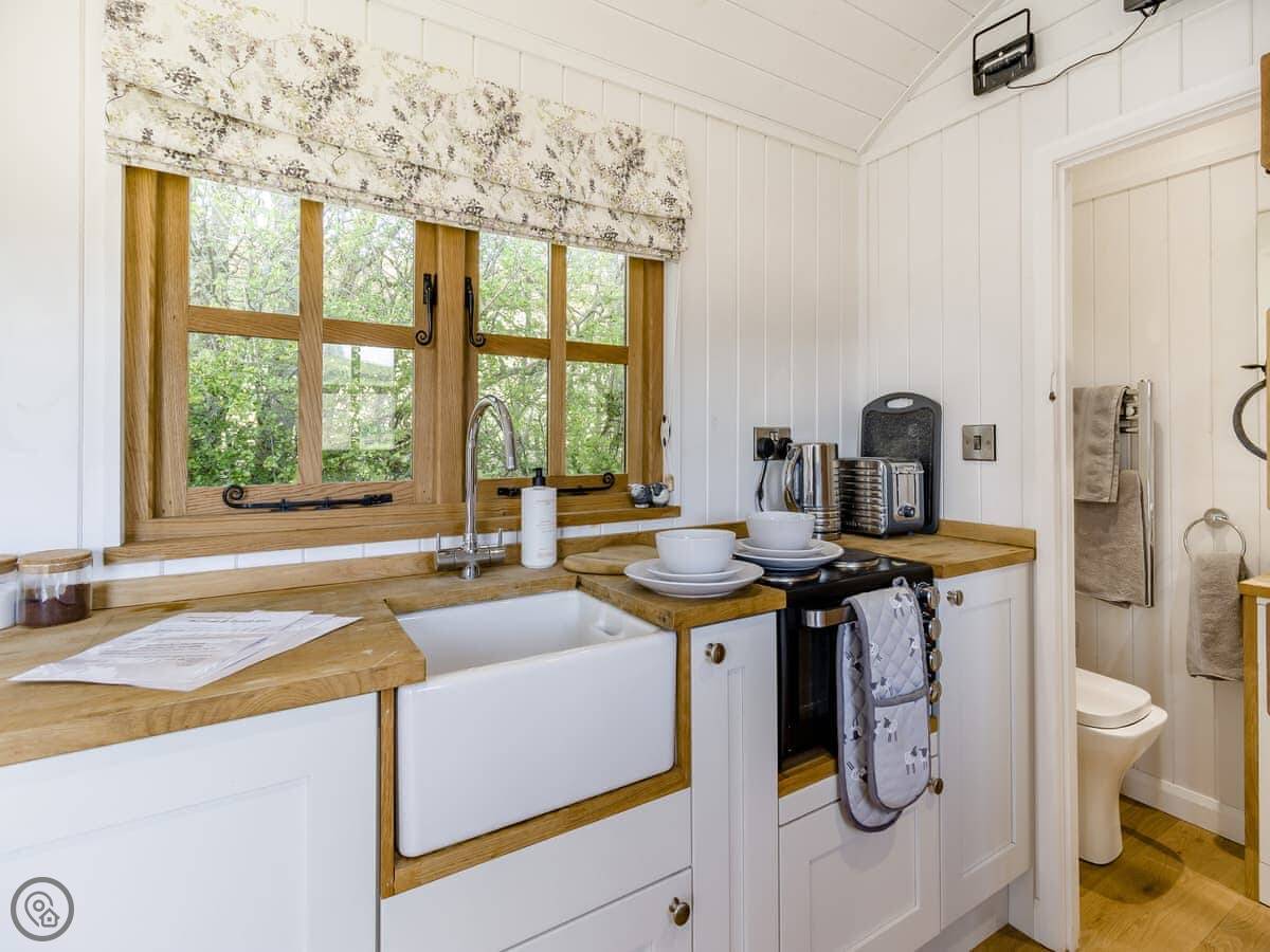 It's got a 4 Star rating. Everything's clean and it works. It's a hut, so the space is clever but compact. The bed's by a big window so you get the view when you wake up. There's a wood burner, and we provide logs for it. The kitchenette has what you need for simple meals. The bathroom is in a separate room at the end, with a toilet, sink and shower.