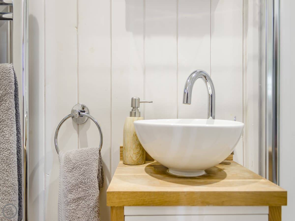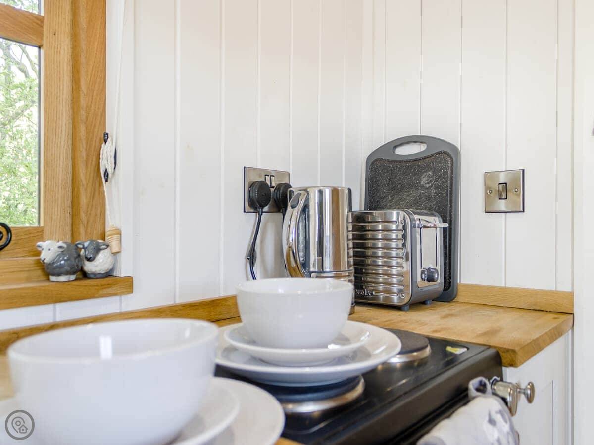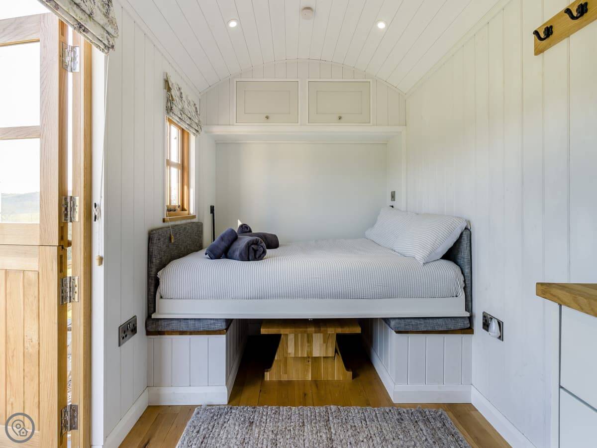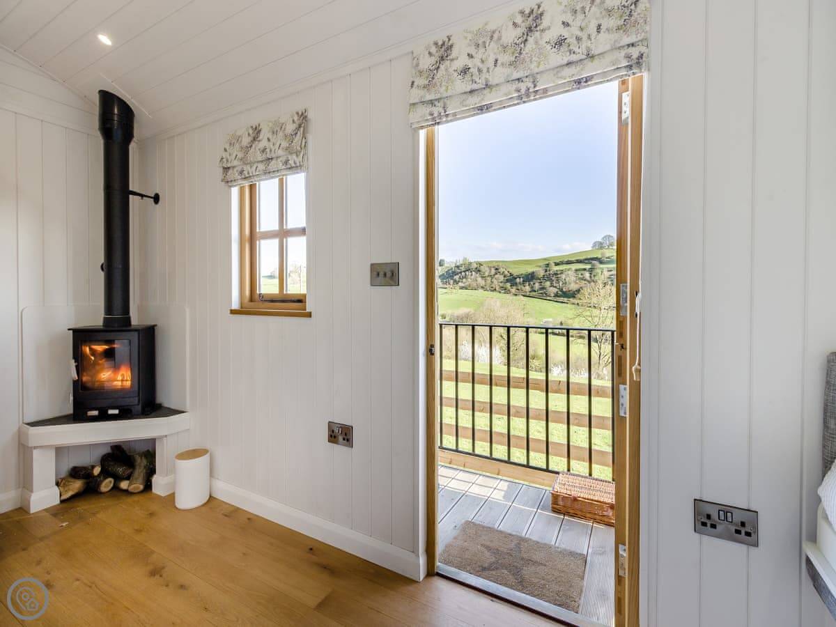 It's got a 4 Star rating. Everything's clean and it works. It's a hut, so the space is clever but compact. The bed's by a big window so you get the view when you wake up. There's a wood burner, and we provide logs for it. The kitchenette has what you need for simple meals. The bathroom is in a separate room at the end, with a toilet, sink and shower.