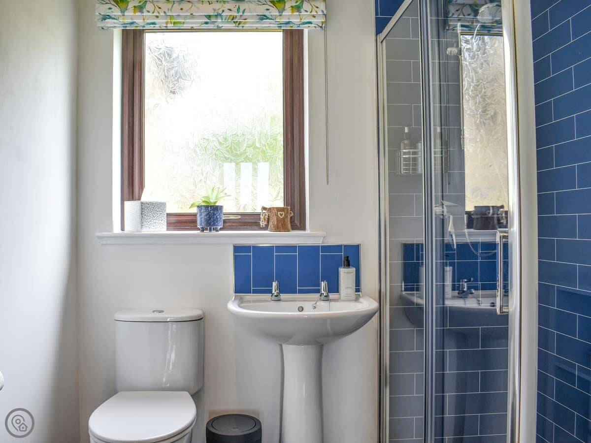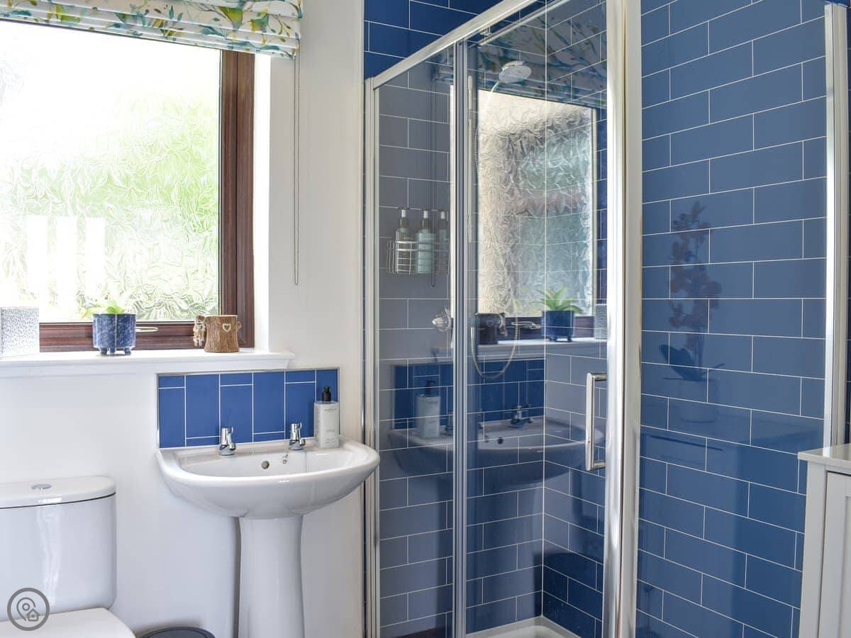 Inside, it's straightforward. Washing machine, TV, WiFi, that sort of thing. Bedding and towels are included. The shower is a walk-in one.