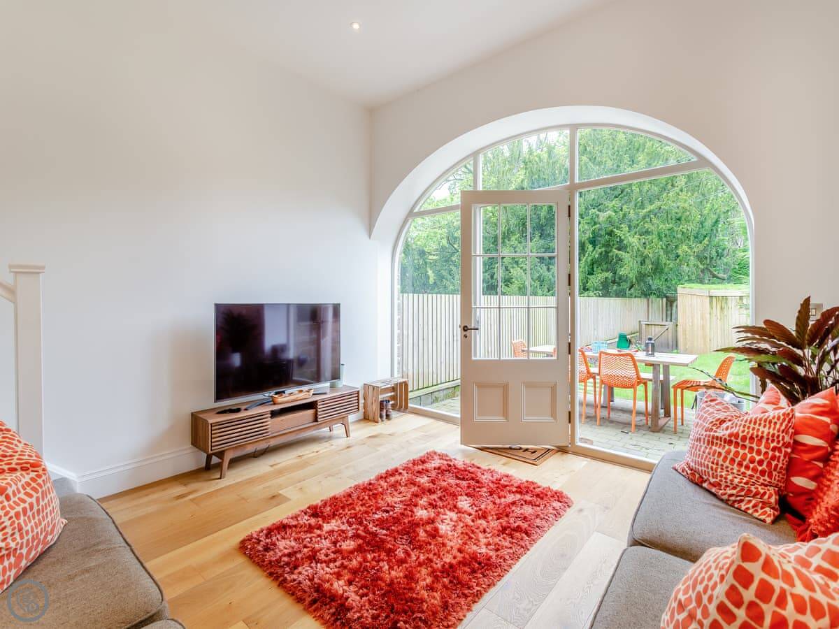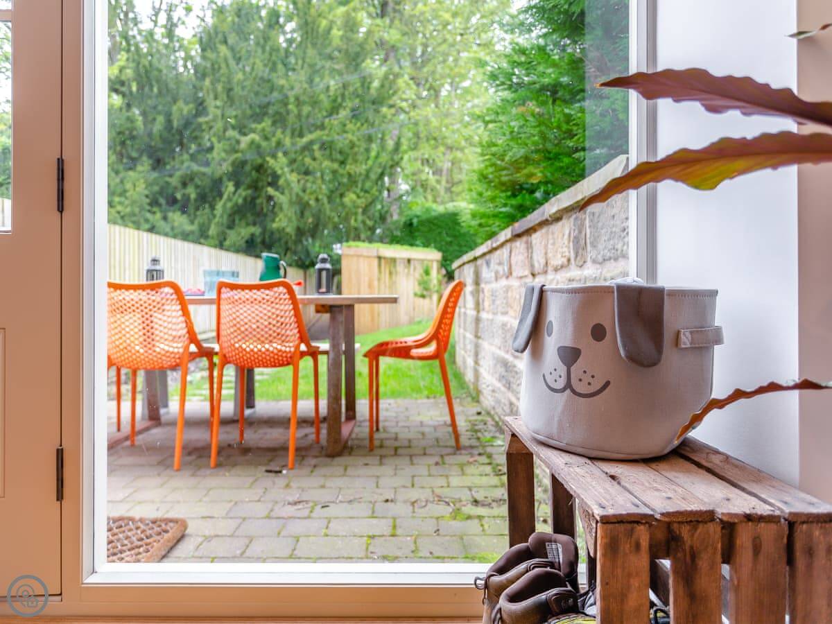 The garden is at the back, accessed from the main living room. It's a good size. There's a patio area with outdoor furniture and a barbecue.