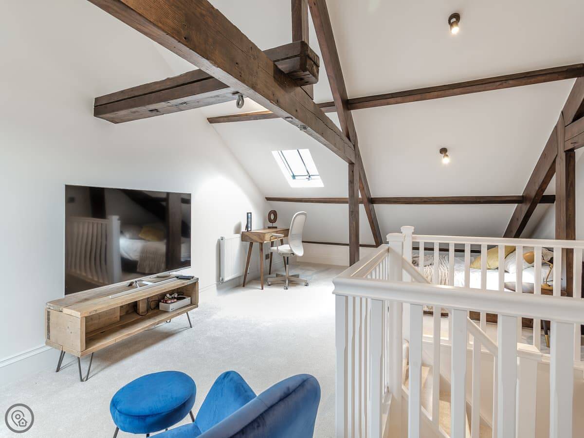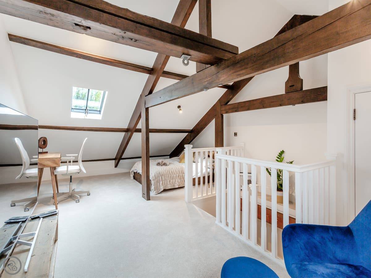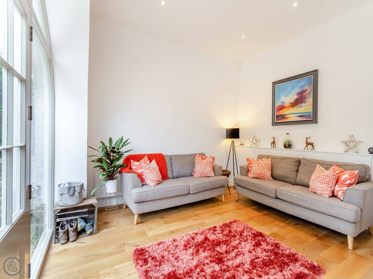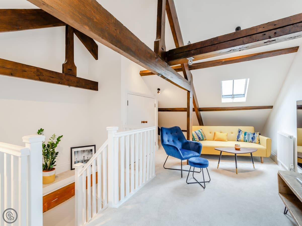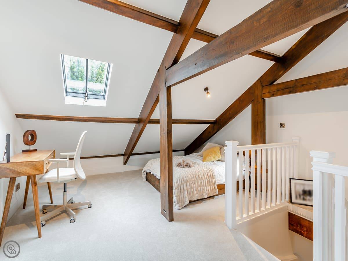 It sleeps eight people in four bedrooms. There are two bathrooms. It's got a 5 Star rating. The renovation is modern inside but the building still has some original features. The stairs are standard for an old mill, so they're a bit steep and go up three floors.