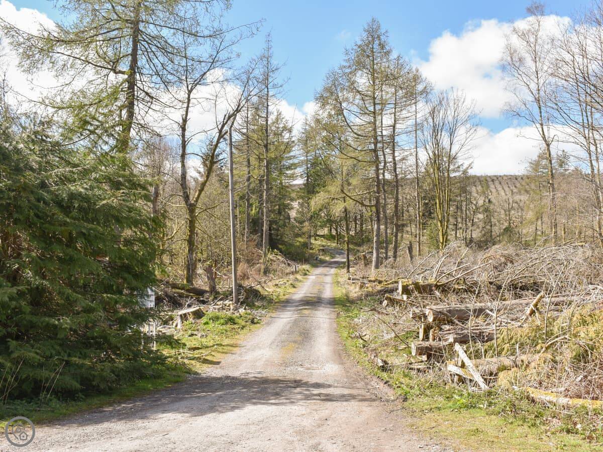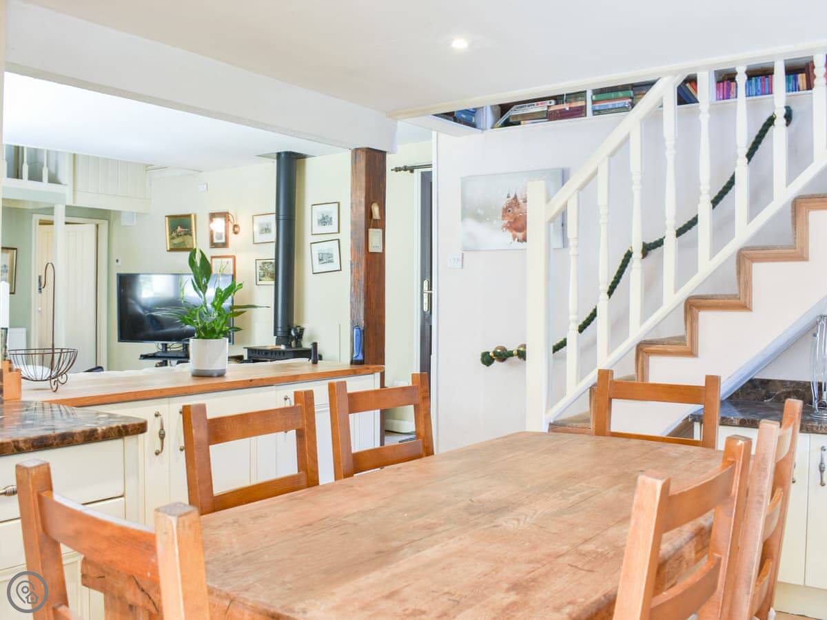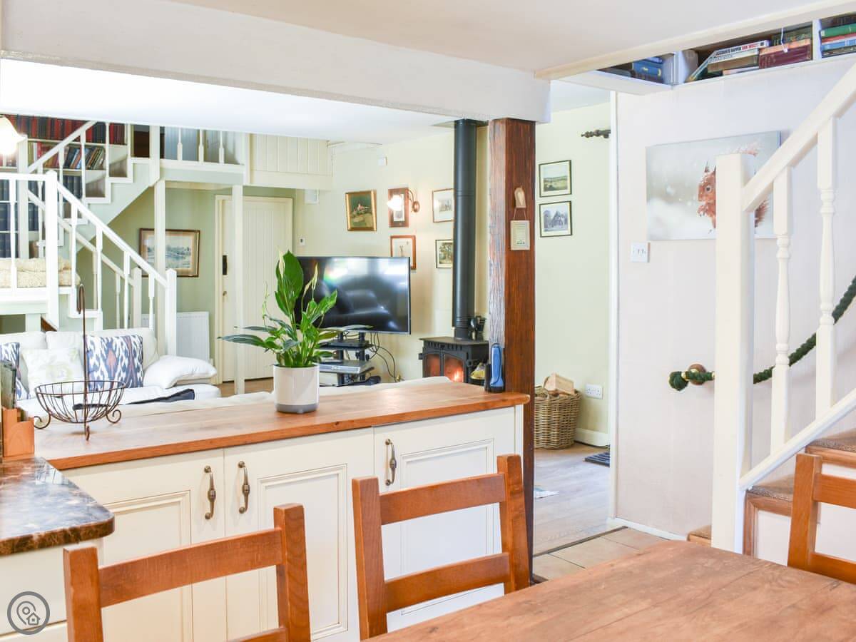 The main living space is open plan. There's a wood burner in the sitting area, a farmhouse table, and a kitchen. Patio doors lead out to a decked area. There's a conservatory off the kitchen which is a good spot to watch the squirrels. We leave food out for them and the birds. You'll see roe deer sometimes too.