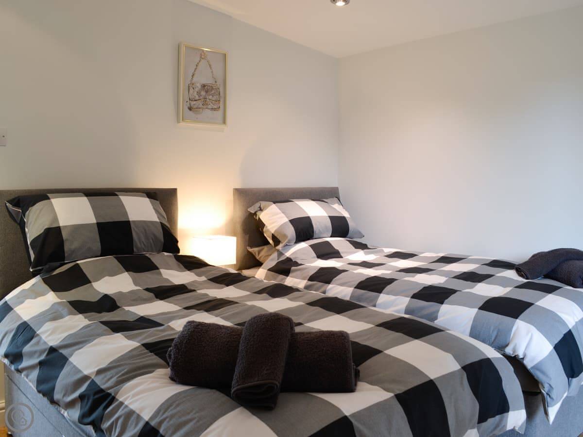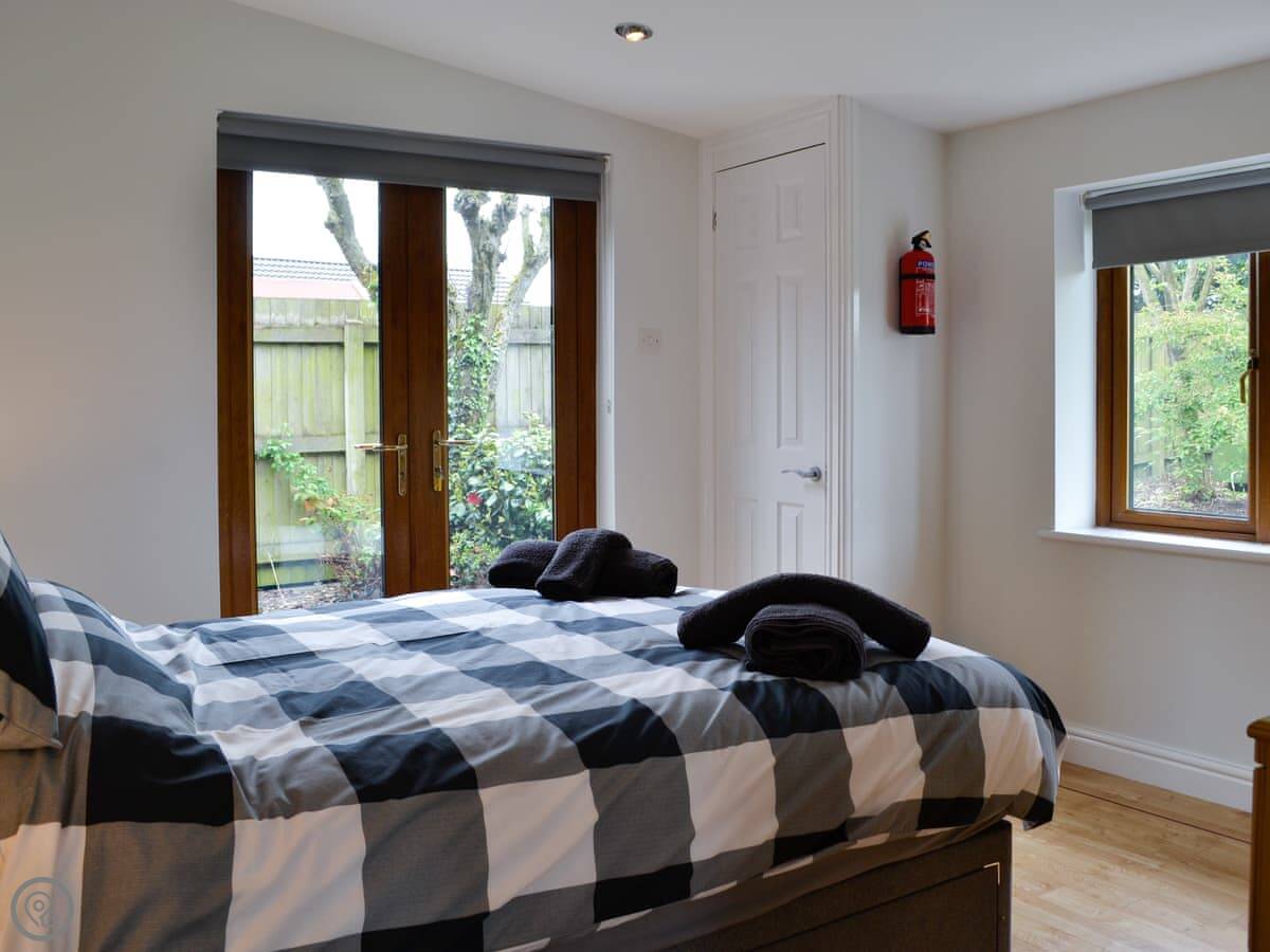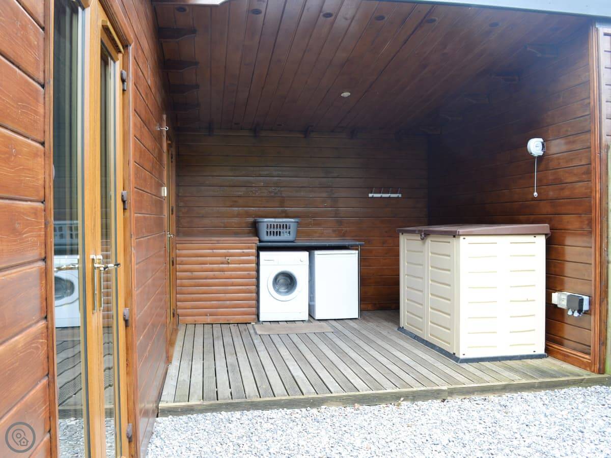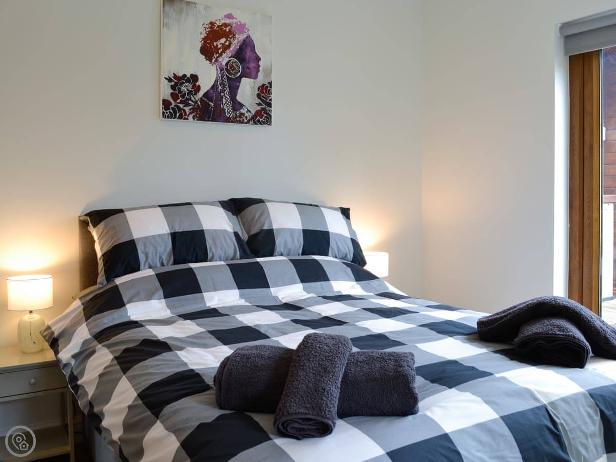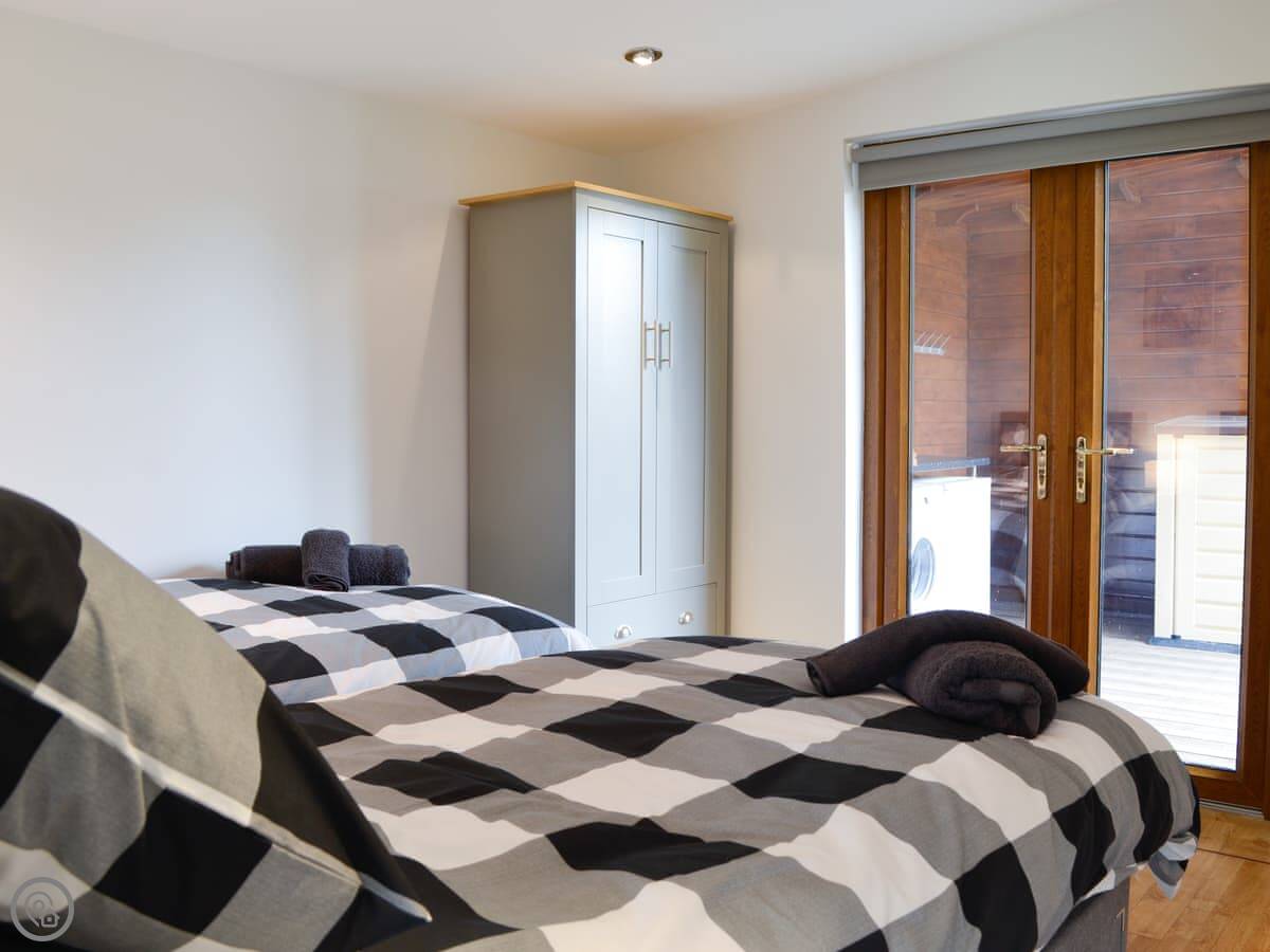 The lodge sleeps four. Two bedrooms, one shower room. It's got a 4 Star rating. It's modern and tidy inside. The main room is big and has floor-to-ceiling doors out to the garden, so it gets a lot of light. There's a cover outside the back door which is useful for muddy boots or wet coats.