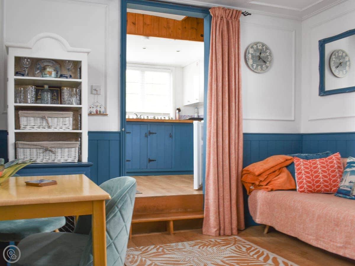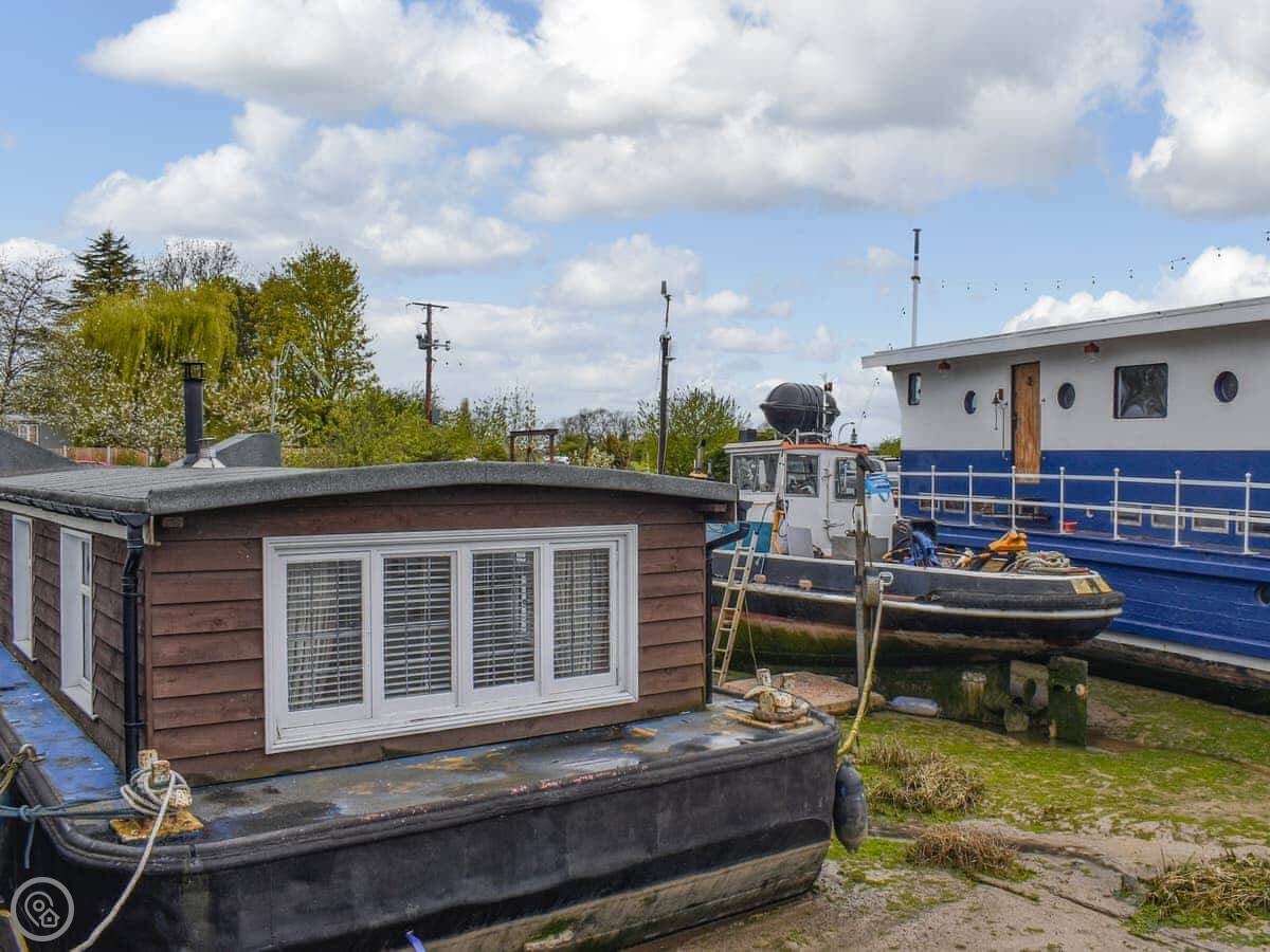 This is the House Boat at St Osyth. It's a boat you can stay on, moored in a yard on the creek. It sleeps two, in one bedroom.