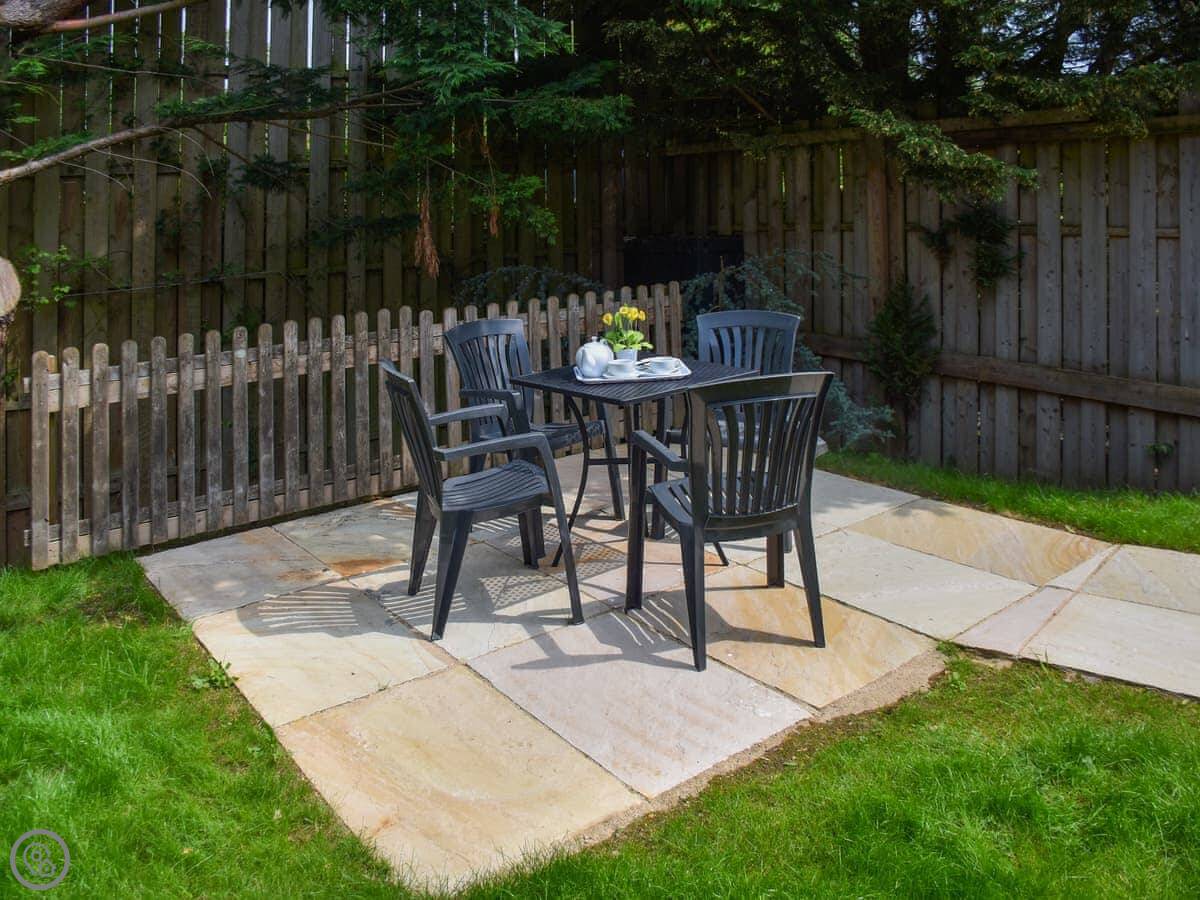 You get your own enclosed garden with patio furniture. French doors open out onto it.