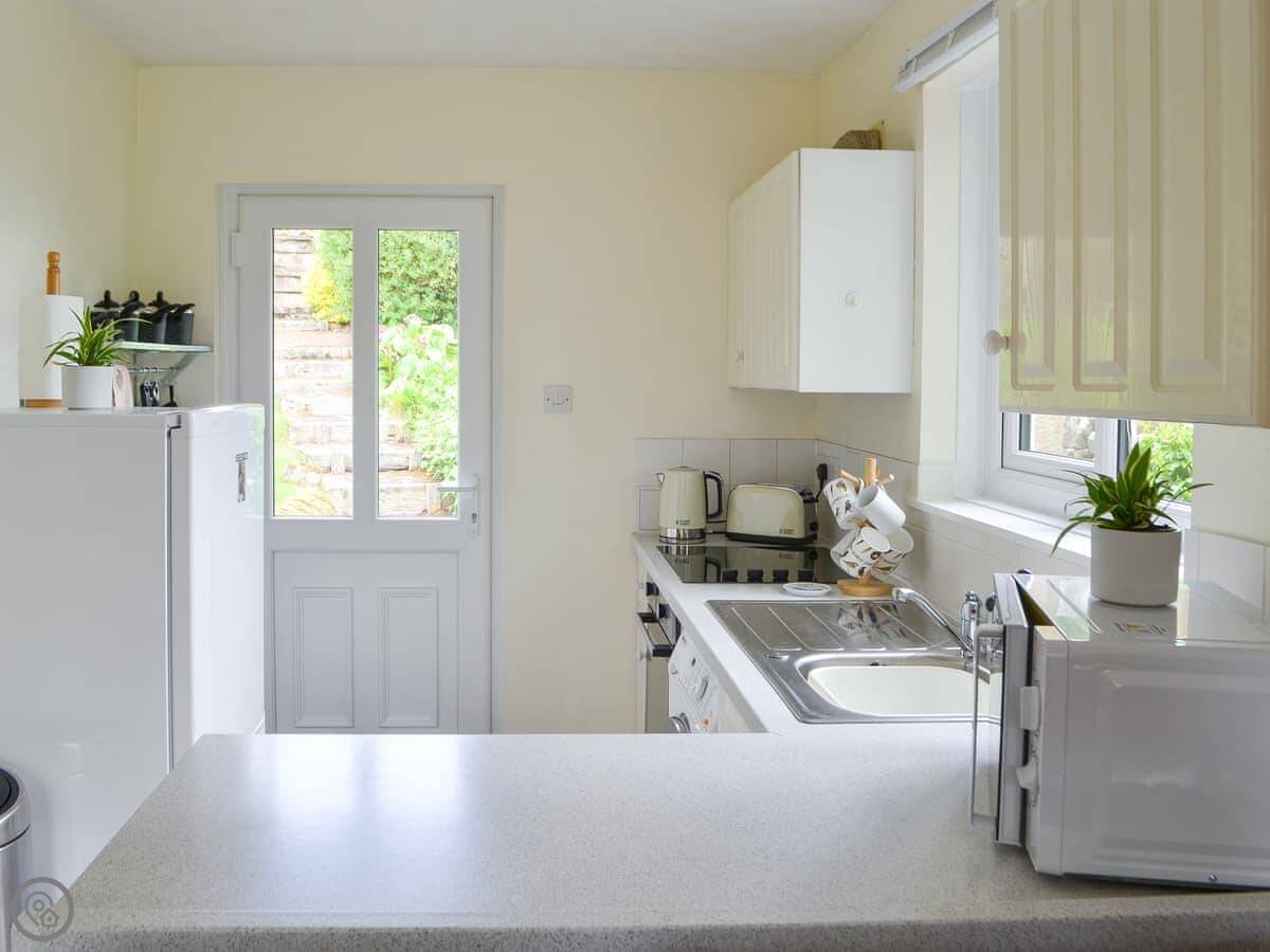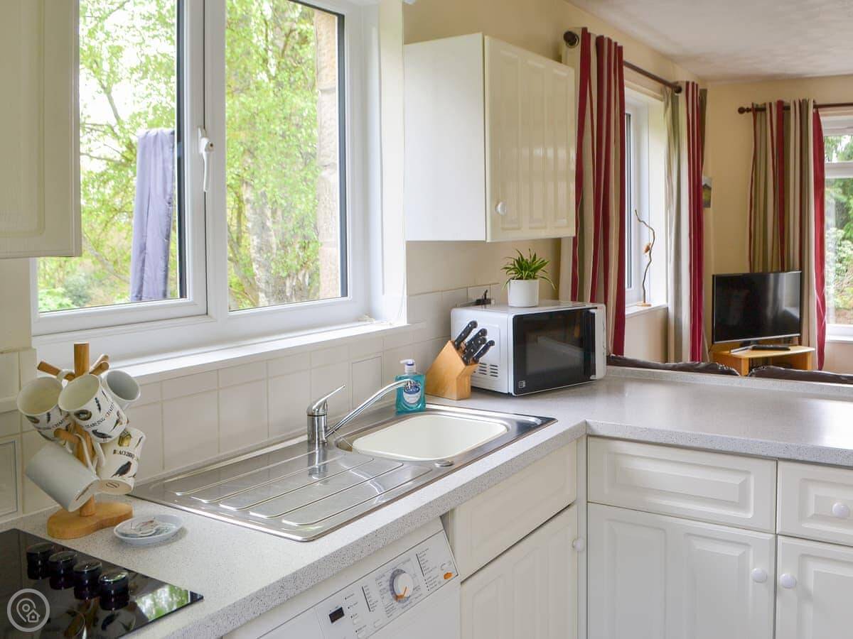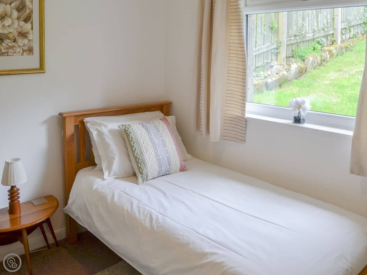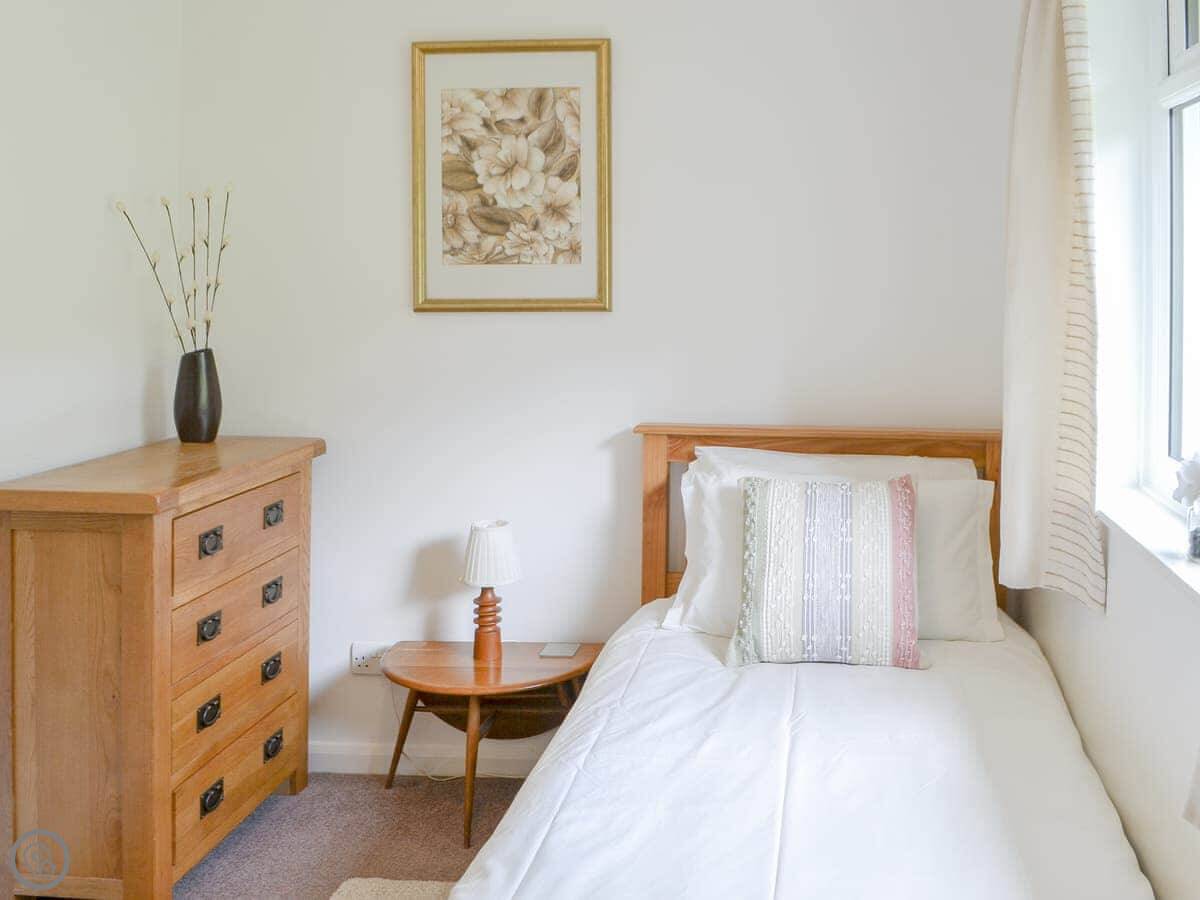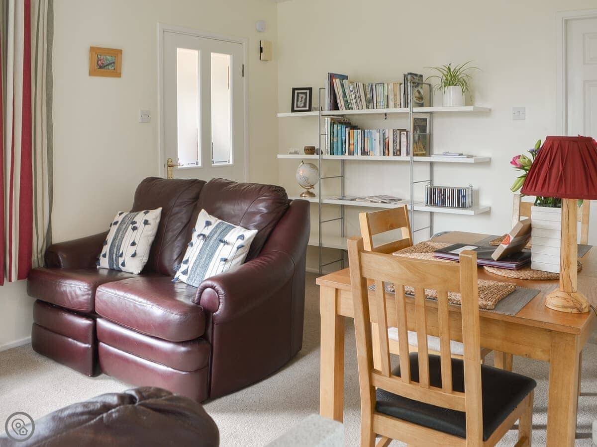 It sleeps three. There are two bedrooms, one double and one single, and one bathroom. Everything's on the ground floor. It's got a 4 Star rating. The living area is open plan with the kitchen.