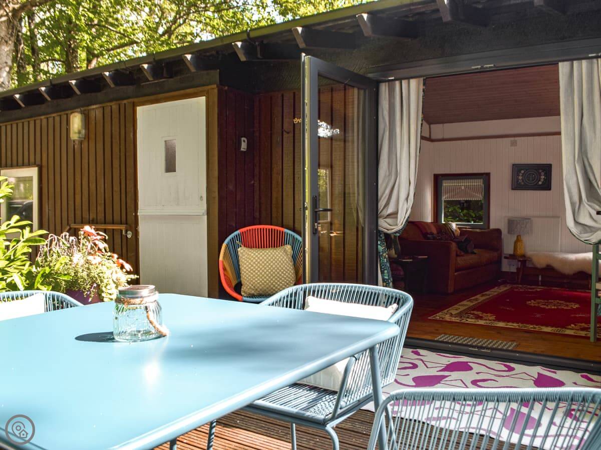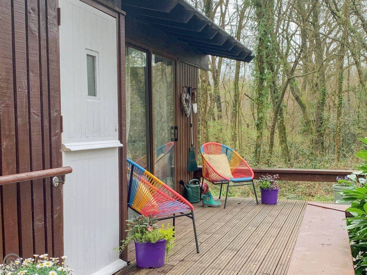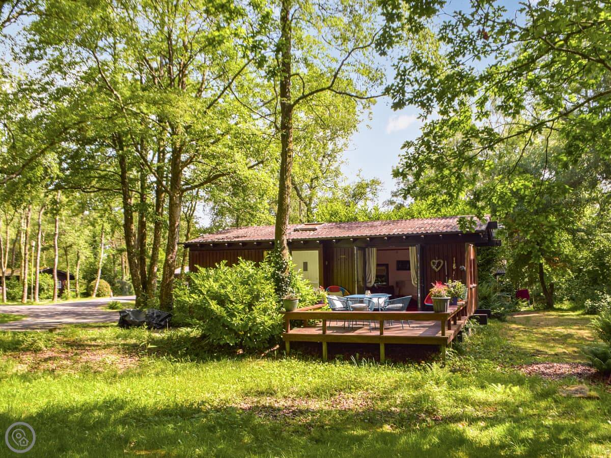 The Cabin is on Penlan Holiday Village in Glandwr, Carmarthenshire. It's a detached wooden cabin on a quiet, wooded park. You'll hear birds.