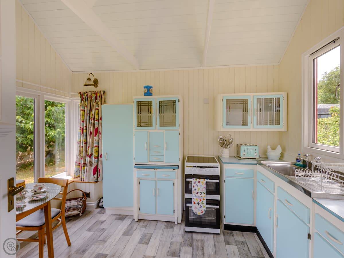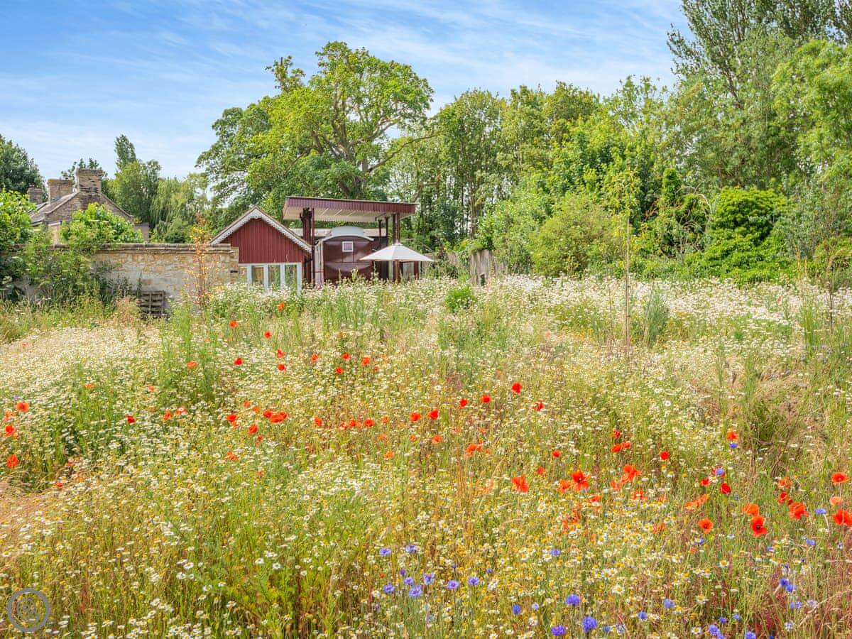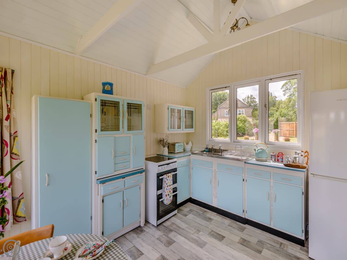 It's quite old fashioned inside, from around 1917, but everything works fine. The bed is comfortable. There's a separate kitchen hut from the 1950s for making breakfast and things. You can eat outside there, looking over the wildflower meadow. We get muntjac deer in there. You can walk around the paths if you like.