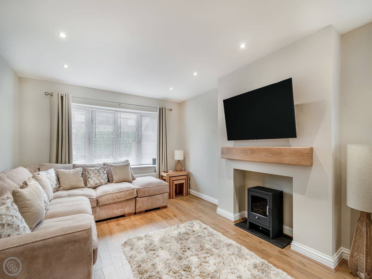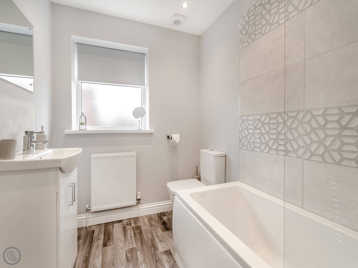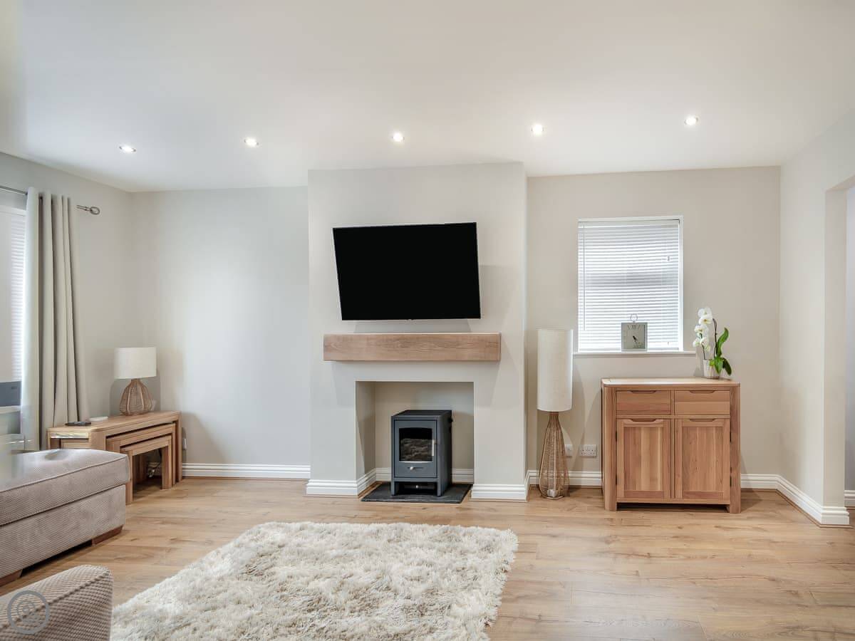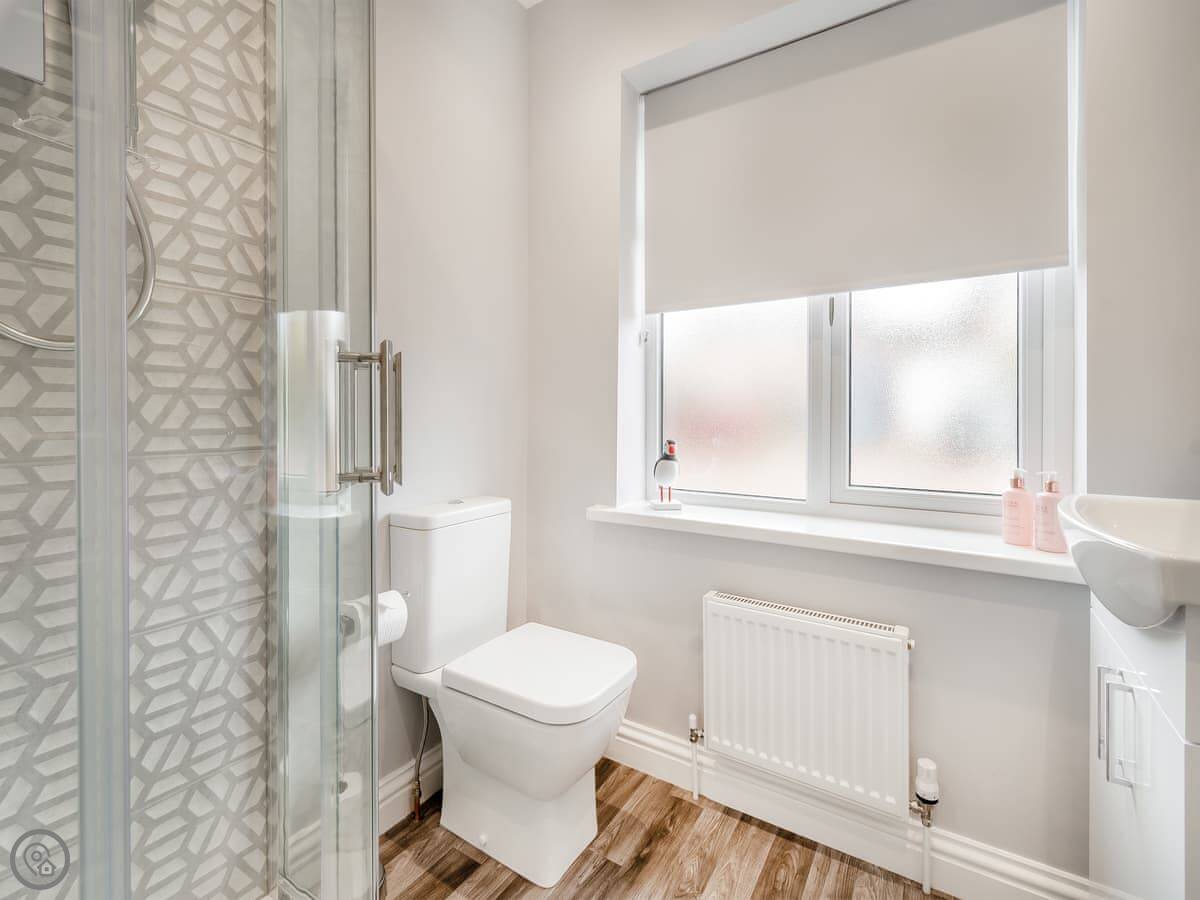 The ground floor offers open plan living that is spacious and airy. The living area provides a large L shaped sofa and an armchair. A Smart TV with Netflix will provide your entertainment whilst an electric woodburning stove will provide a warming ambience during the cooler winter months. A wide archway leads through to the kitchen/dining area. The deep blue kitchen offers a host of modern appliances including a gas hob, electric oven, dishwasher, and a slow cooker. There is even a toastie machine for a quick lunchtime snack which can be enjoyed at the breakfast bar. There are long runs of work top space for preparing delicious home cooked meals which can be enjoyed at the farmhouse style table which sits close by. This room is flooded with natural light from the French doors which lead out into a sunroom. Here you will find additional seating as well as garden access. The ground floor accommodation is completed by a house shower room and toilet.