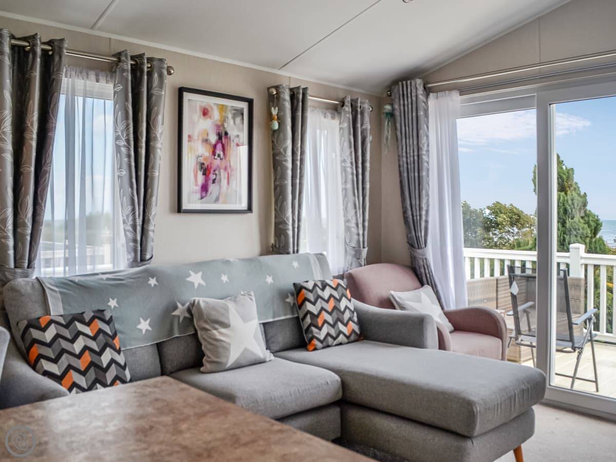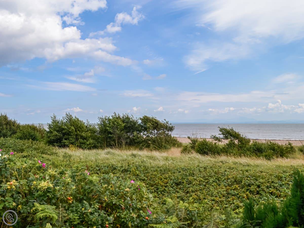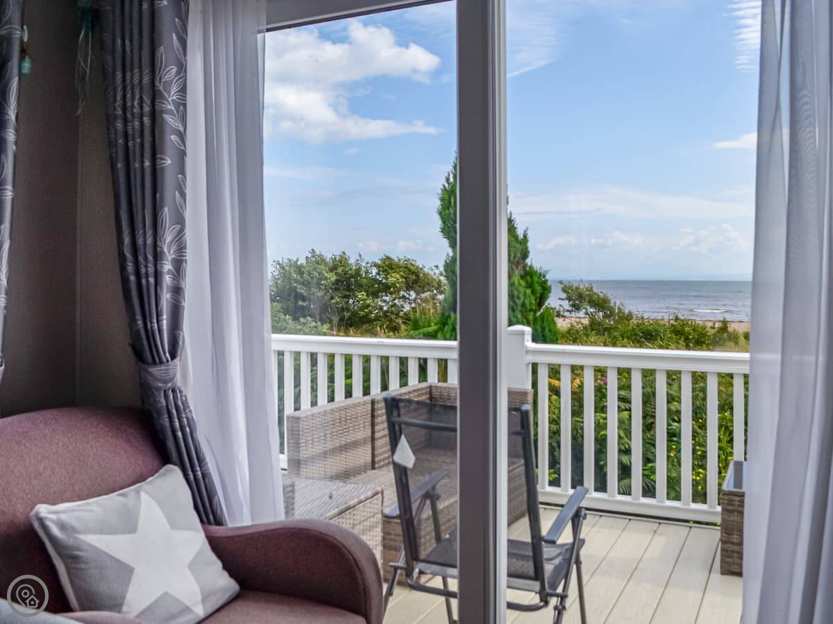 The main thing is the view. It's right there, across the Solway Firth to the Lake District hills. You can see it from inside through the big patio doors. There's decking all the way around so you can sit outside.