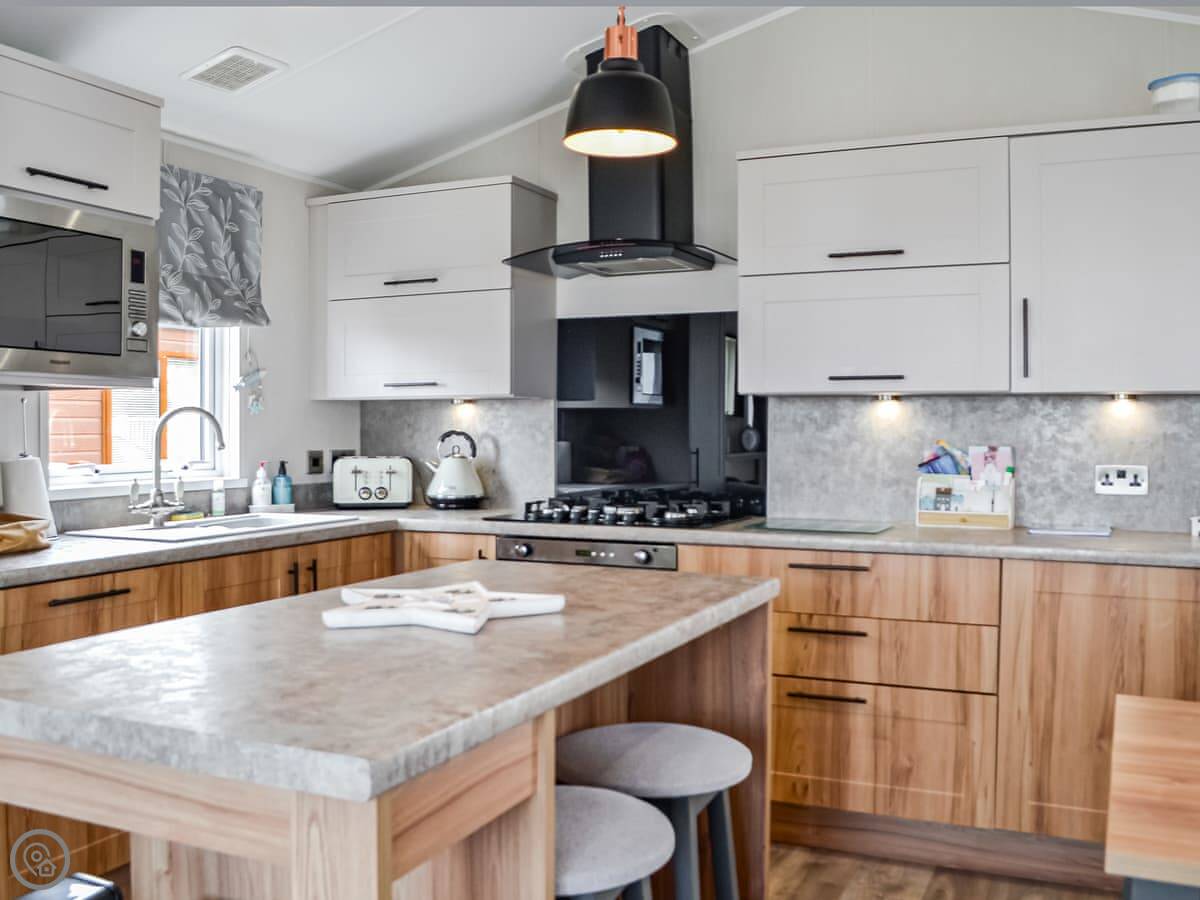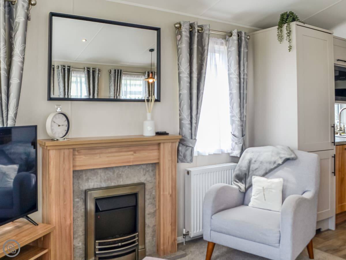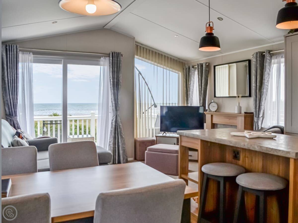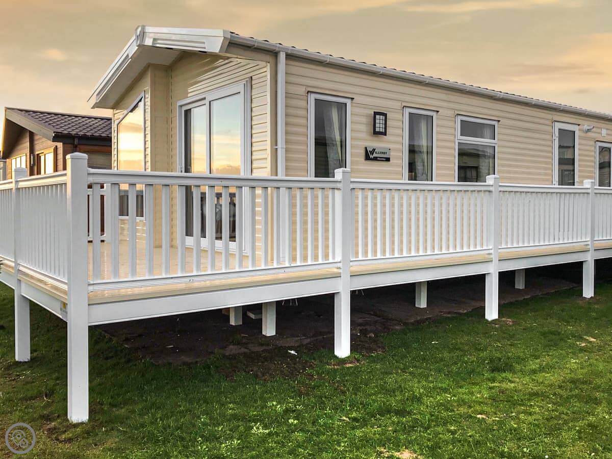 The main thing is the view. It's right there, across the Solway Firth to the Lake District hills. You can see it from inside through the big patio doors. There's decking all the way around so you can sit outside.