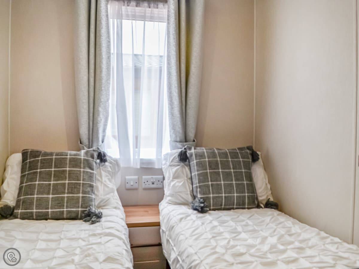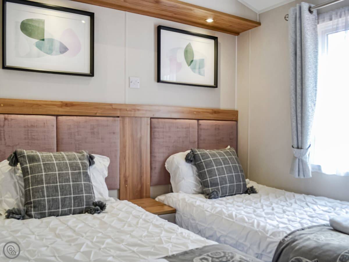 Beeches Bay is a lodge on that big holiday park up past Southerness. It's detached, which is nice, so you're not sharing a wall. It sleeps six, with three bedrooms and one bathroom. It's a 4 Star place, so it's comfortable and well looked after.