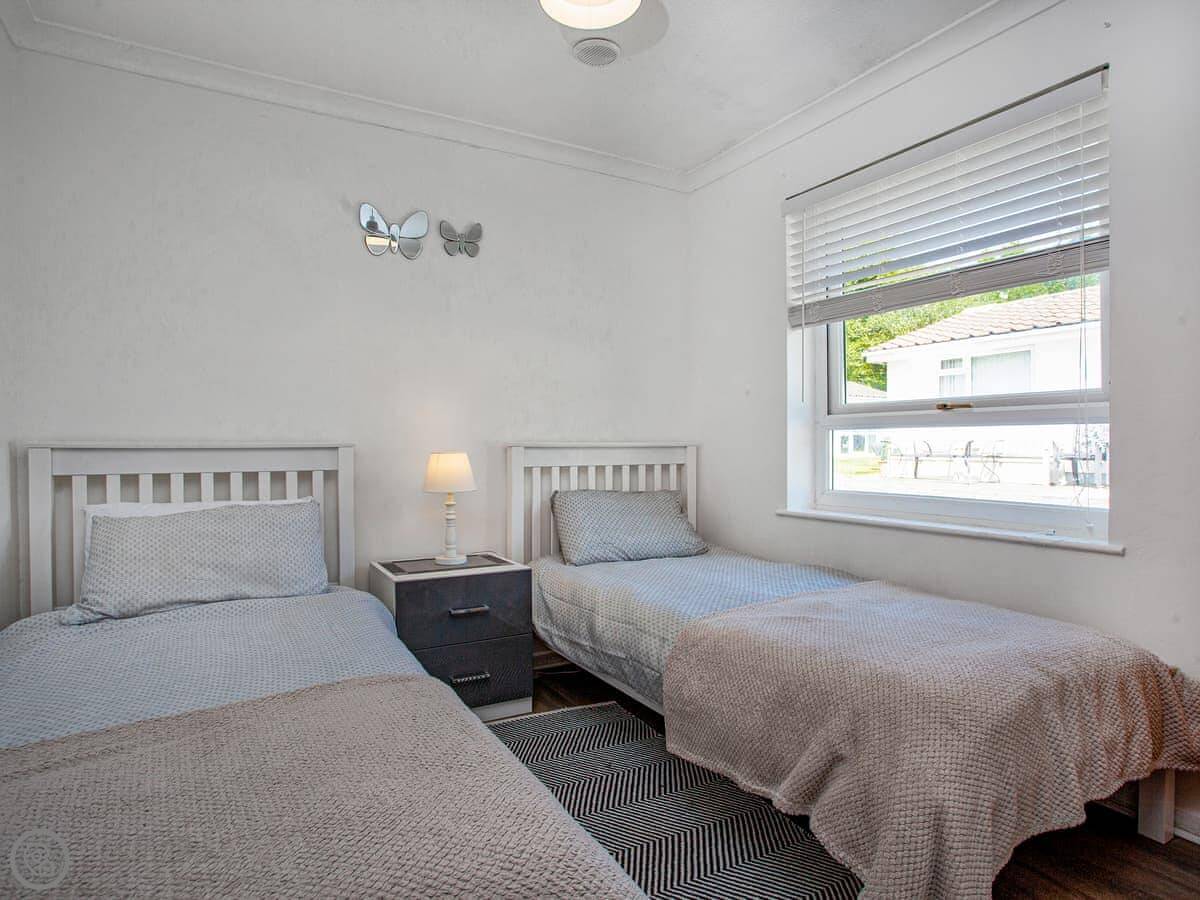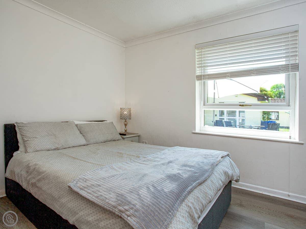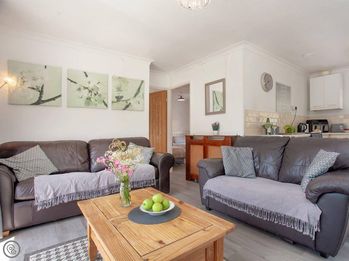 It’s a two bedroom bungalow, sleeps four. One double and one twin. There’s one bathroom with a bath and an electric shower over it. It’s a 3 Star place, so it’s clean and has what you need, but don’t expect anything fancy. The open plan living area is bright. You get your own parking spot right outside.