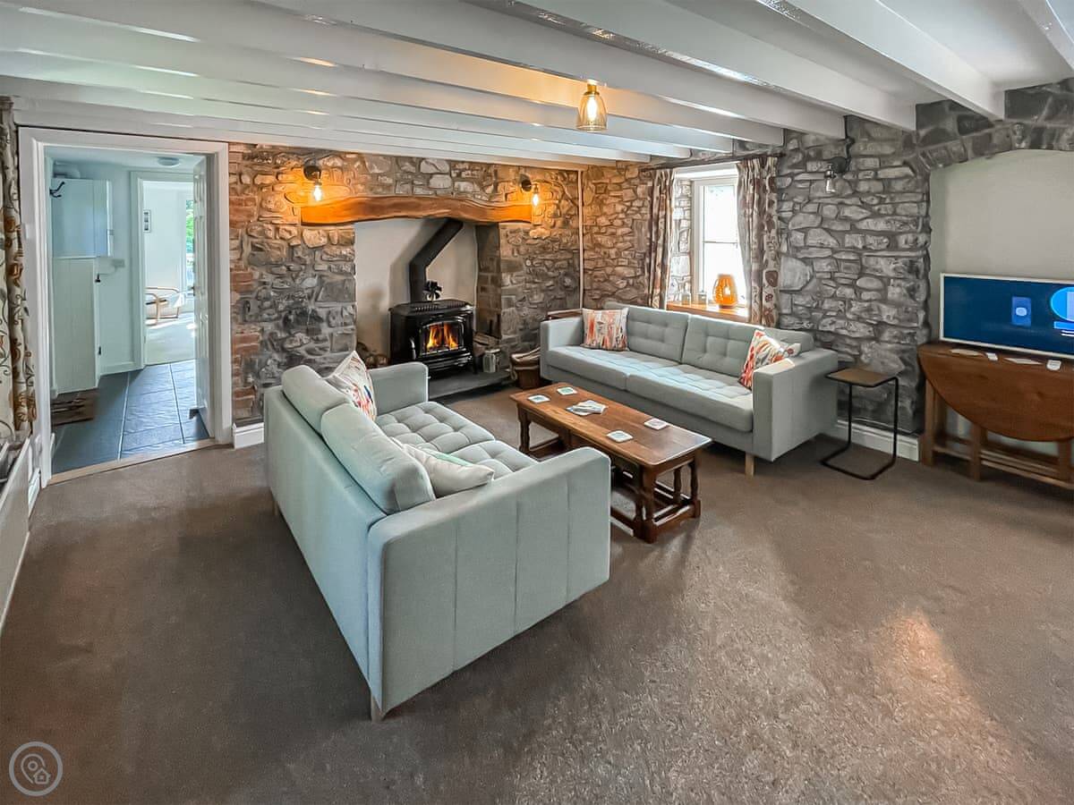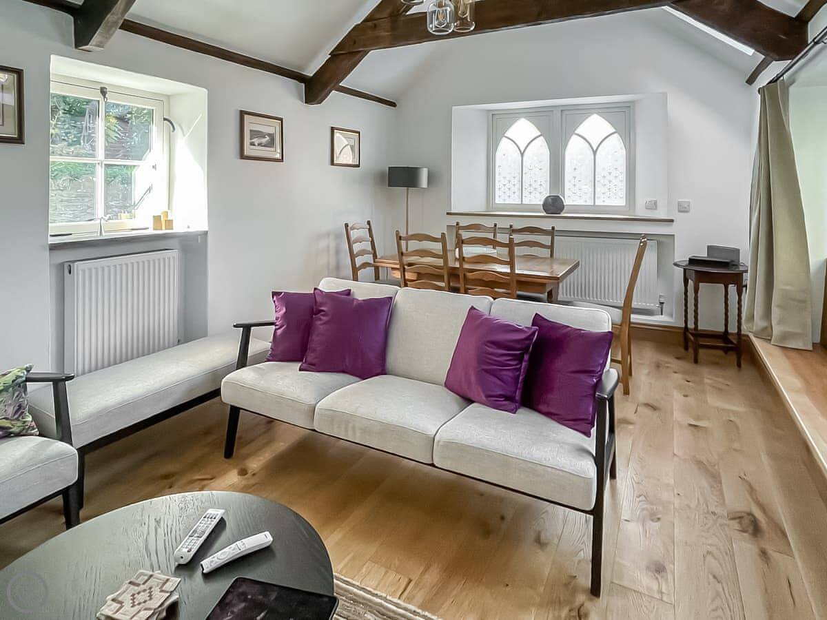 Inside, it’s been restored but keeps the old features like beams and stone walls. The stairs are normal cottage stairs. The living room has a wood burner. The kitchen is through there and it’s got everything you’d need. The dining room is down three steps from the kitchen, so mind your head on the beam if you’re tall.