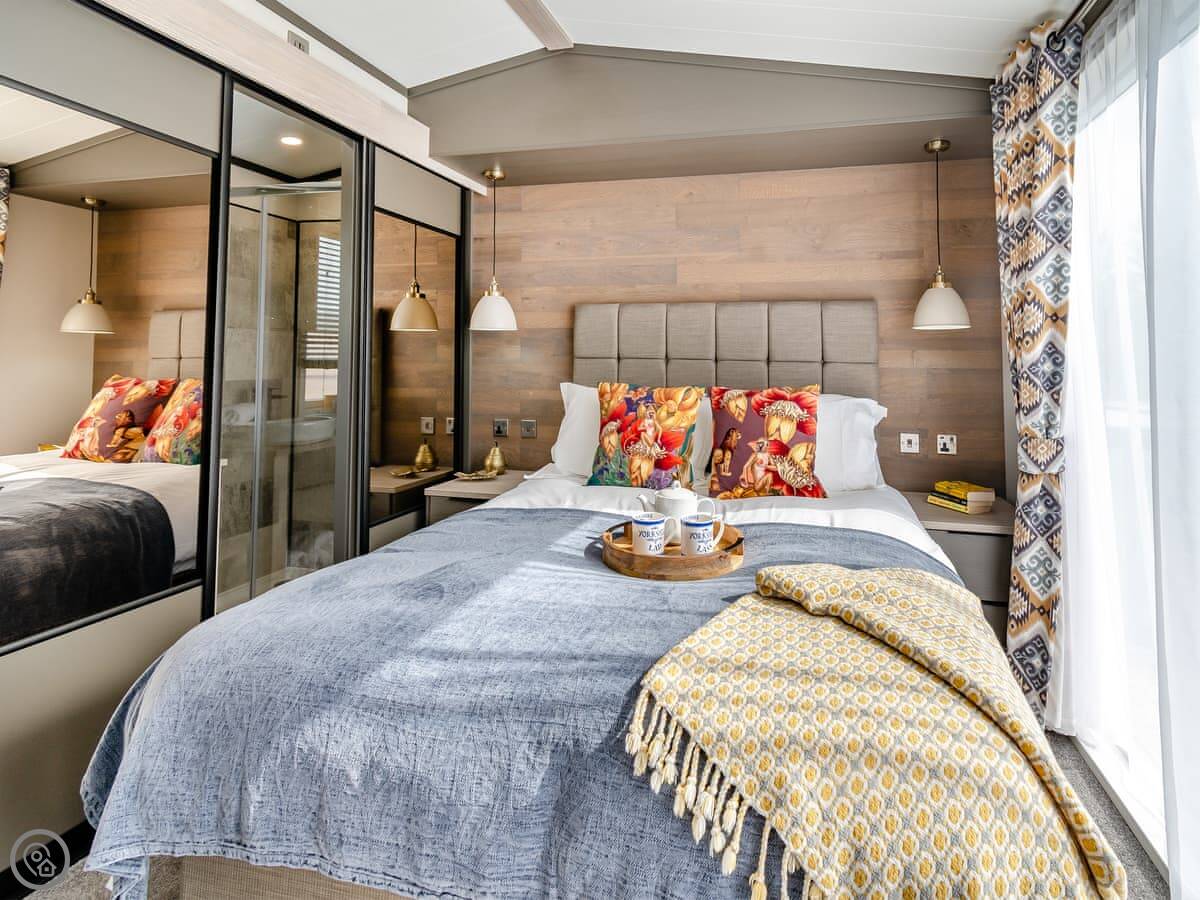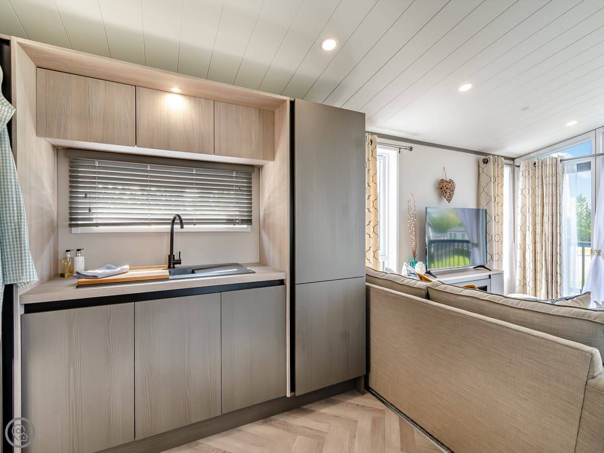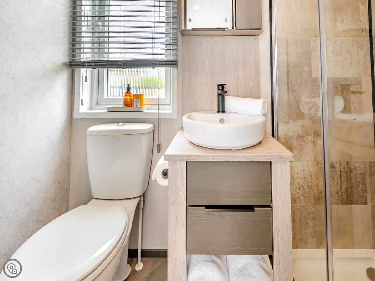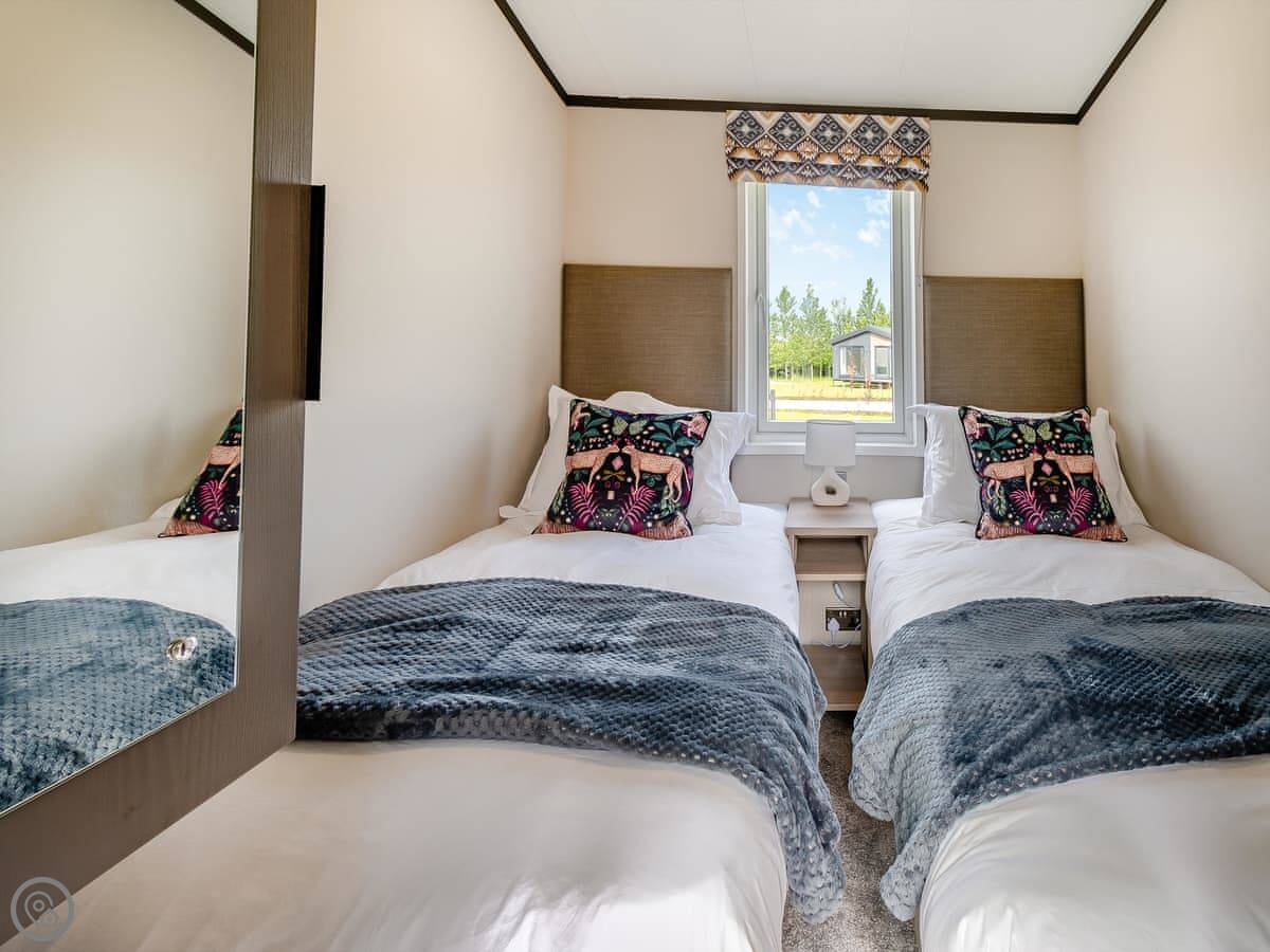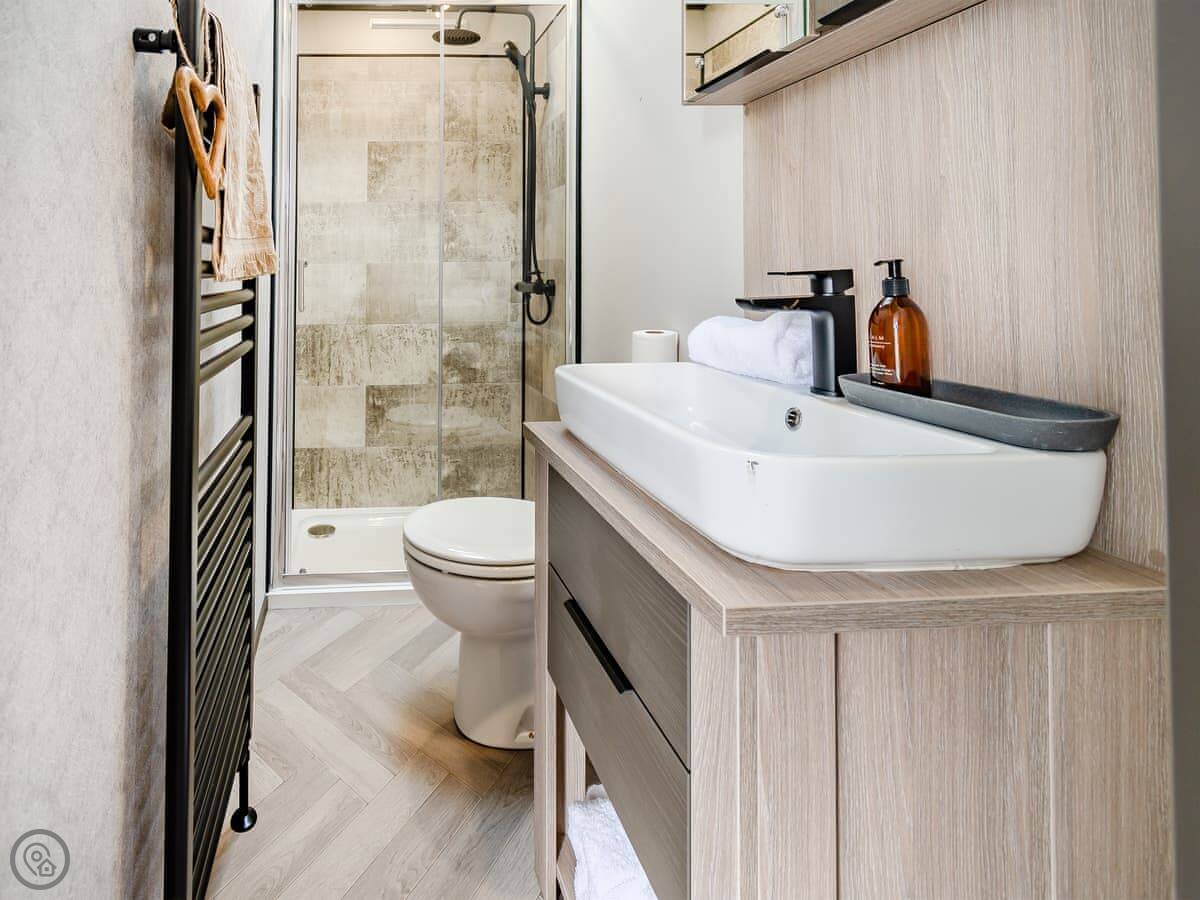 You walk in into an open plan living area. It's a decent space to come back to. The kitchen has what you need, including a dishwasher. There's a dining table for four. The main bedroom has a kingsize bed and an ensuite shower room. The second bedroom has twins. There's another bathroom with a shower.