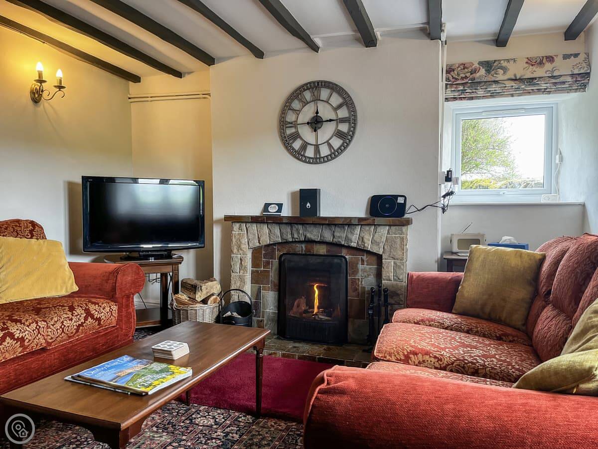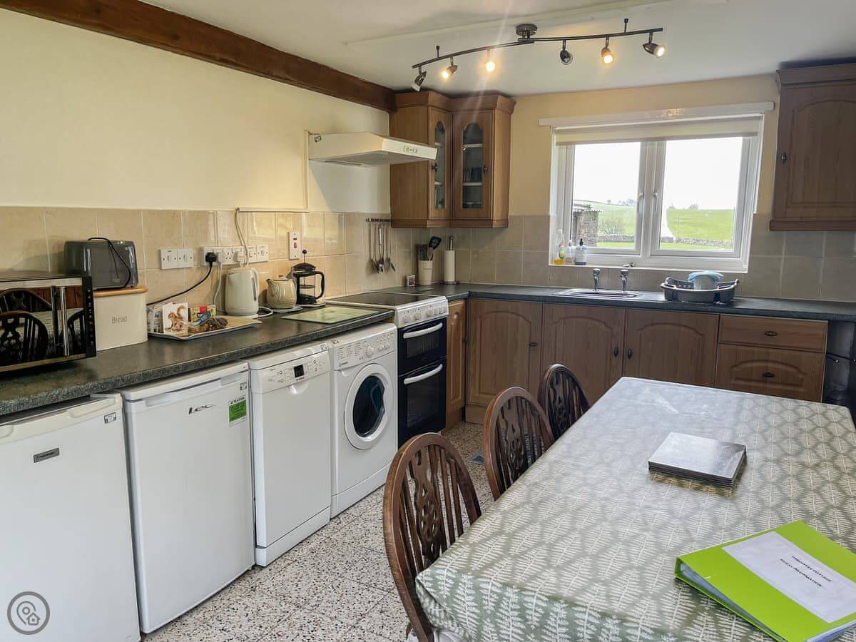 Inside, it's traditional. The stairs are cottage stairs. There's an open fire in the living room. The kitchen has what you need, including a dishwasher and a washing machine. Bedding and towels are included. There's WiFi and a TV.