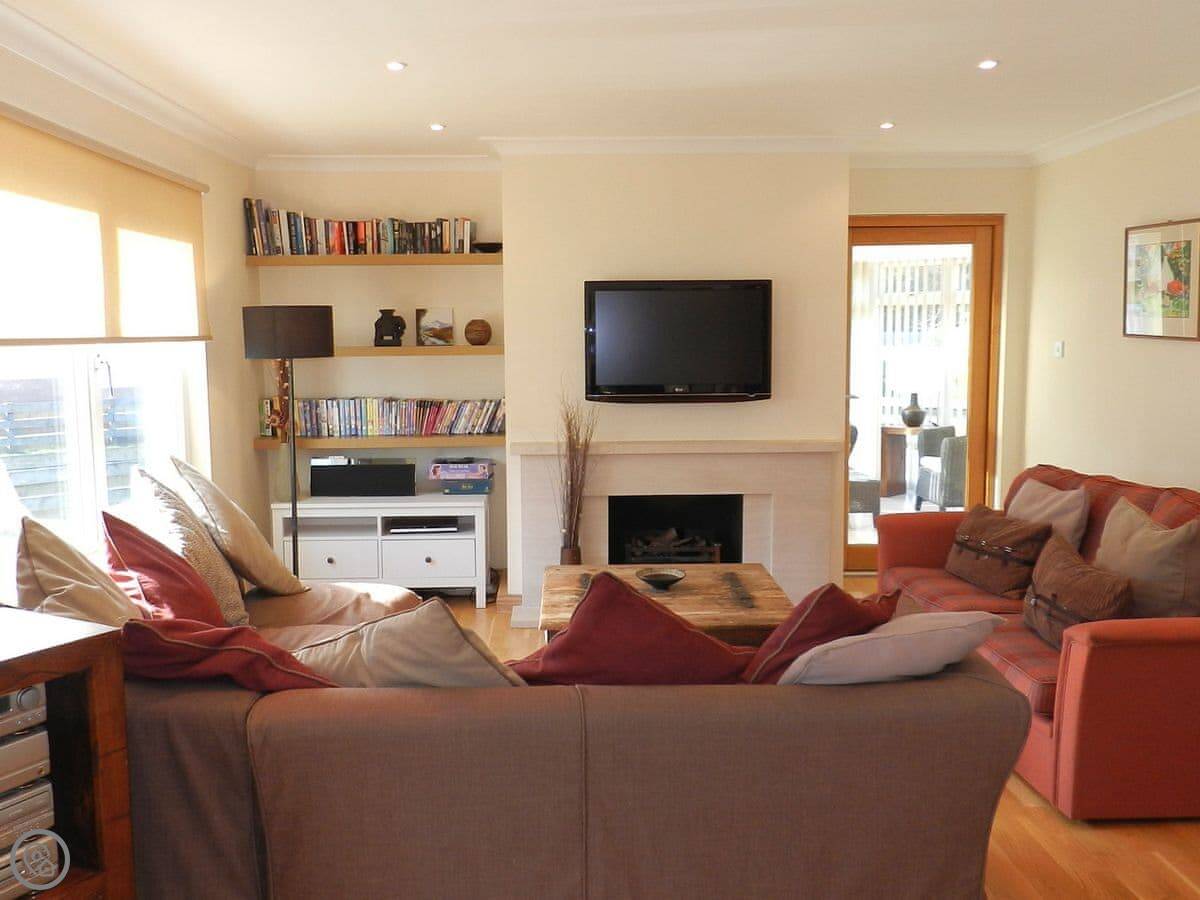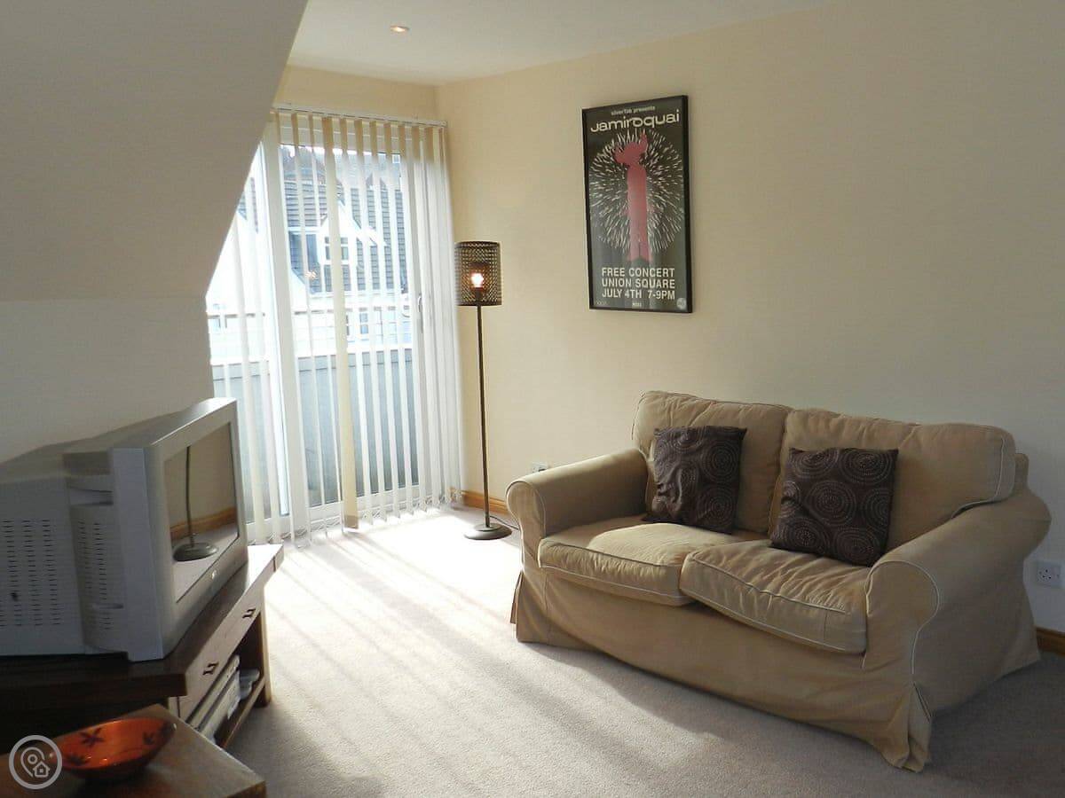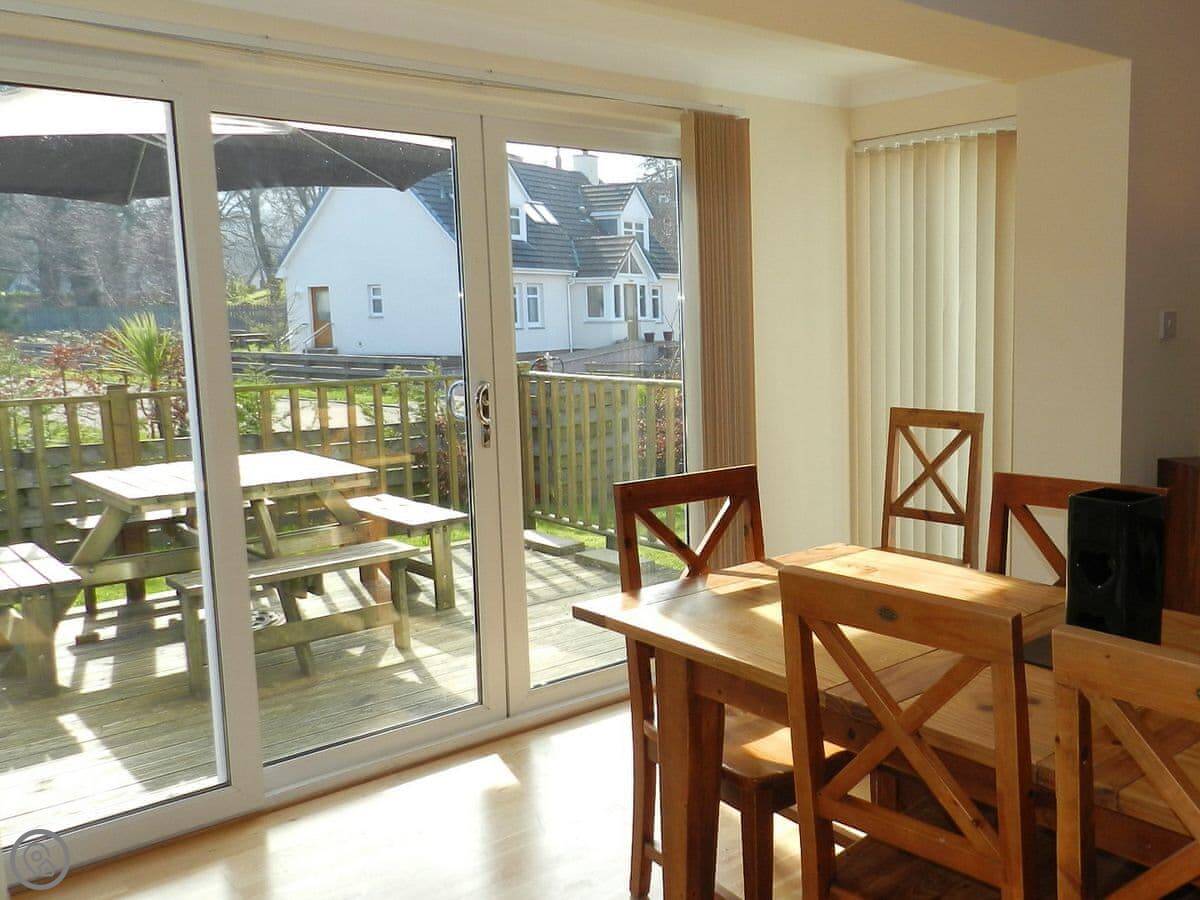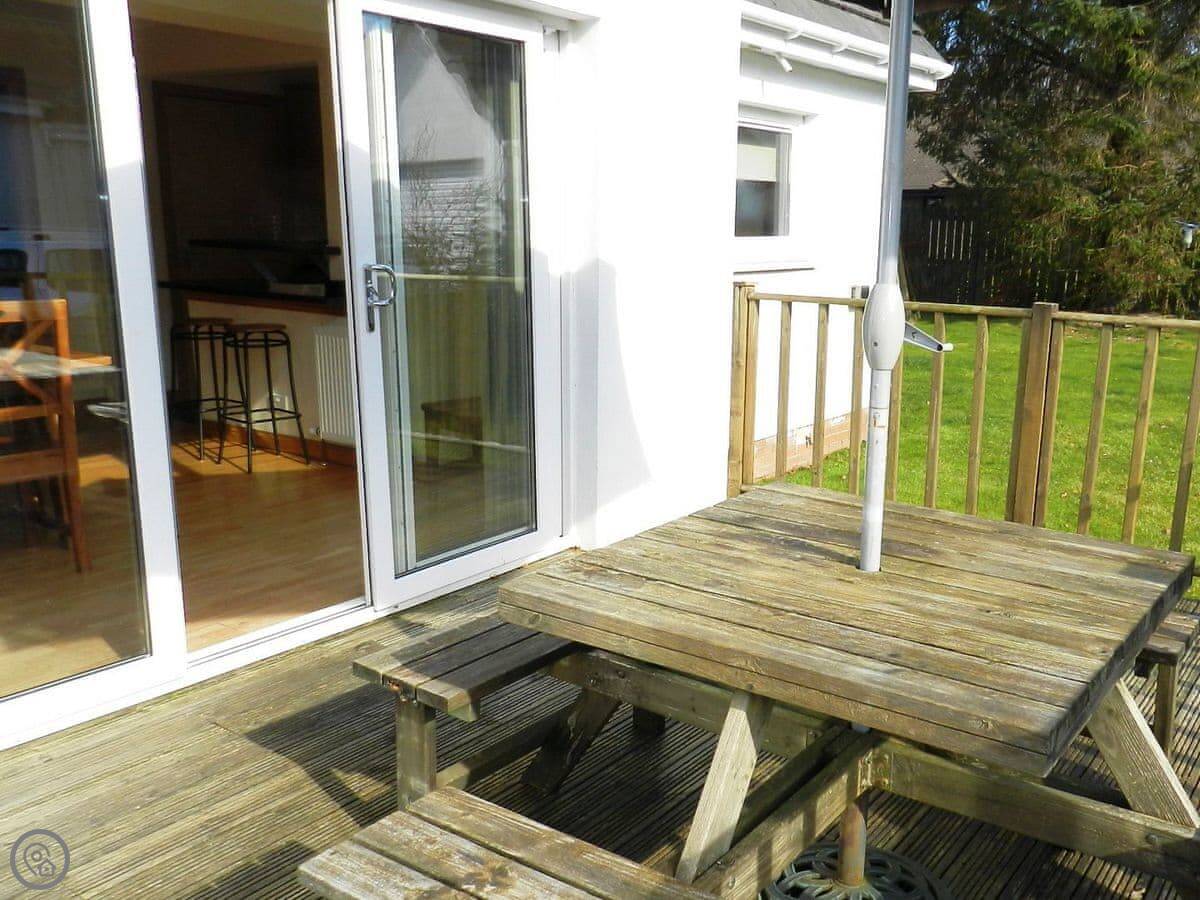 The main living area is open plan. The kitchen has a small breakfast bar. French doors lead out to a deck with a table. The garden is enclosed, which is good if you have a dog or kids.