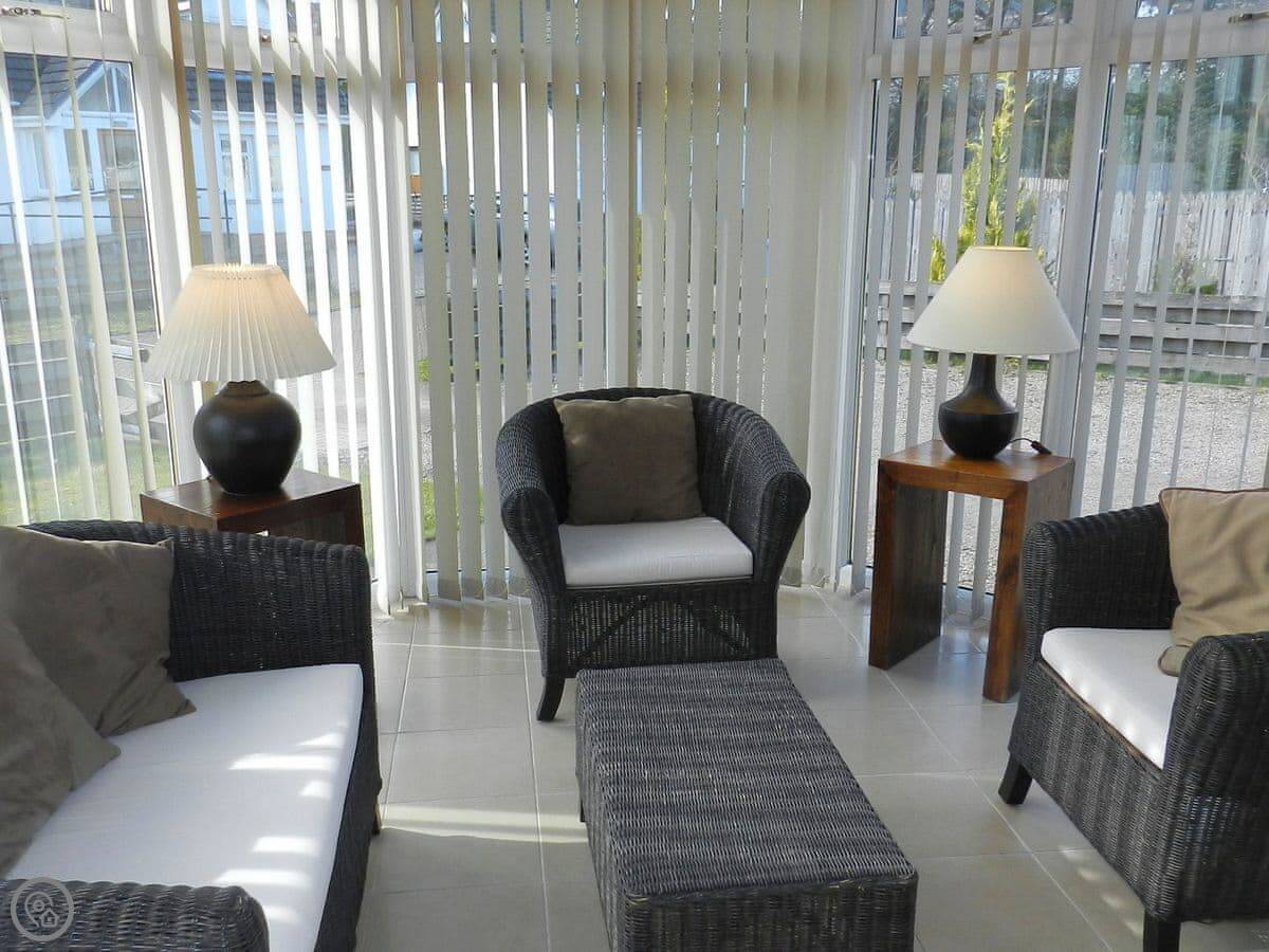 Upstairs, there's a big landing area with sofas and a TV. It leads out to a balcony. The kids tend to claim that space. There's also a conservatory that gets very warm when the sun's out.