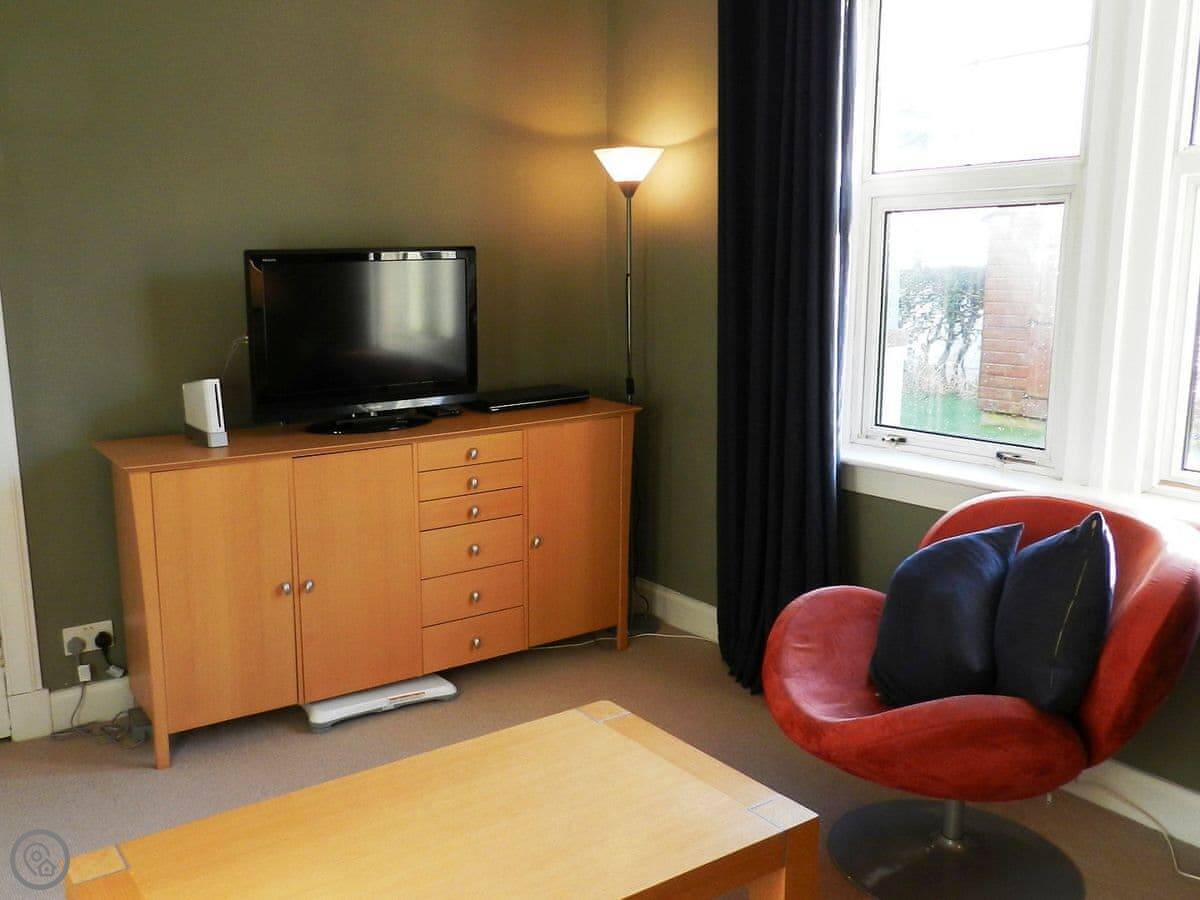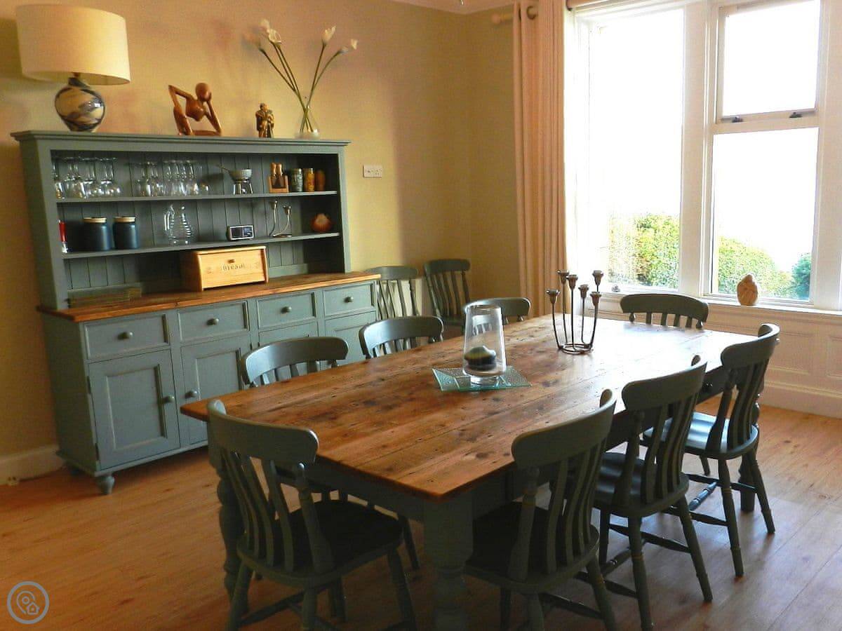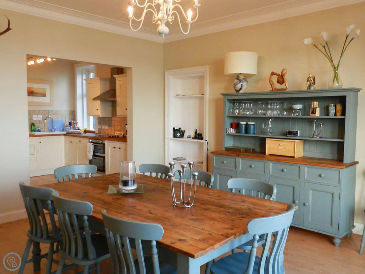 The main living room has big windows so you can see the water. There's a separate smaller snug with a TV and an old Wii, which is handy if kids want their own space. The dining table is large enough for everyone.