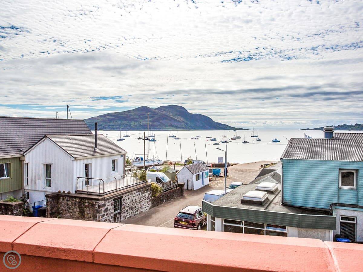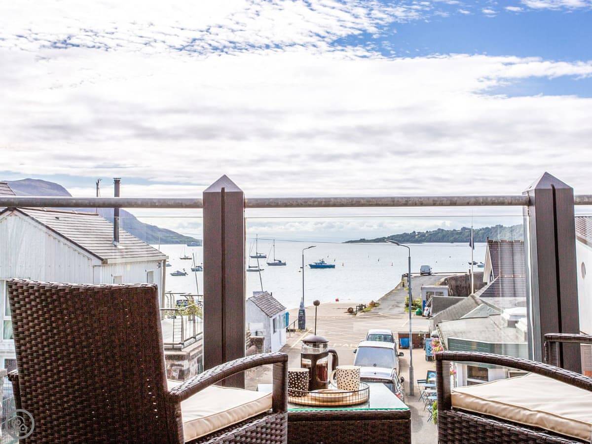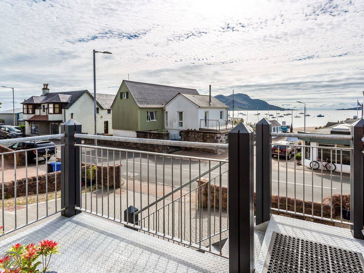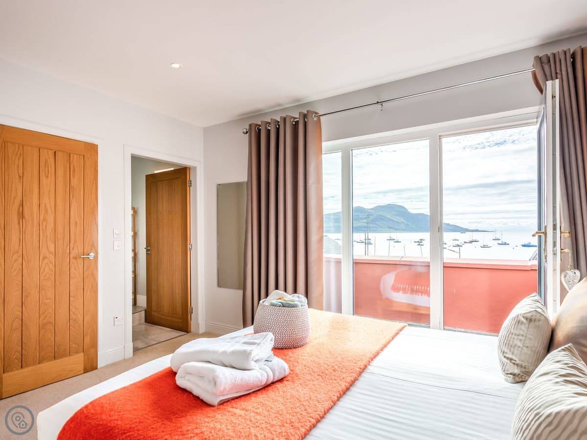 It's got a 5 Star rating. That means it's well looked after and has everything you'd need. The views are the main thing. From the living room balcony and the main bedroom, you look straight out over the pier and Lamlash Bay. You can see Holy Isle. The downstairs bedroom has the same view. You get the morning sun.