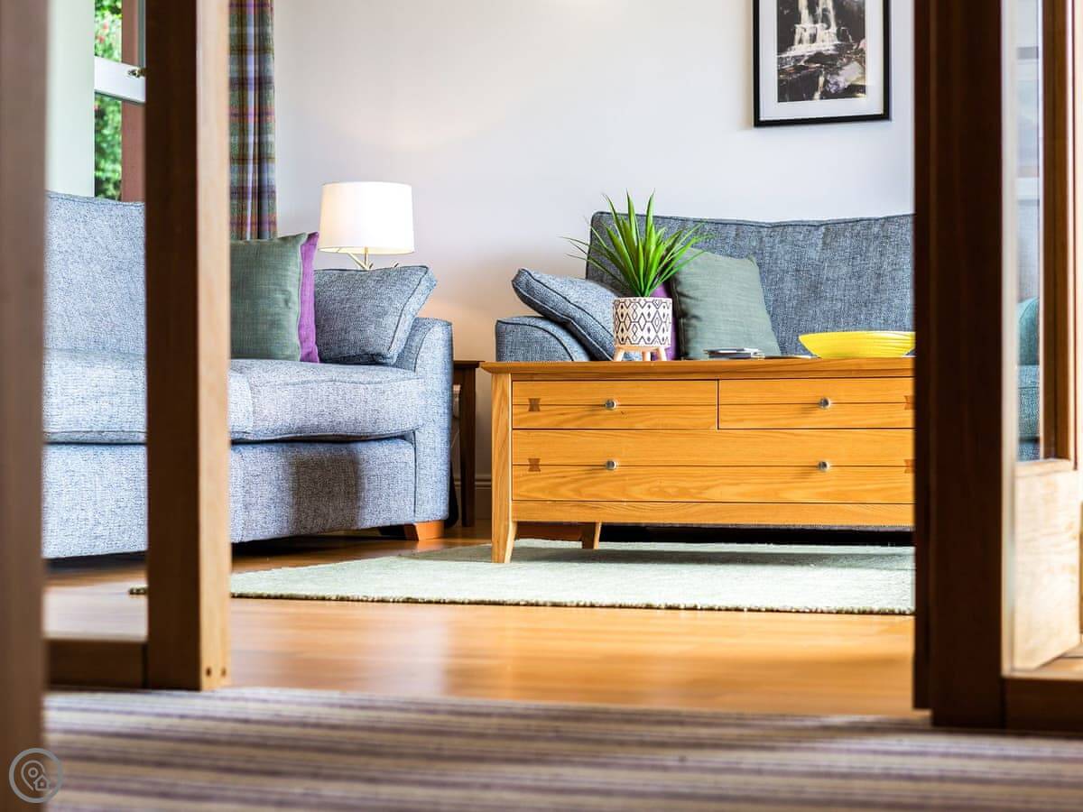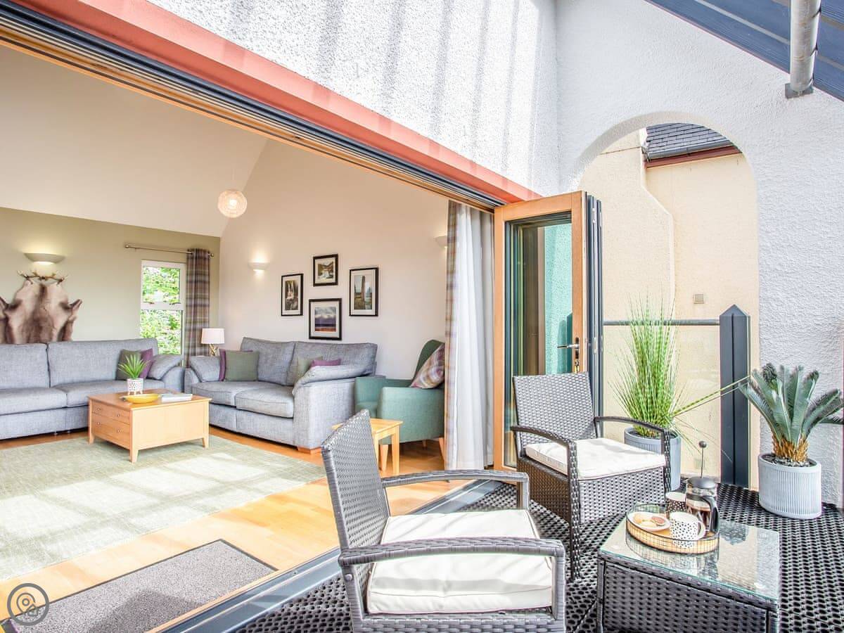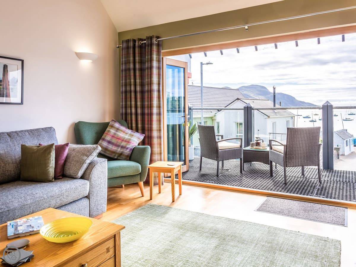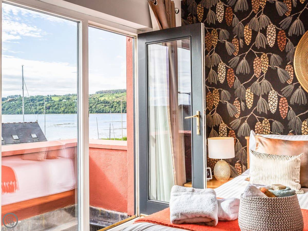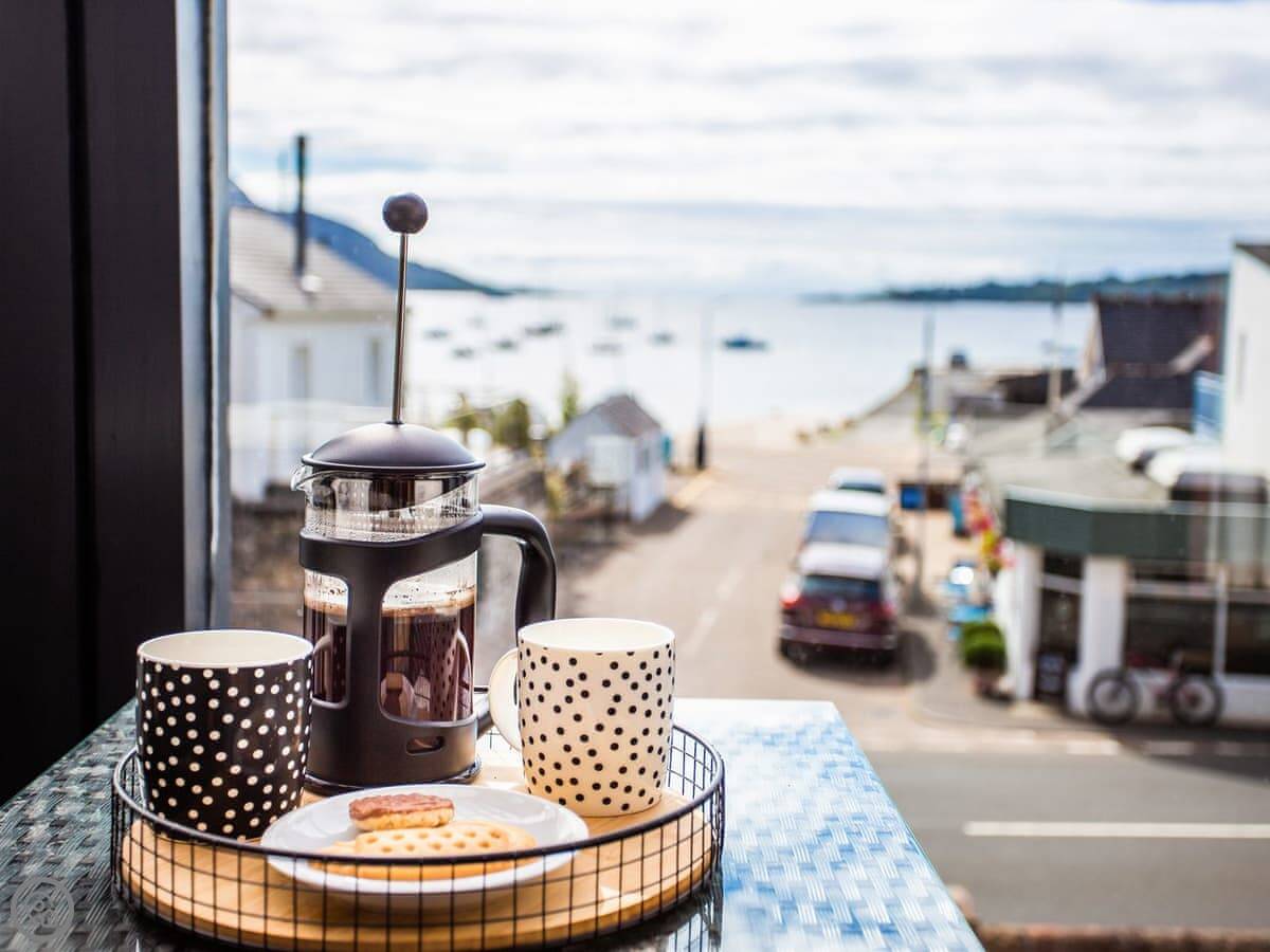 It's got a 5 Star rating. That means it's well looked after and has everything you'd need. The views are the main thing. From the living room balcony and the main bedroom, you look straight out over the pier and Lamlash Bay. You can see Holy Isle. The downstairs bedroom has the same view. You get the morning sun.