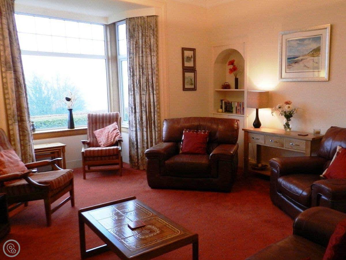 Goatfell View is a ground floor flat in Brodick, on the island of Arran. It's part of a larger house, but it's self-contained and you have your own entrance and garden area. The main thing is the view. You look straight out over the water towards Goatfell mountain. You can see it from the living room and one of the bedrooms.
