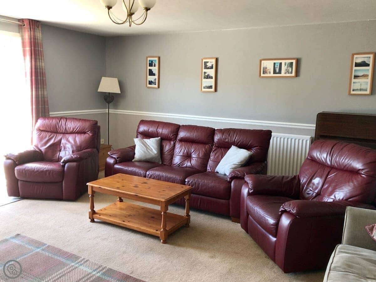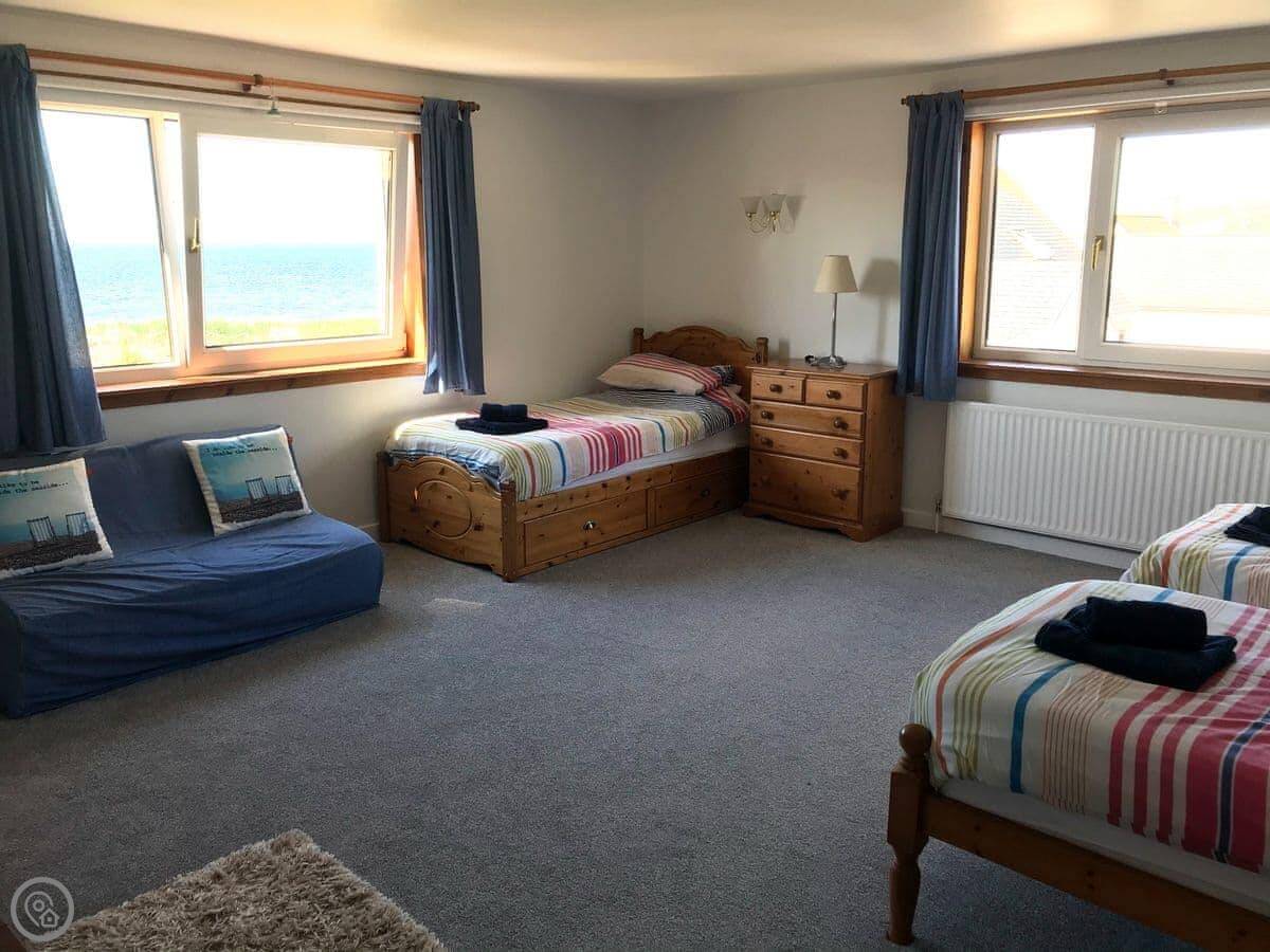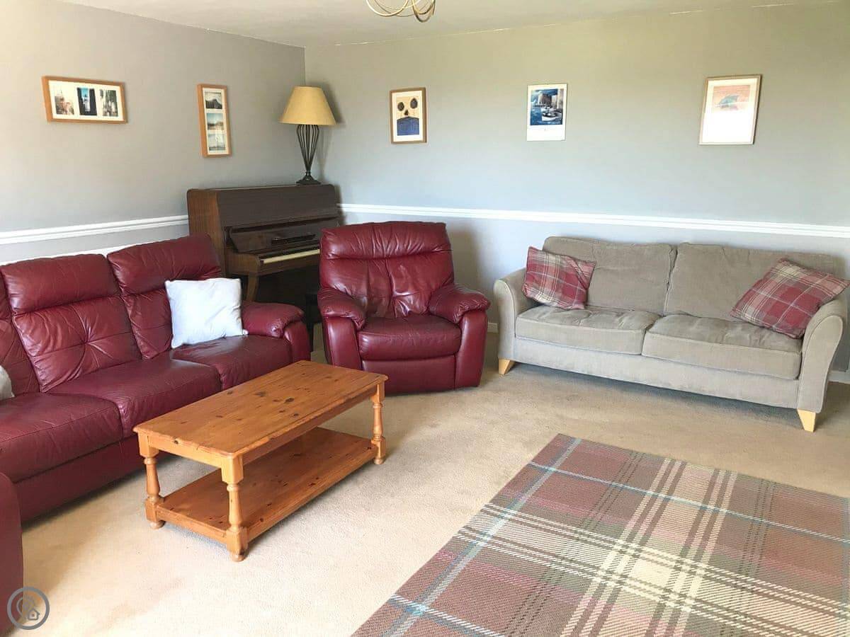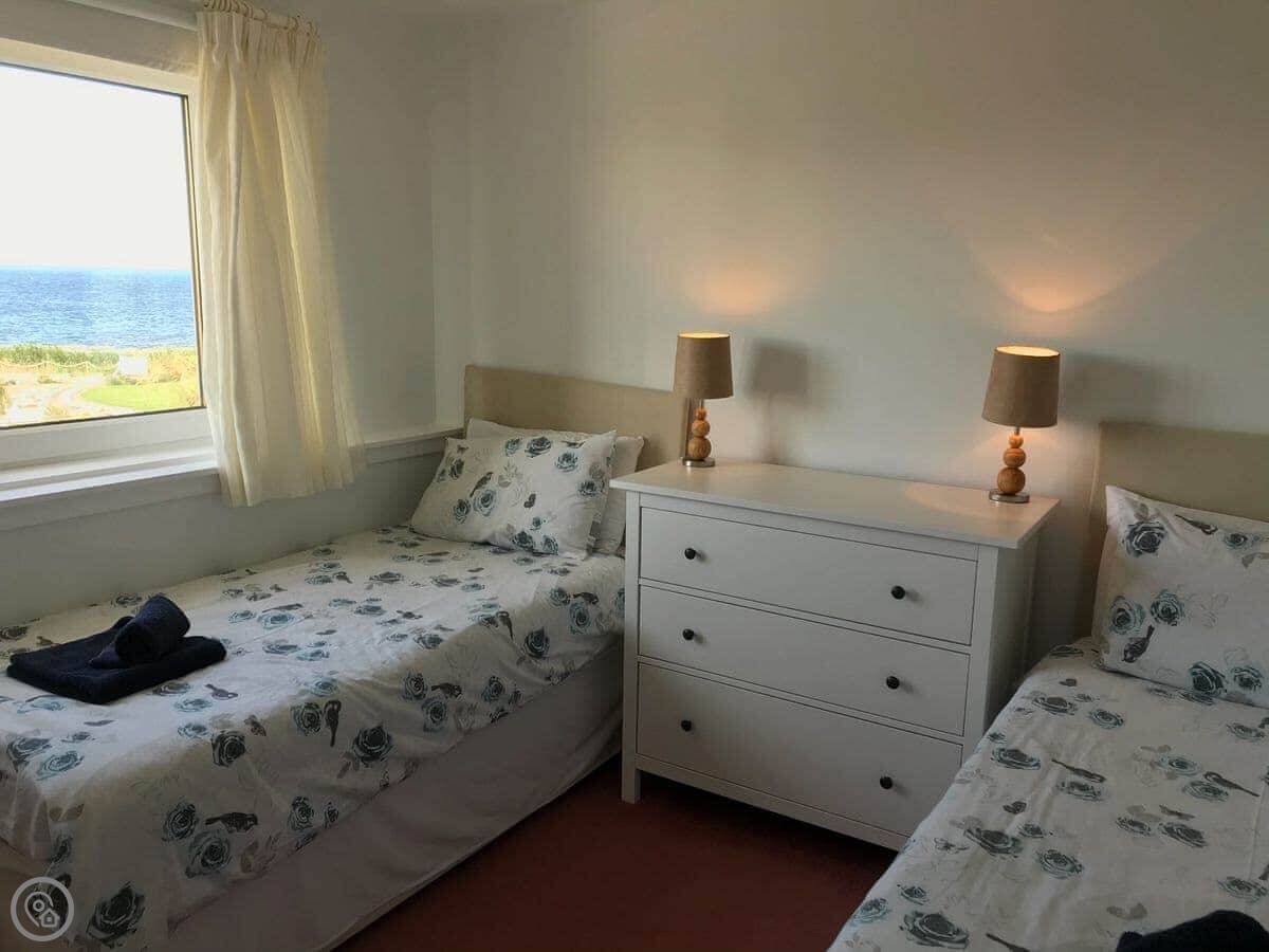 The main thing is the view. Every main room looks straight out to sea, over the Firth of Clyde. You can see Pladda and Ailsa Craig from the windows. You can lie in bed and look at it. There are patio doors from the living room and one of the bedrooms.